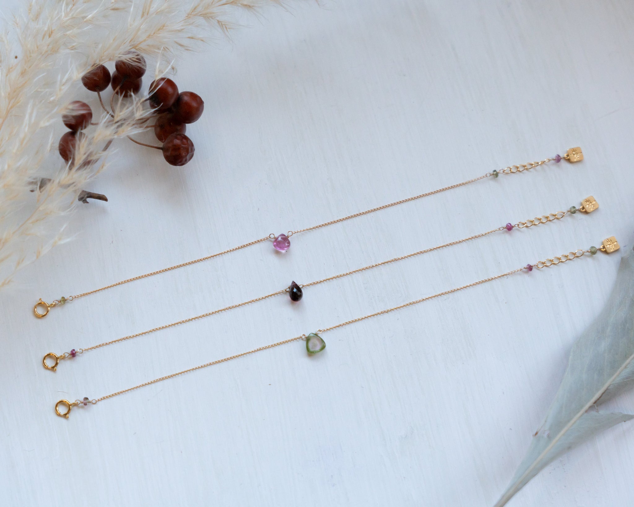 こちらのブレスレットには、『ウォーターメロントルマリン』を選びました。その名の通り「スイカ」のように外側が緑色、内側がピンク色になっている、とてもユニークなトルマリンです。