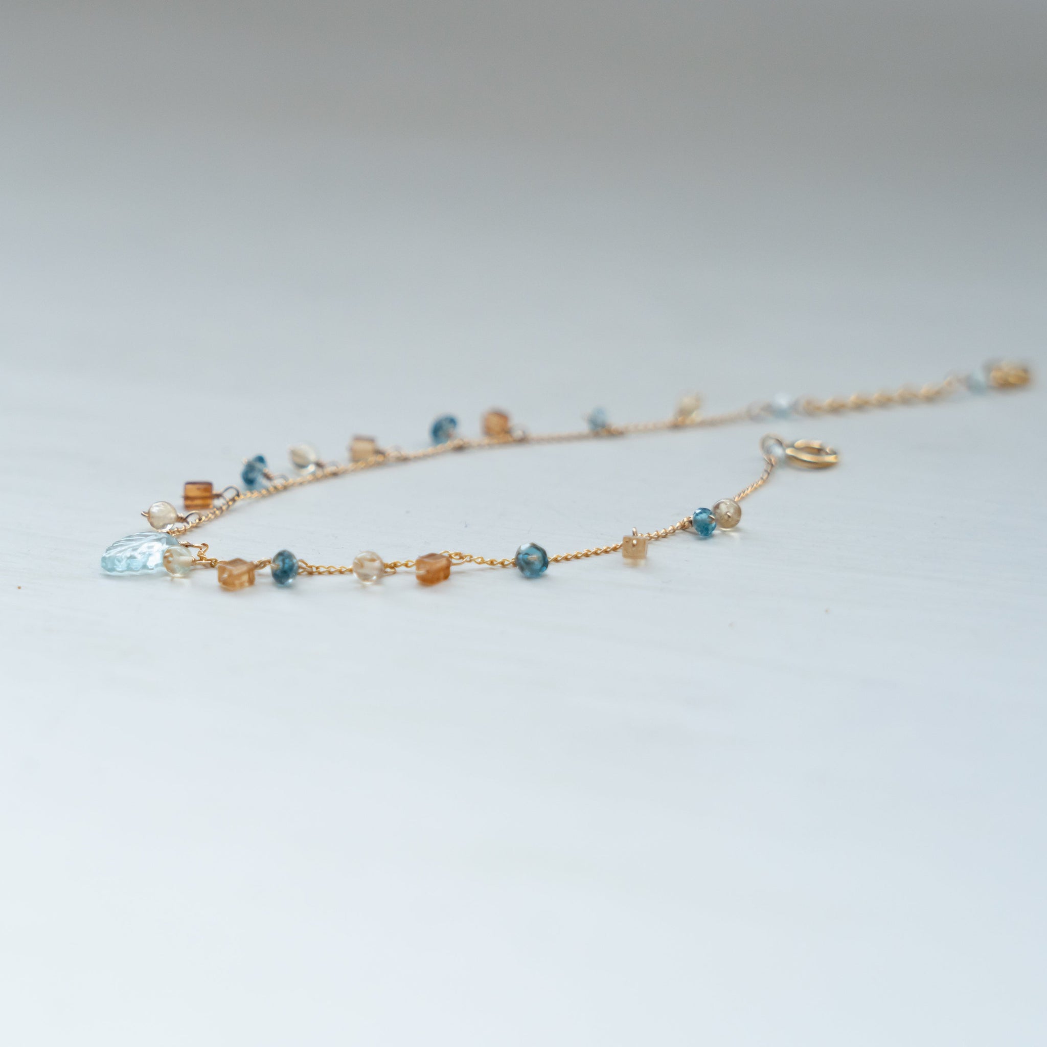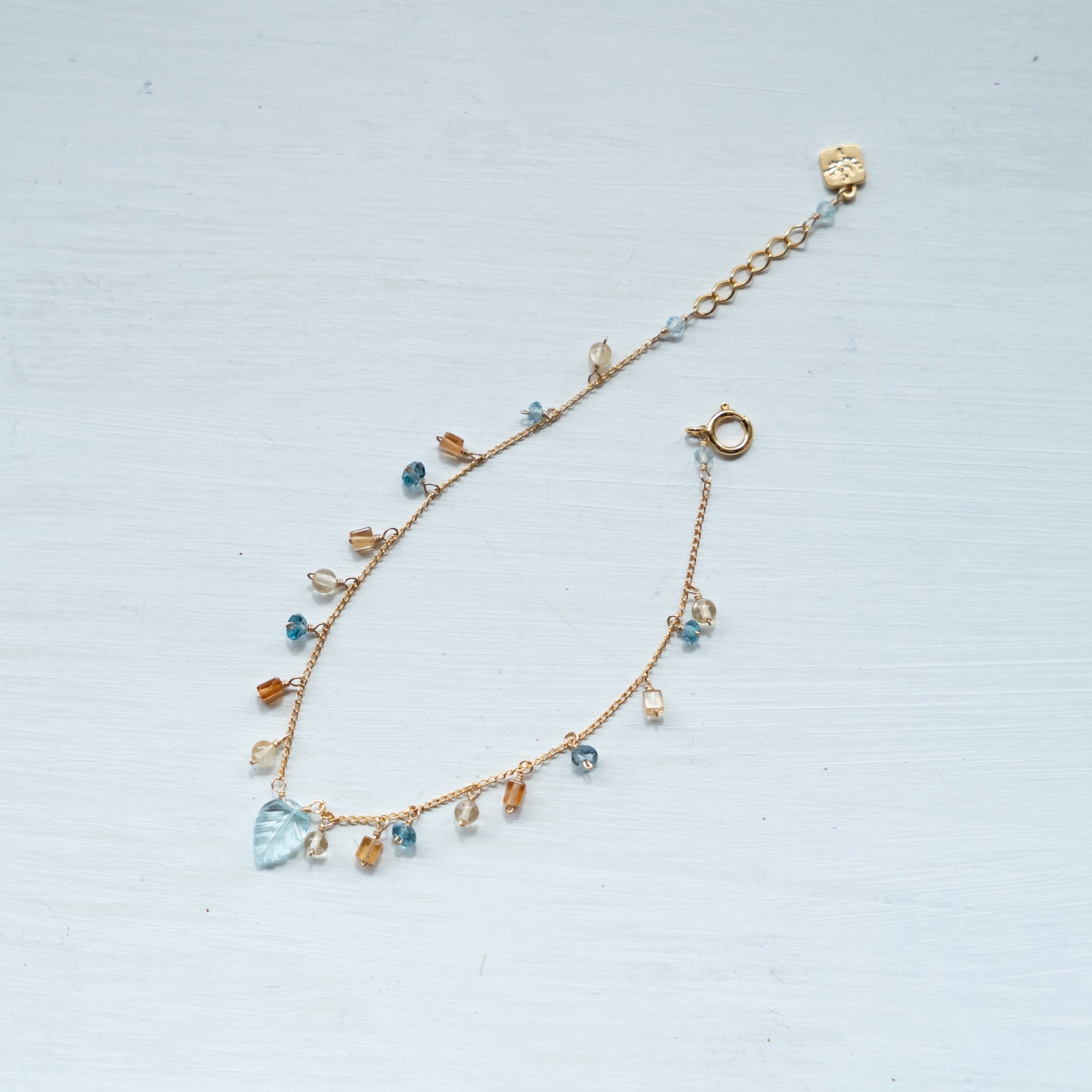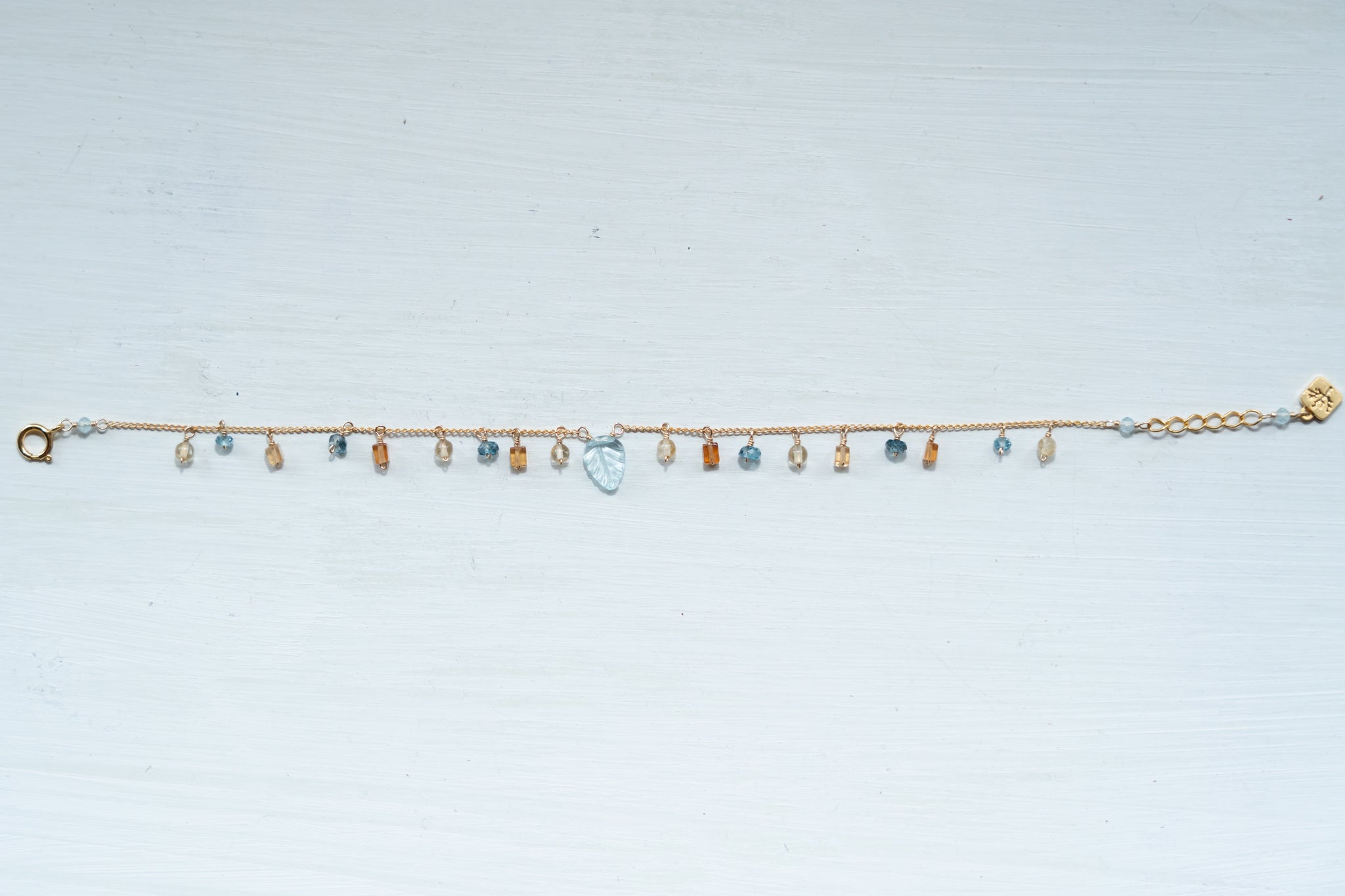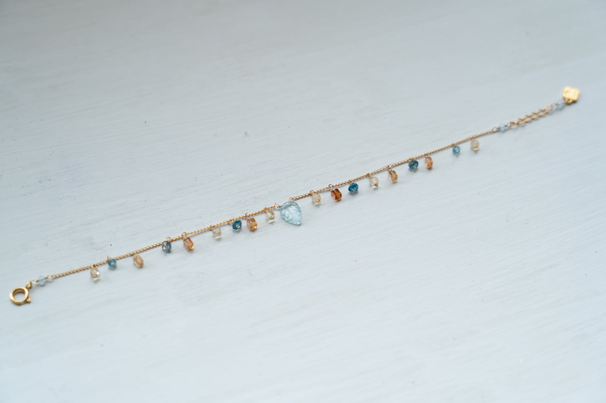 リーフカットのブルートパーズをメインに、カラーやカット、ランダムに繋いだ粒々の揺れを楽しんでいただけるブレスレットに仕上げました。