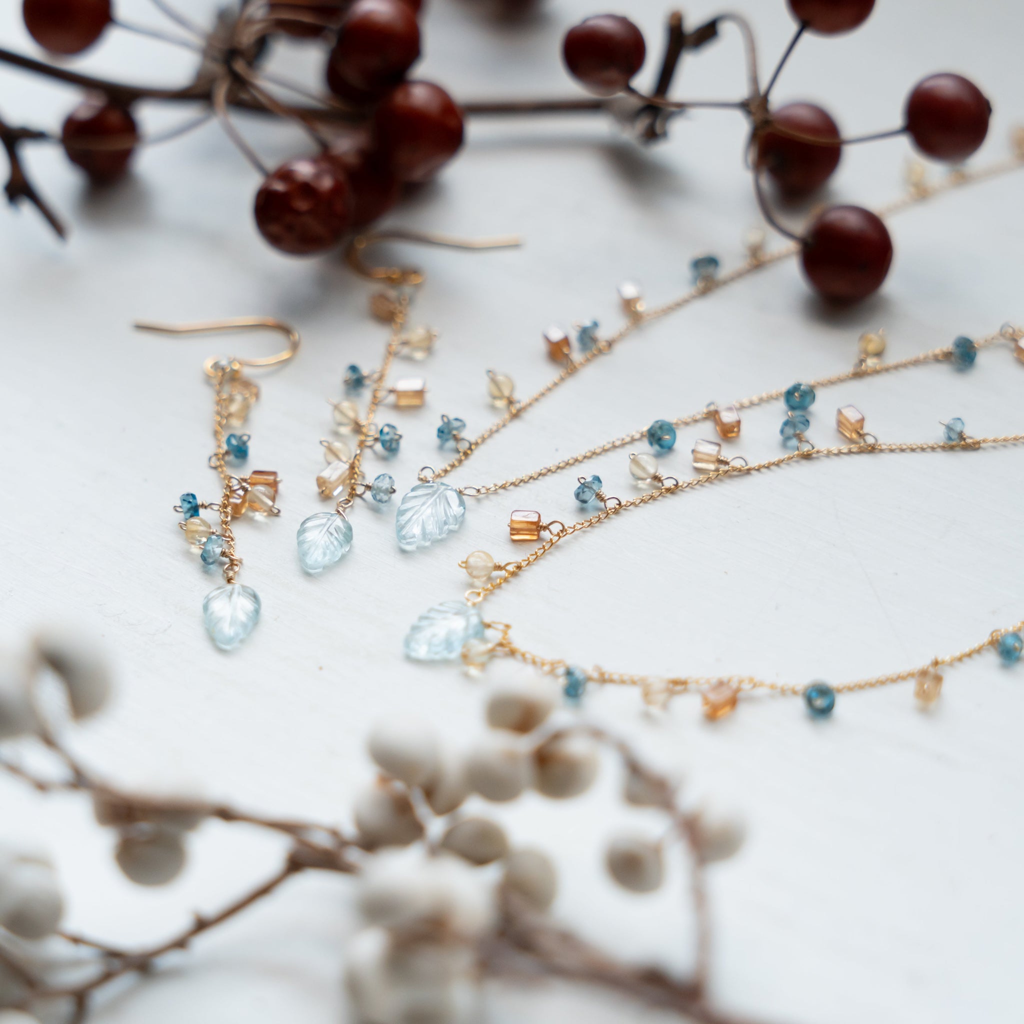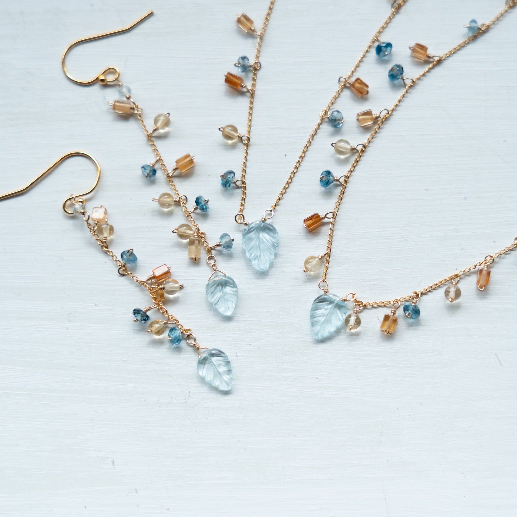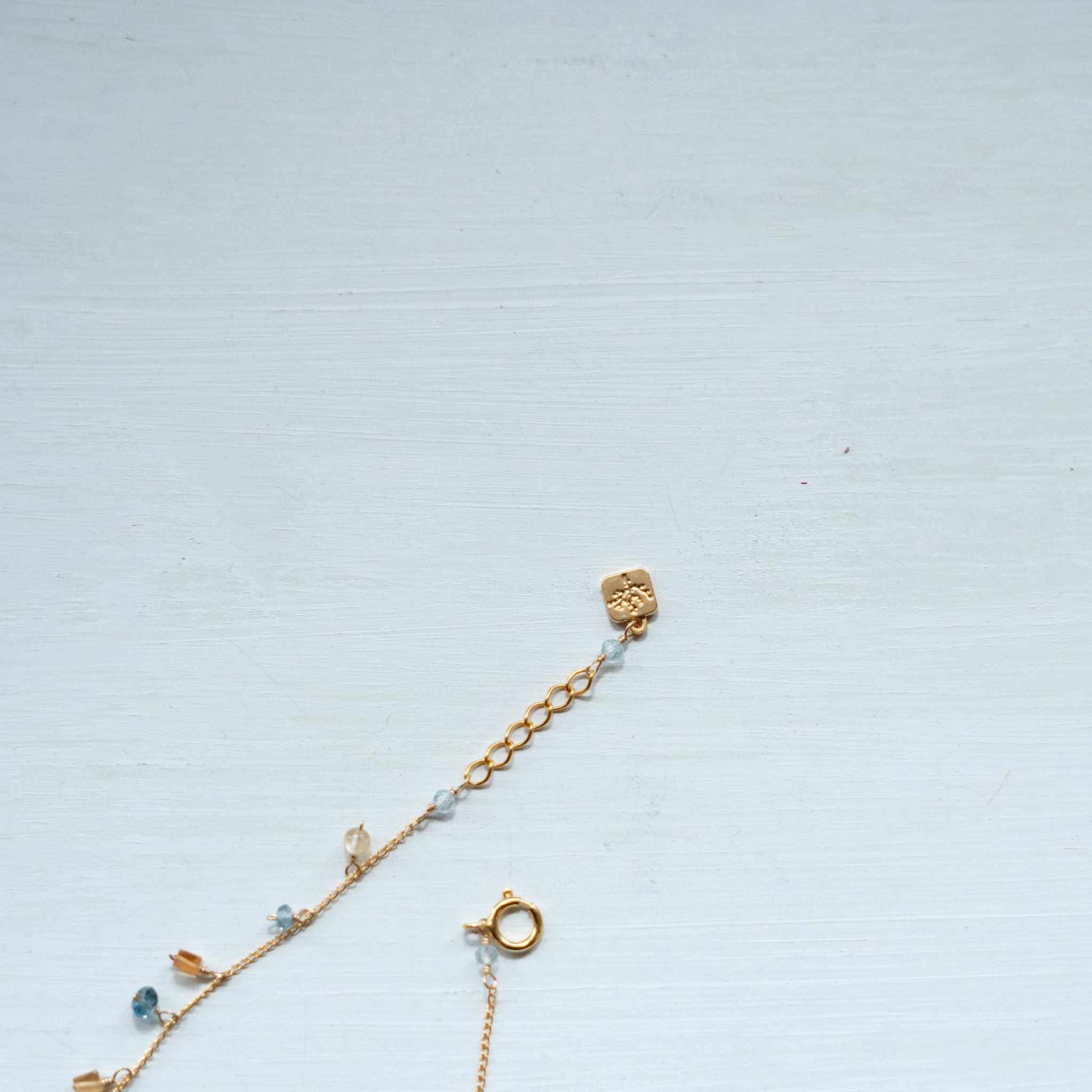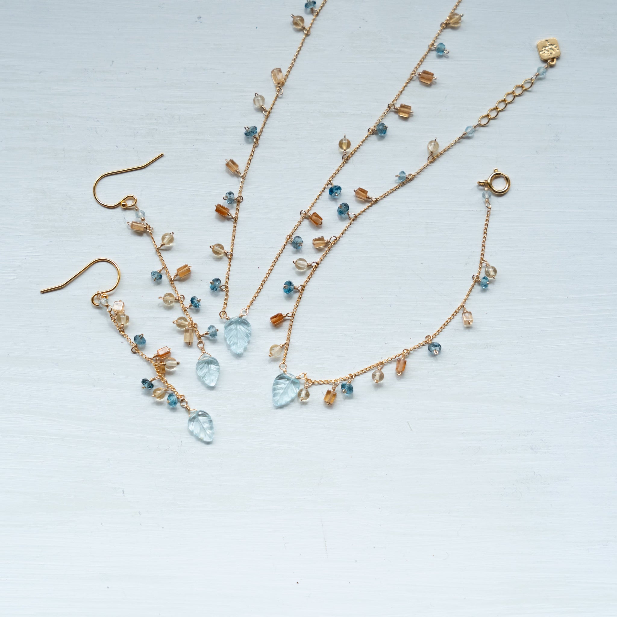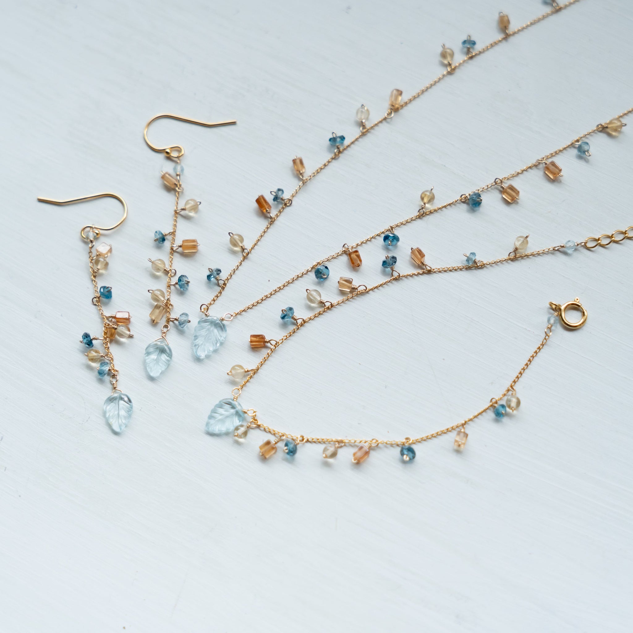 リーフカットのブルートパーズをメインに、カラーやカット、ランダムに繋いだ粒々の揺れを楽しんでいただけるブレスレットに仕上げました。