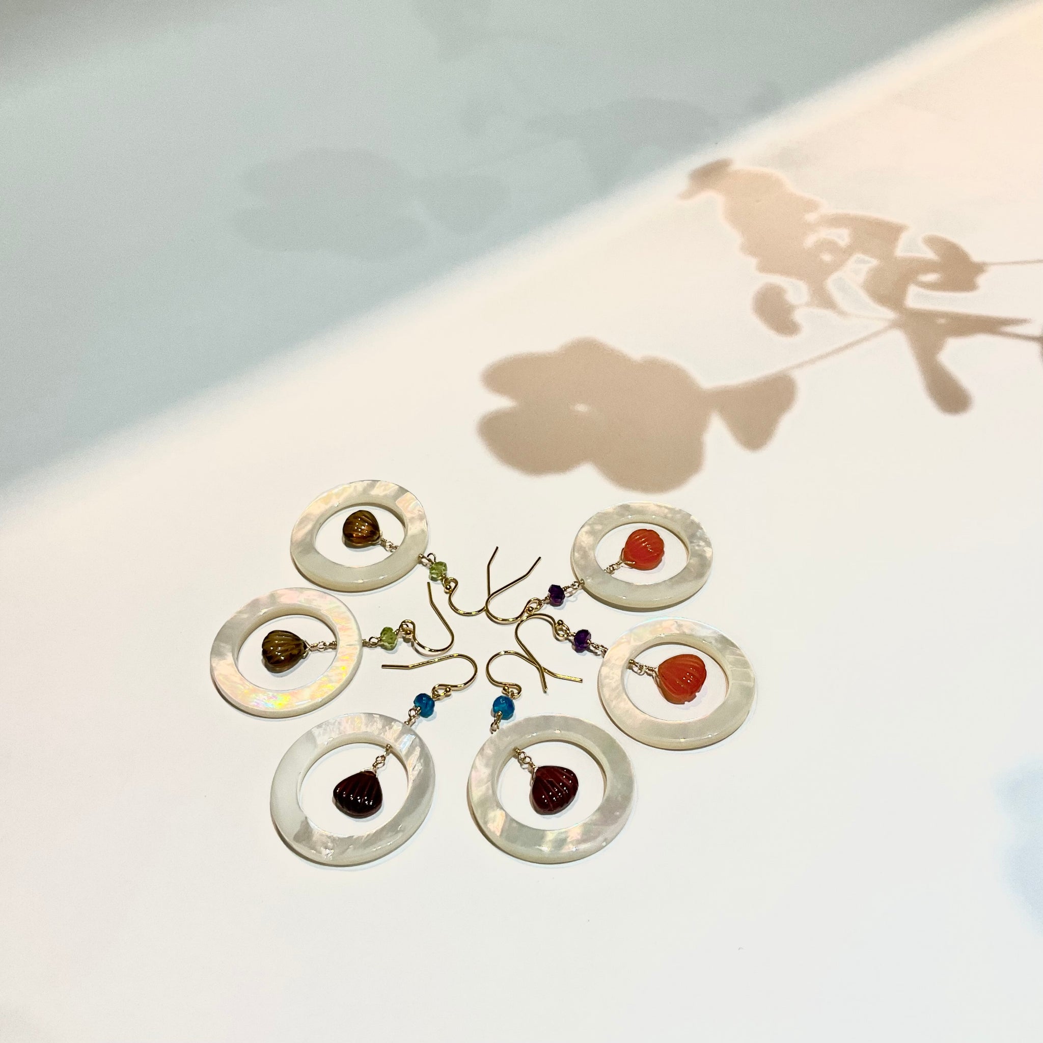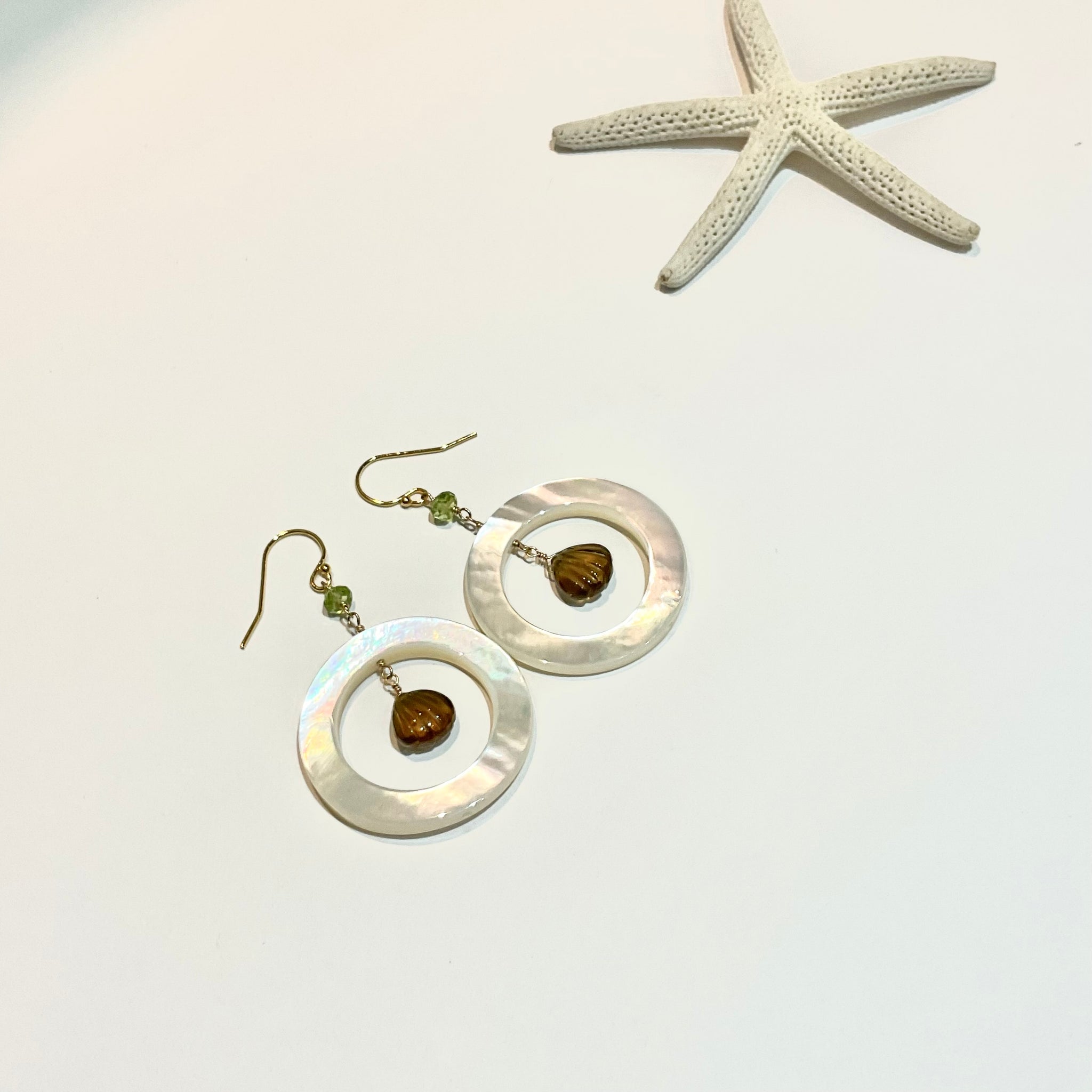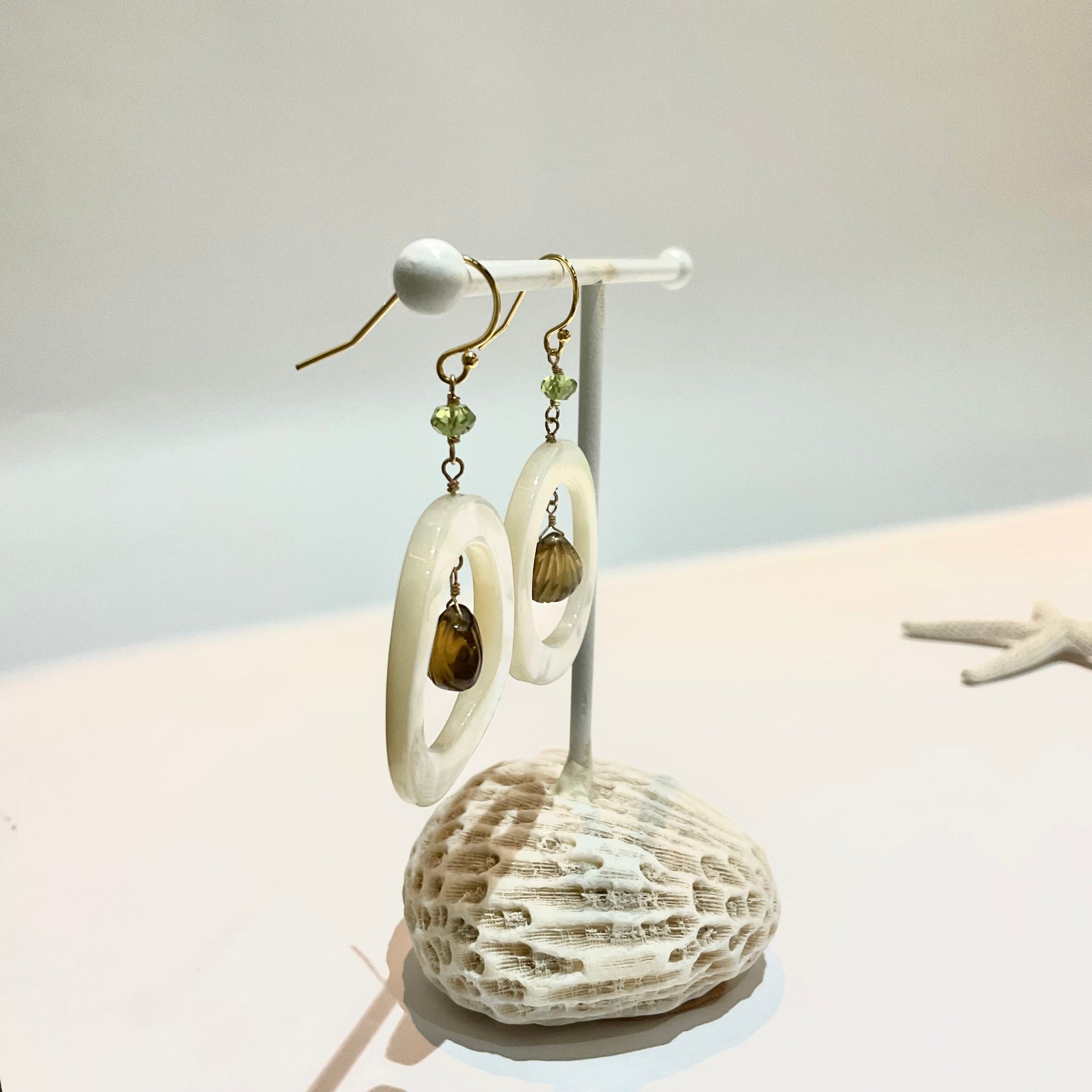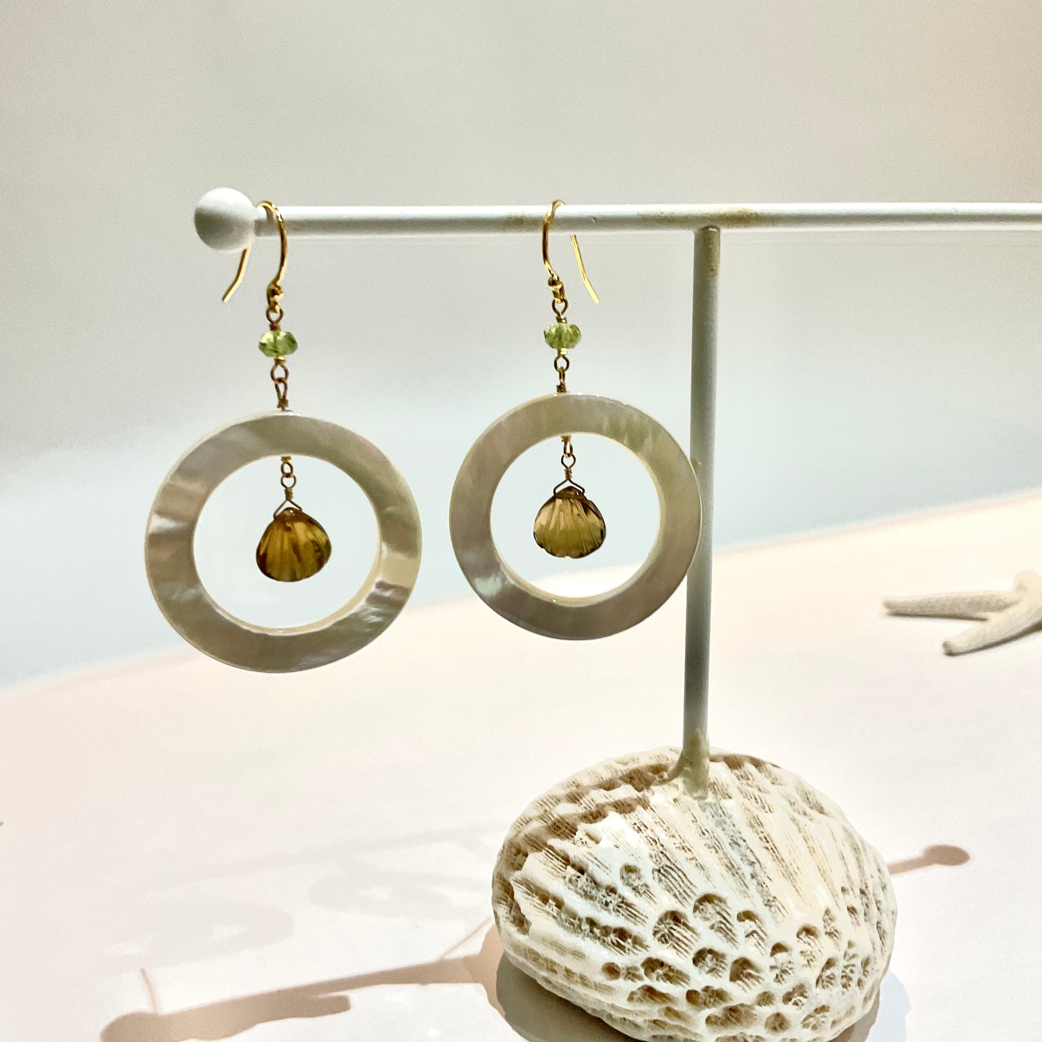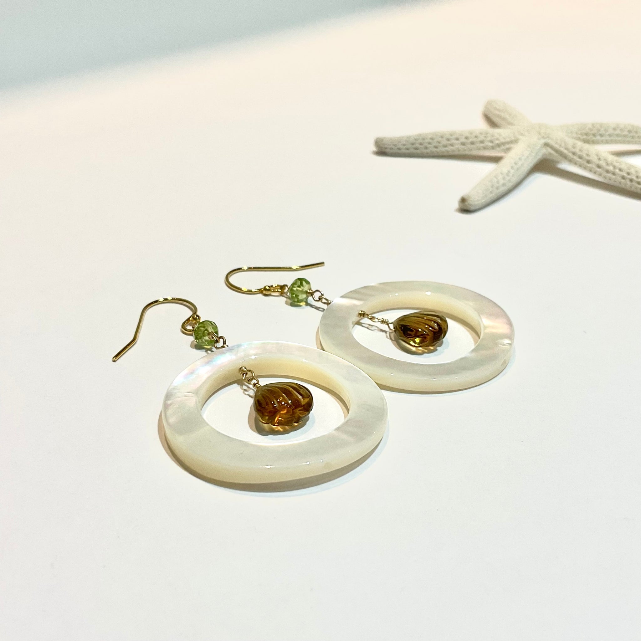 ドーナツ型の白蝶貝の中でシェル型の天然石が揺れる、ボリュームのあるピアスです。