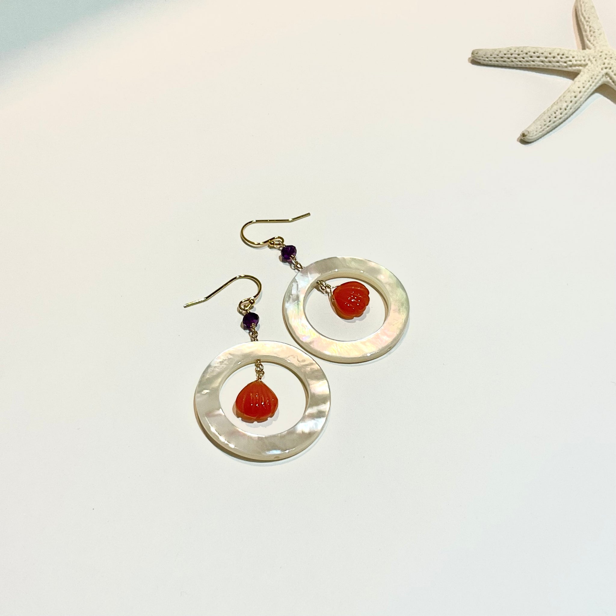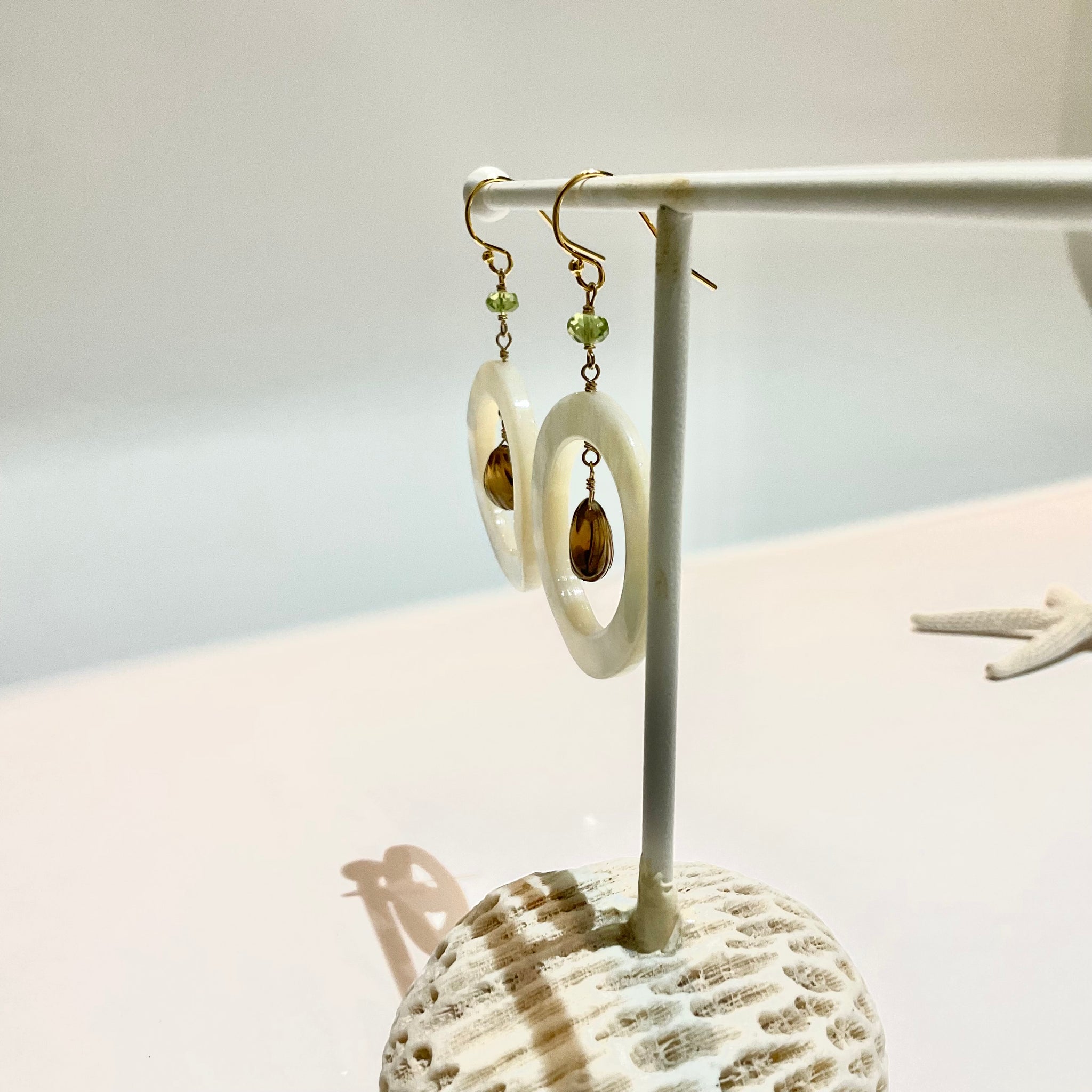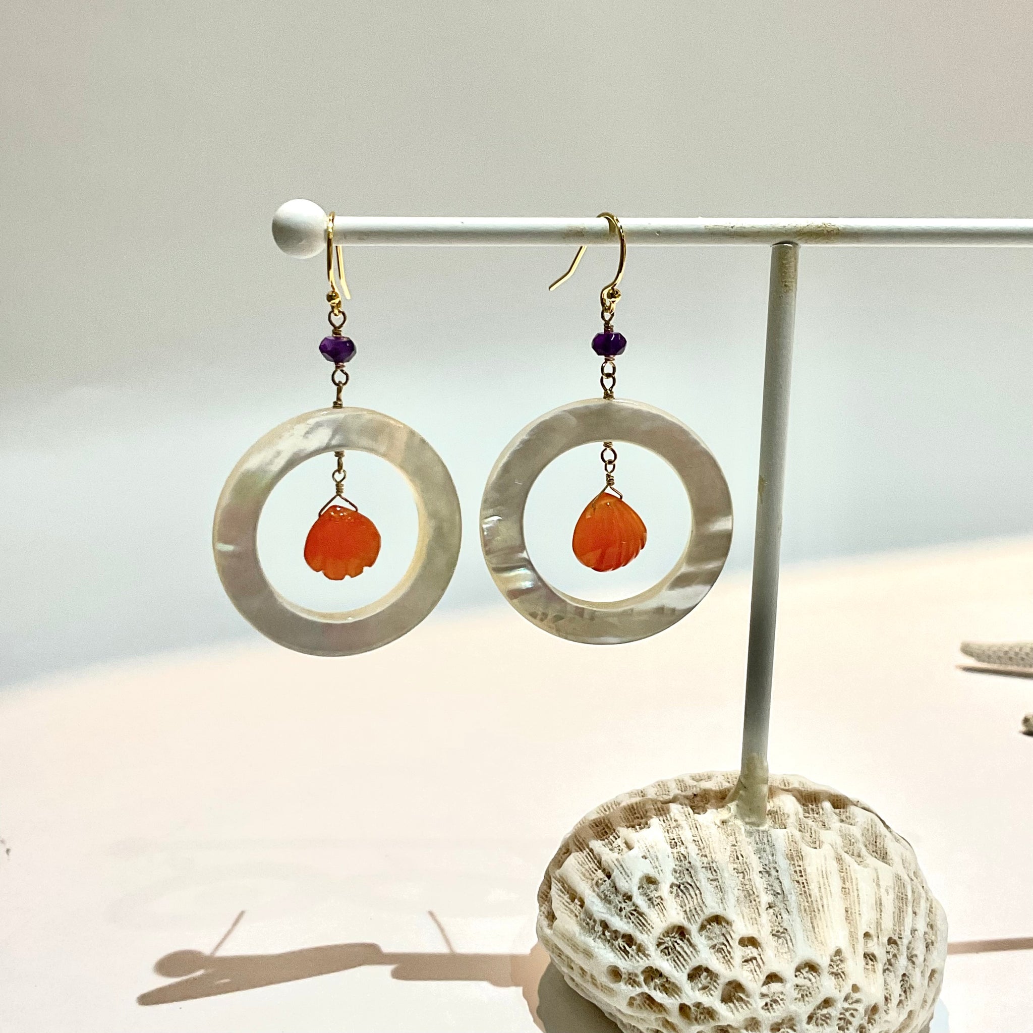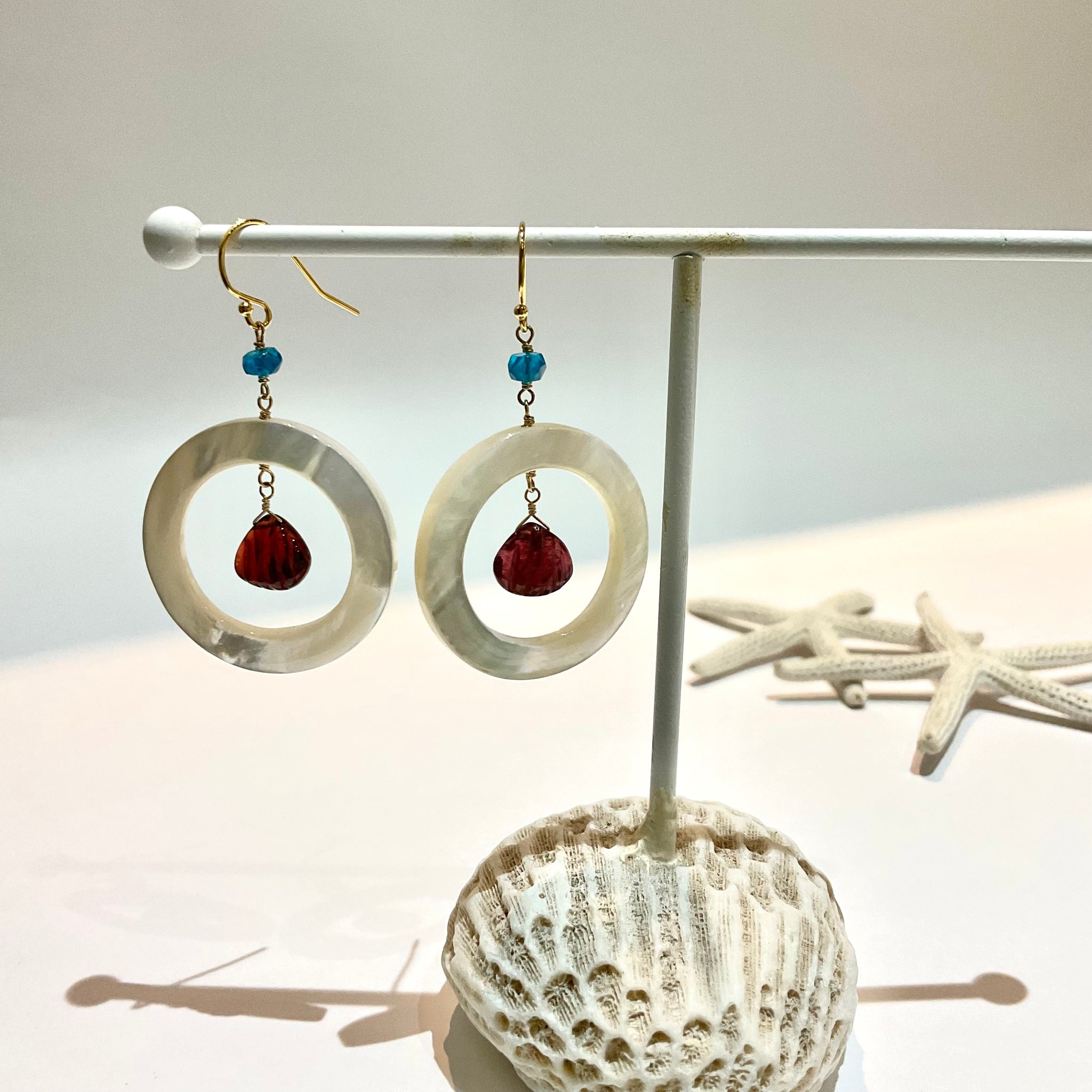 ドーナツ型の白蝶貝の中でシェル型の天然石が揺れる、ボリュームのあるピアスです。