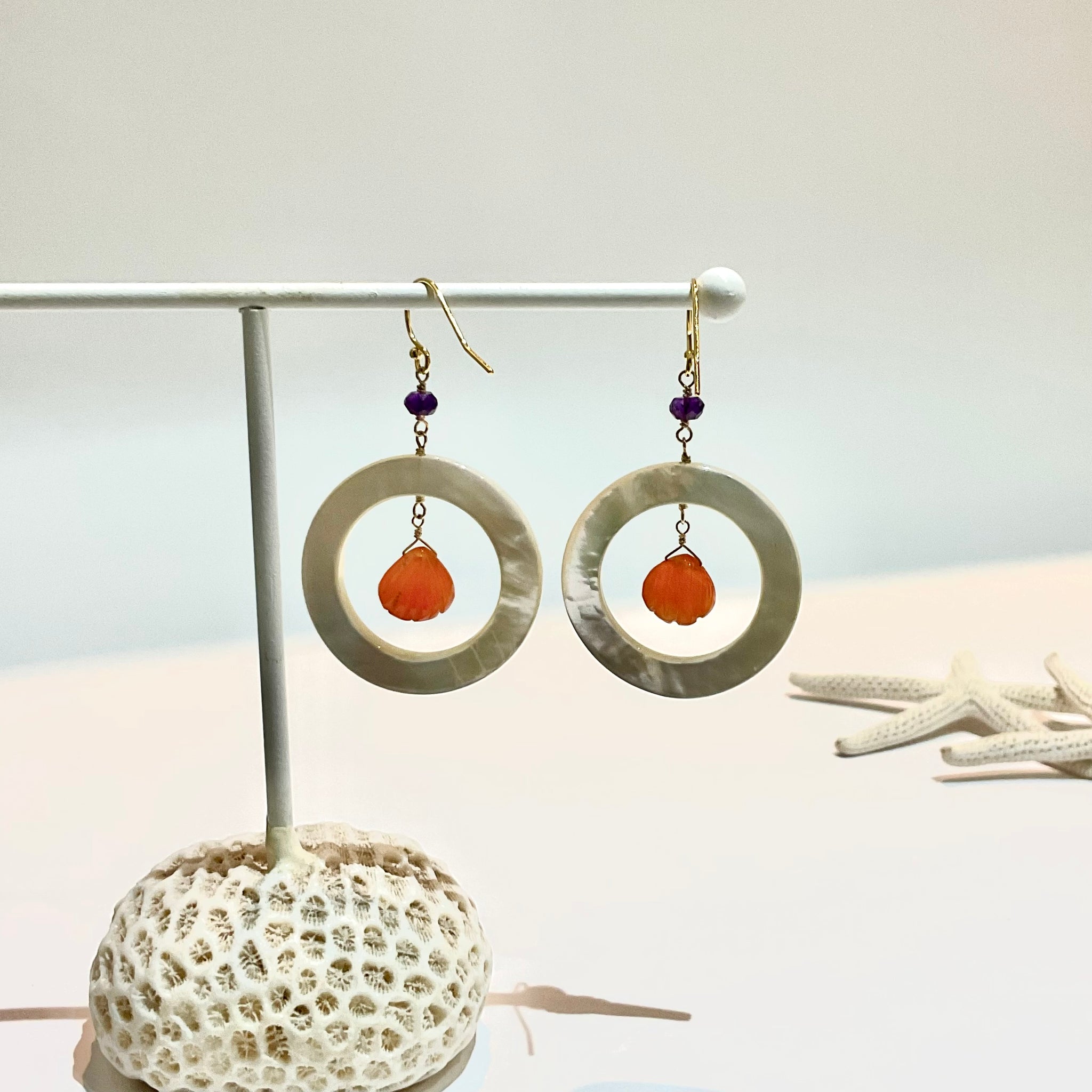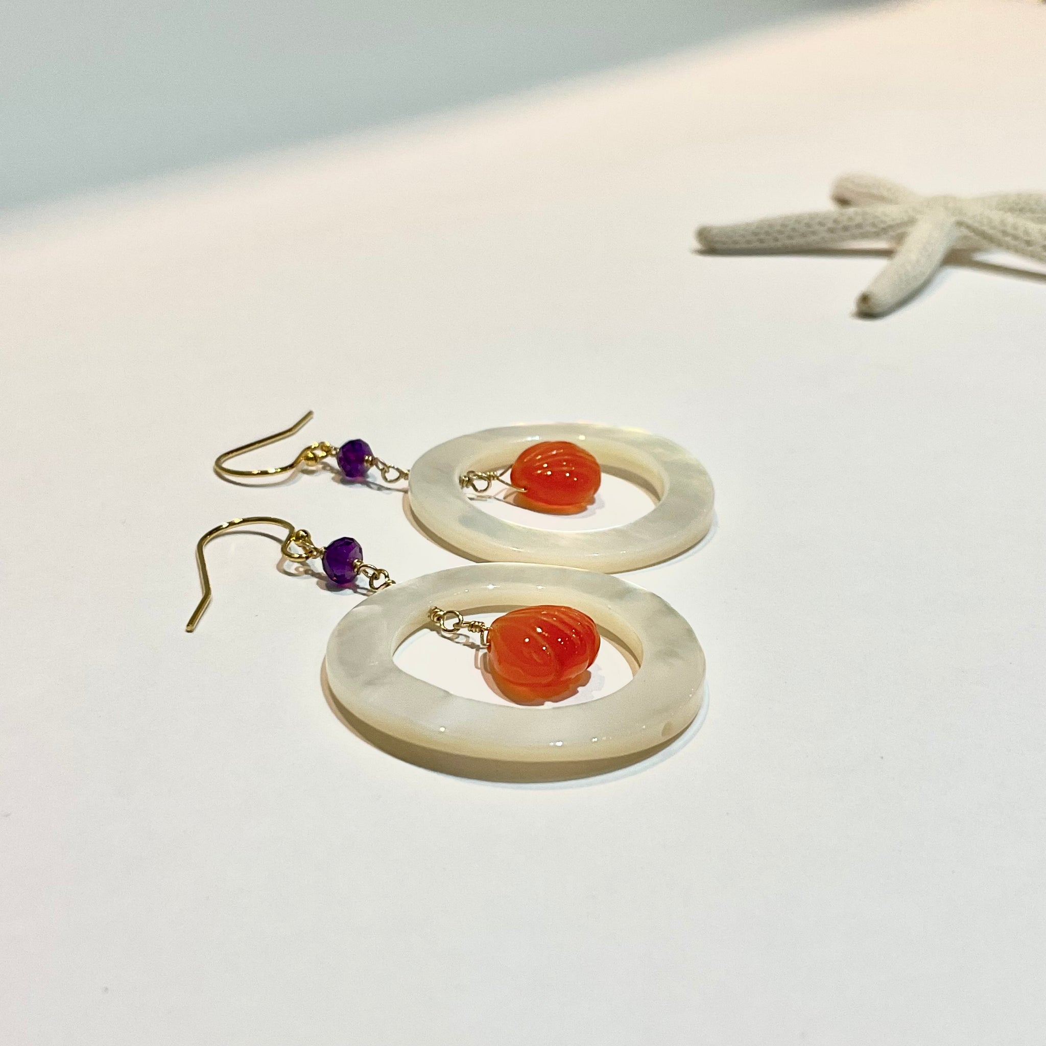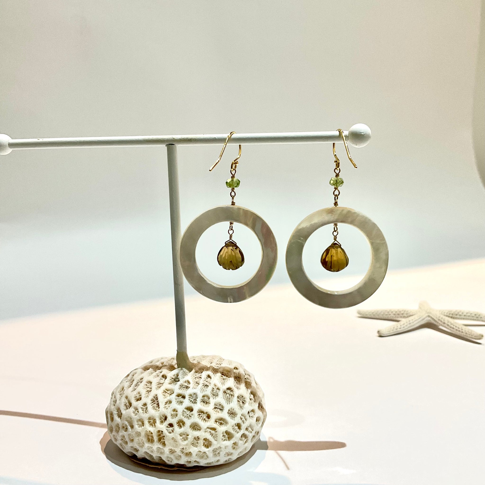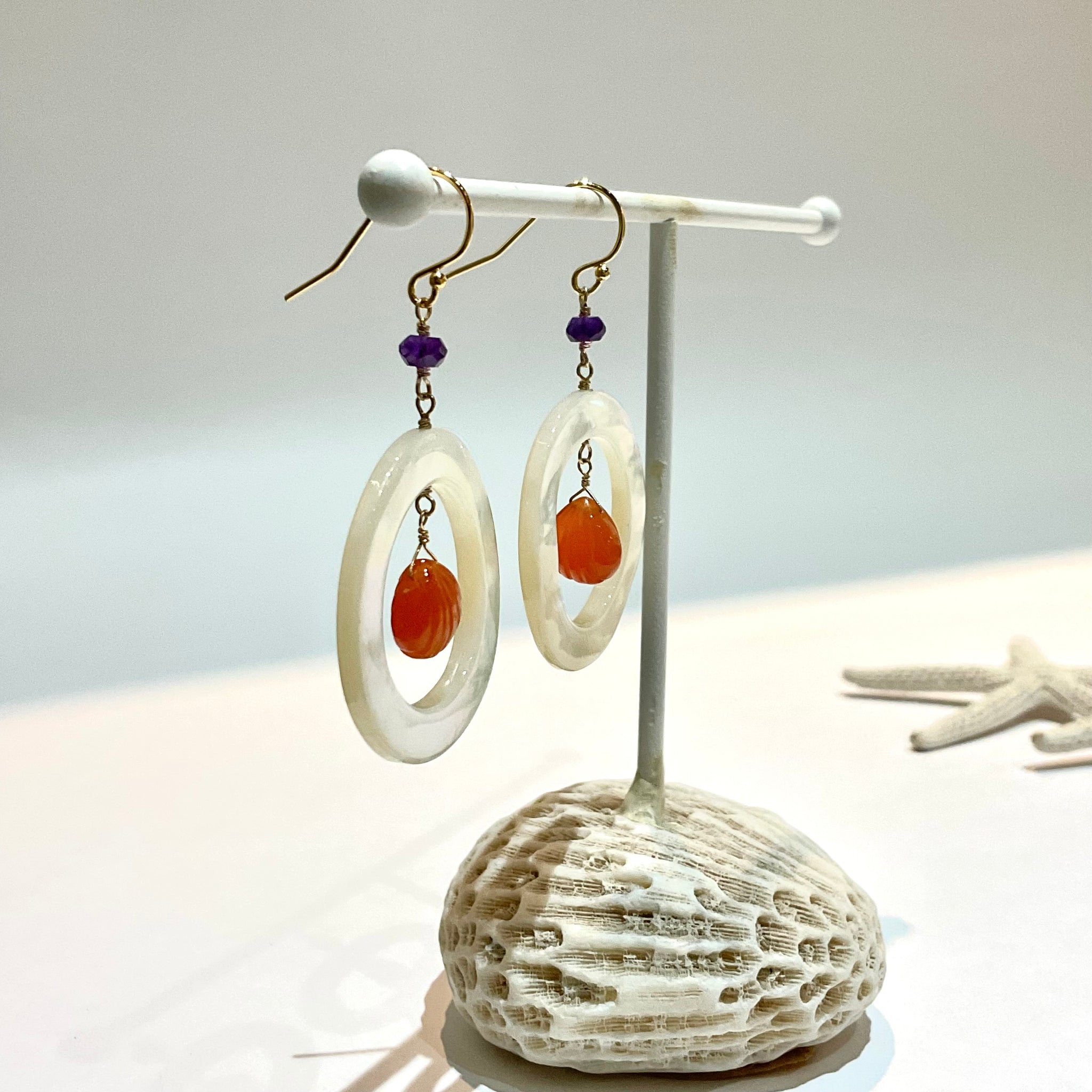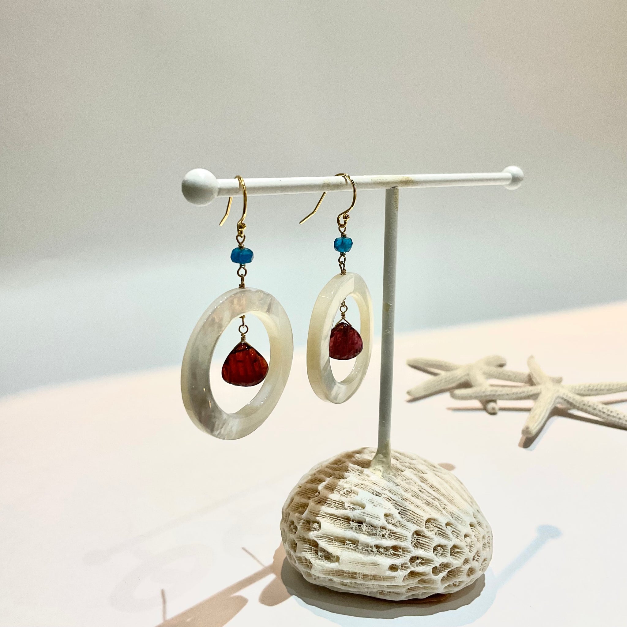 ドーナツ型の白蝶貝の中でシェル型の天然石が揺れる、ボリュームのあるピアスです。