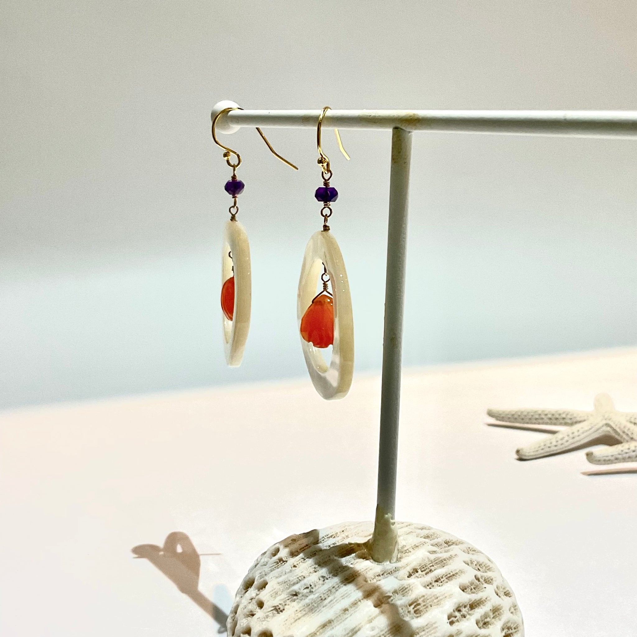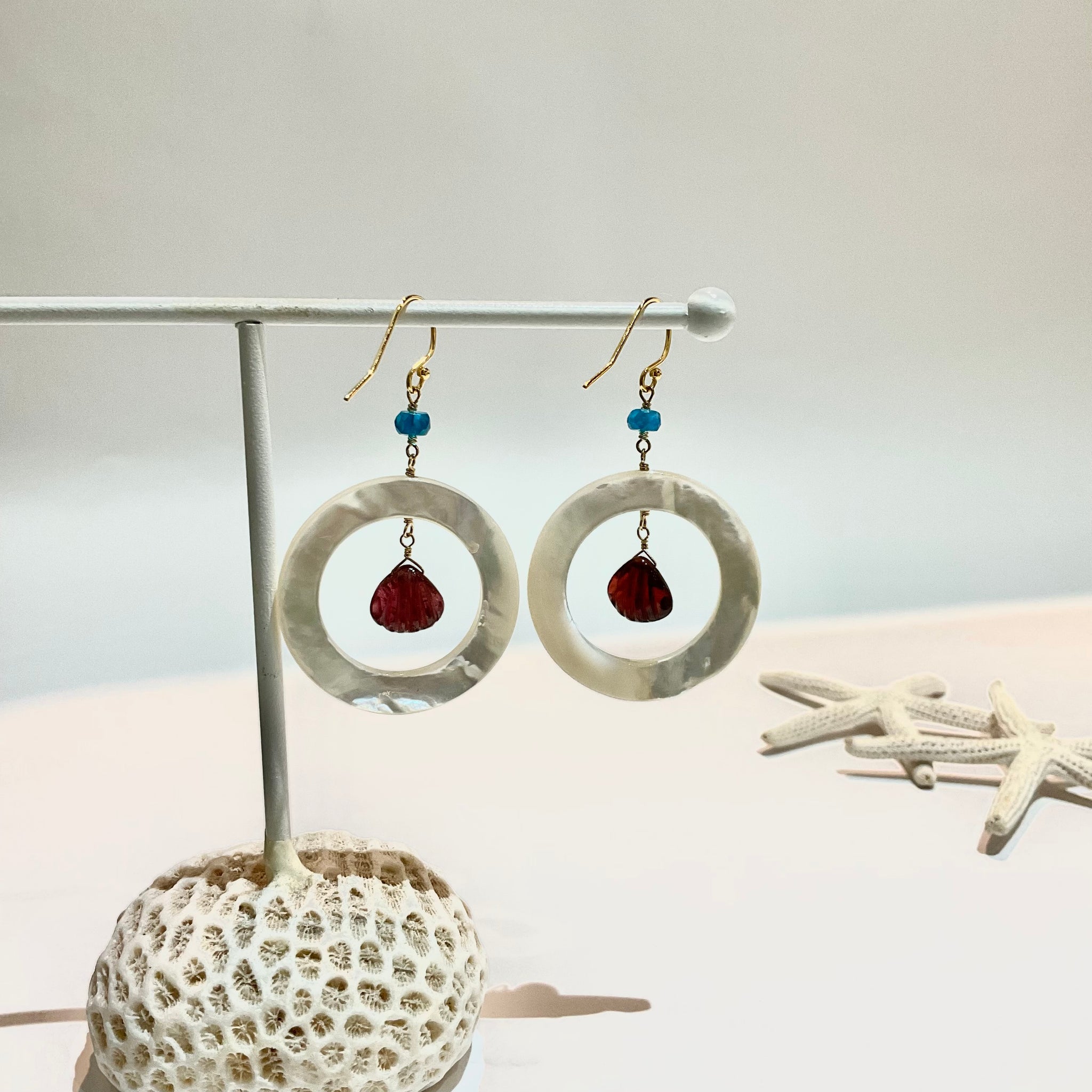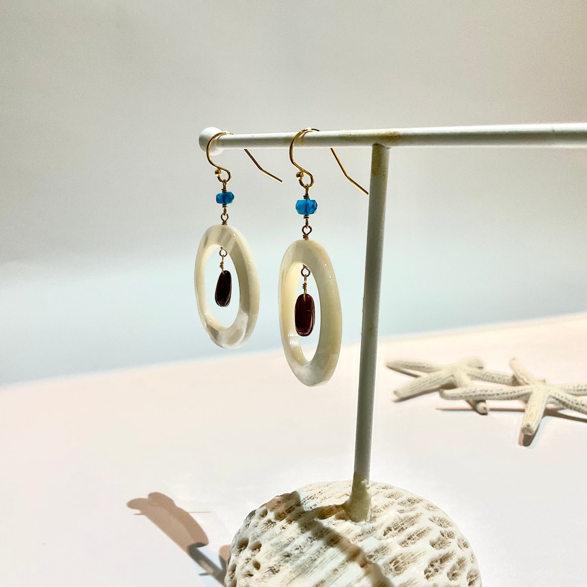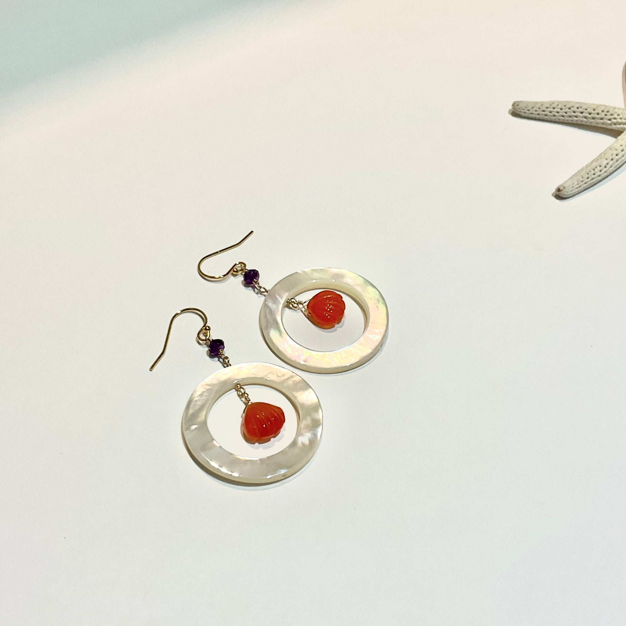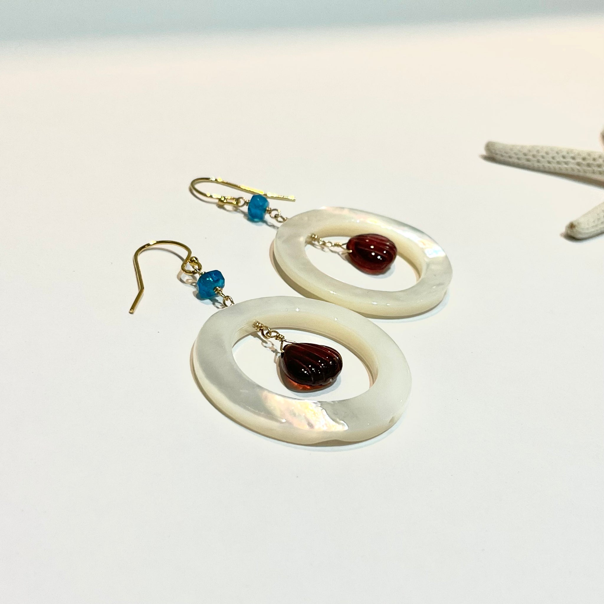 ドーナツ型の白蝶貝の中でシェル型の天然石が揺れる、ボリュームのあるピアスです。