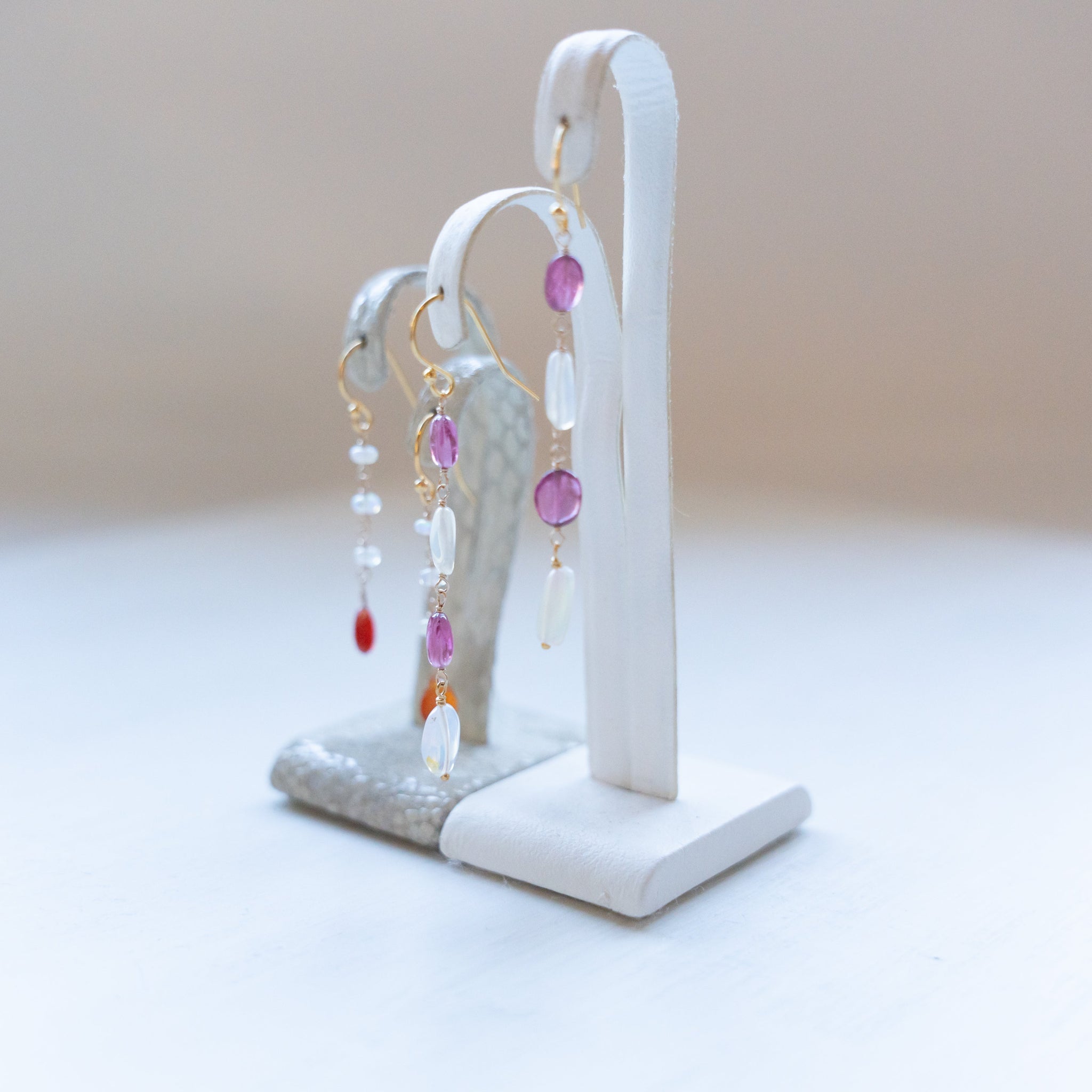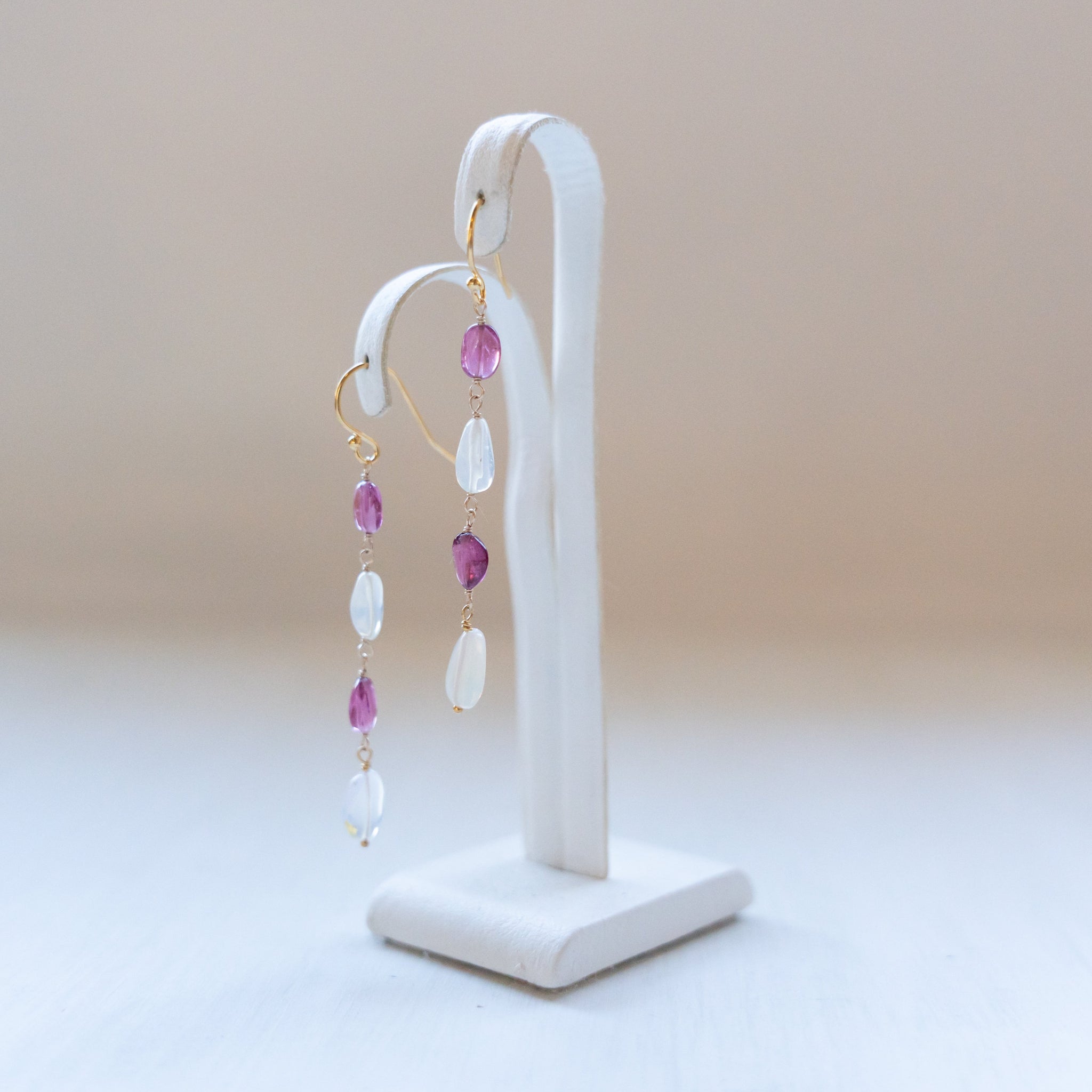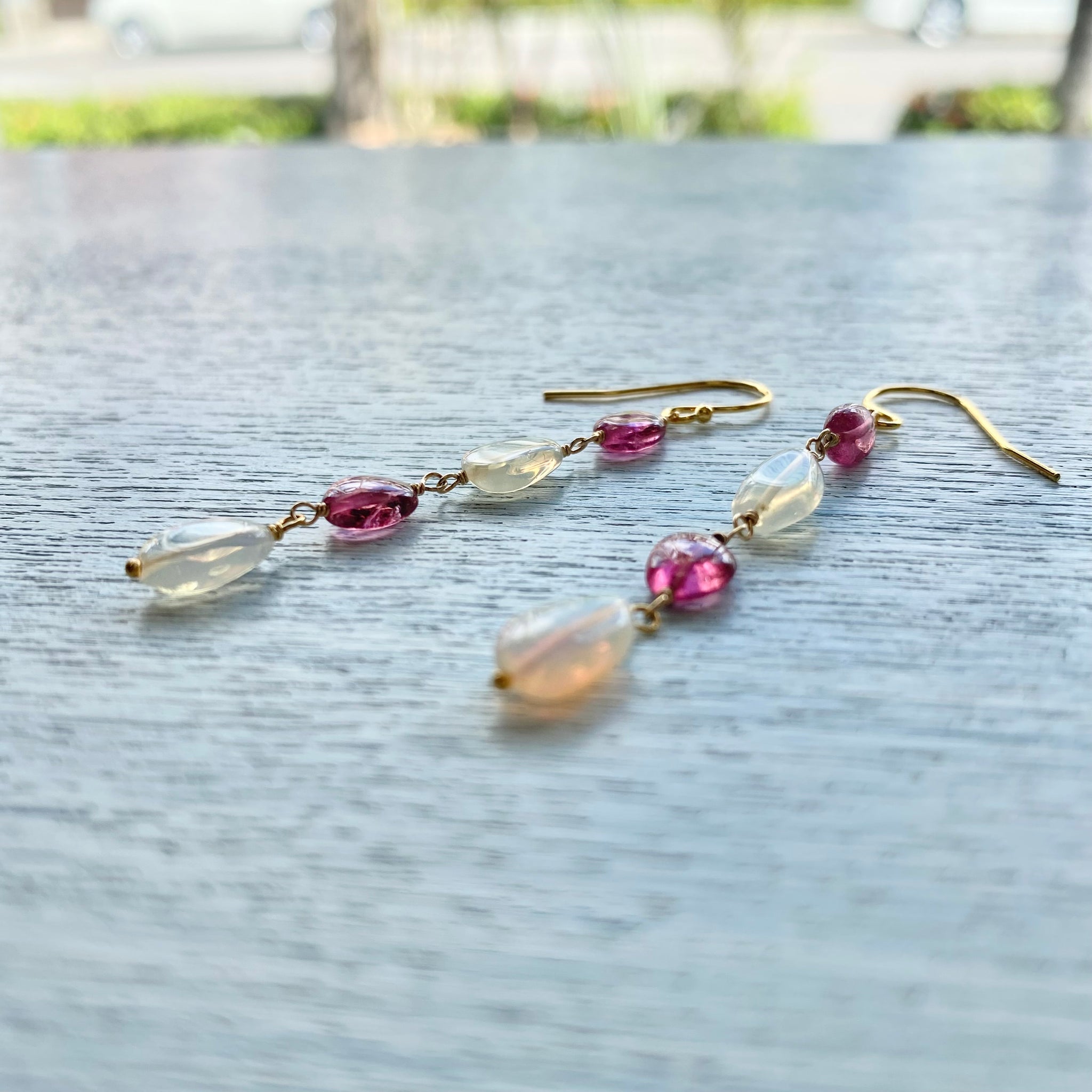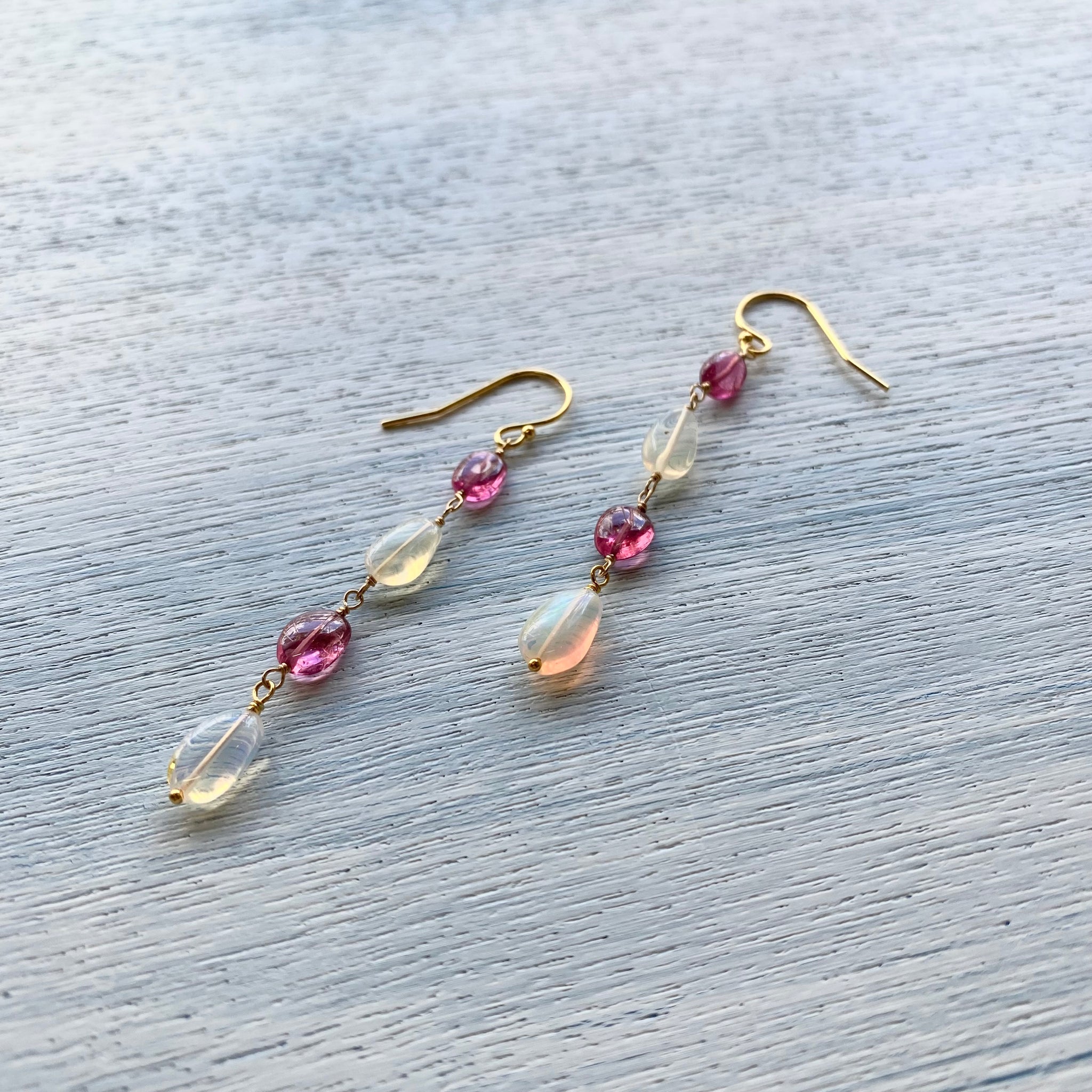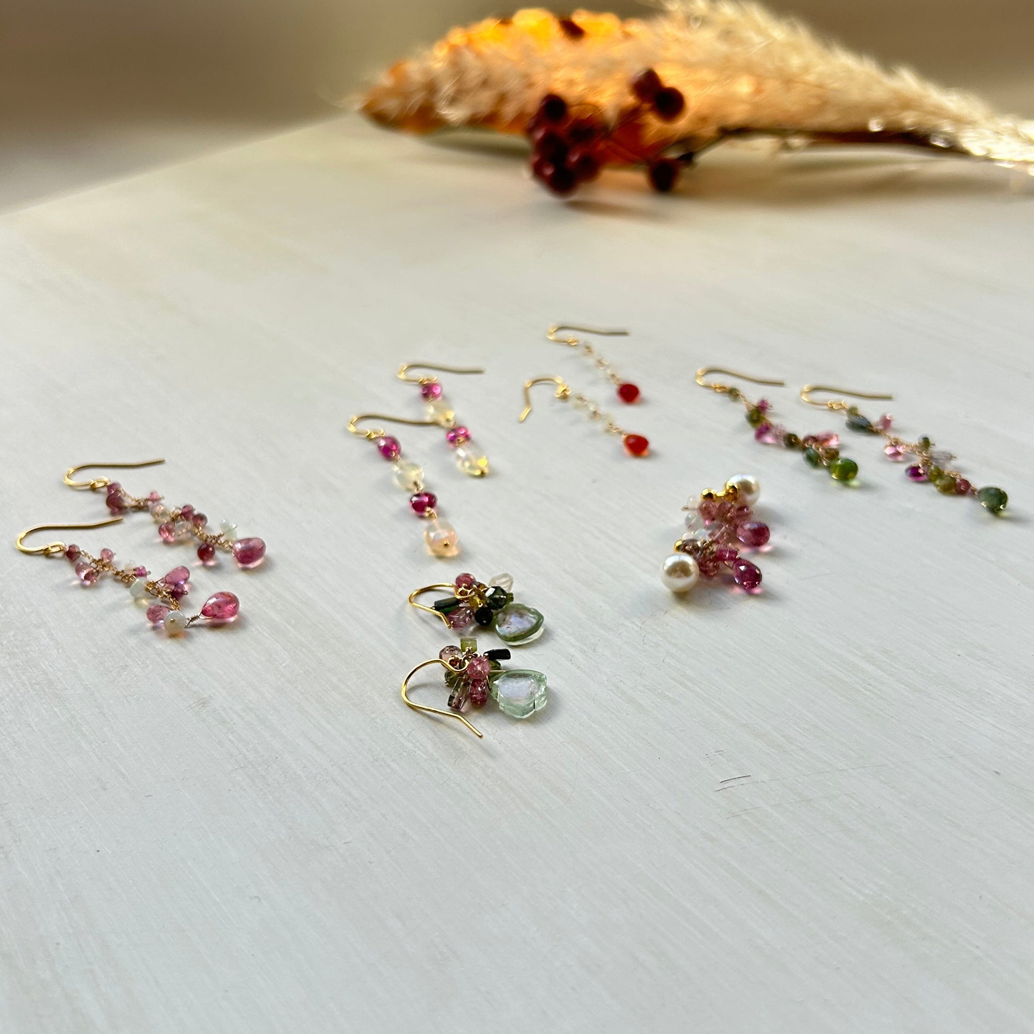 こちらのピアスには10月の誕生石であるピンクの「トルマリン」とホワイトの「オパール」を繋げ、優しい色合いの組み合わせに仕上げました。