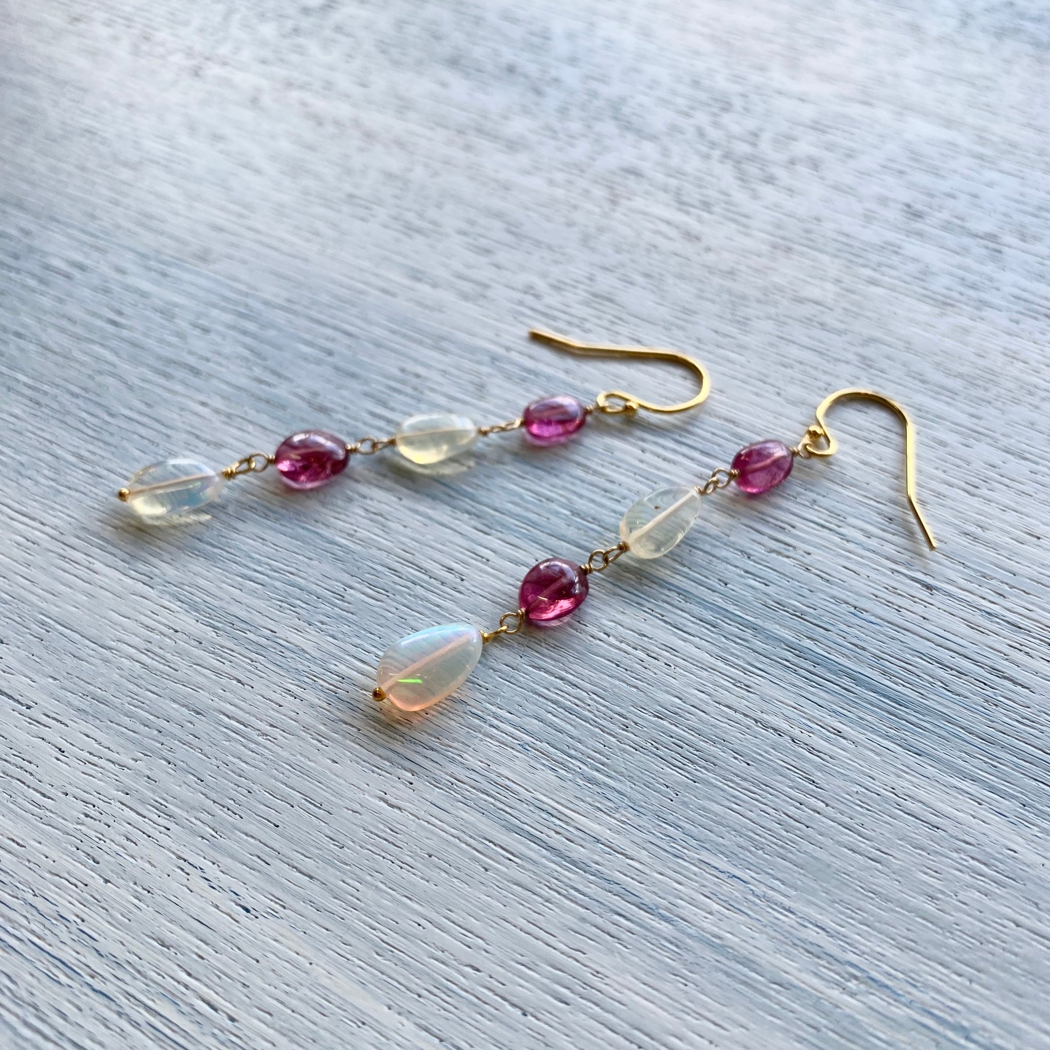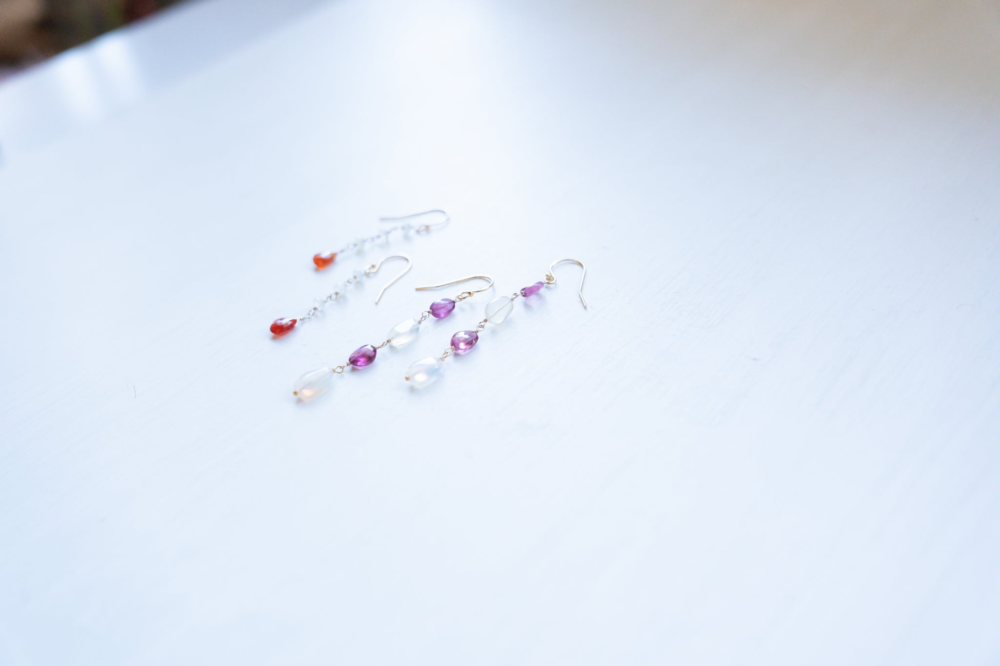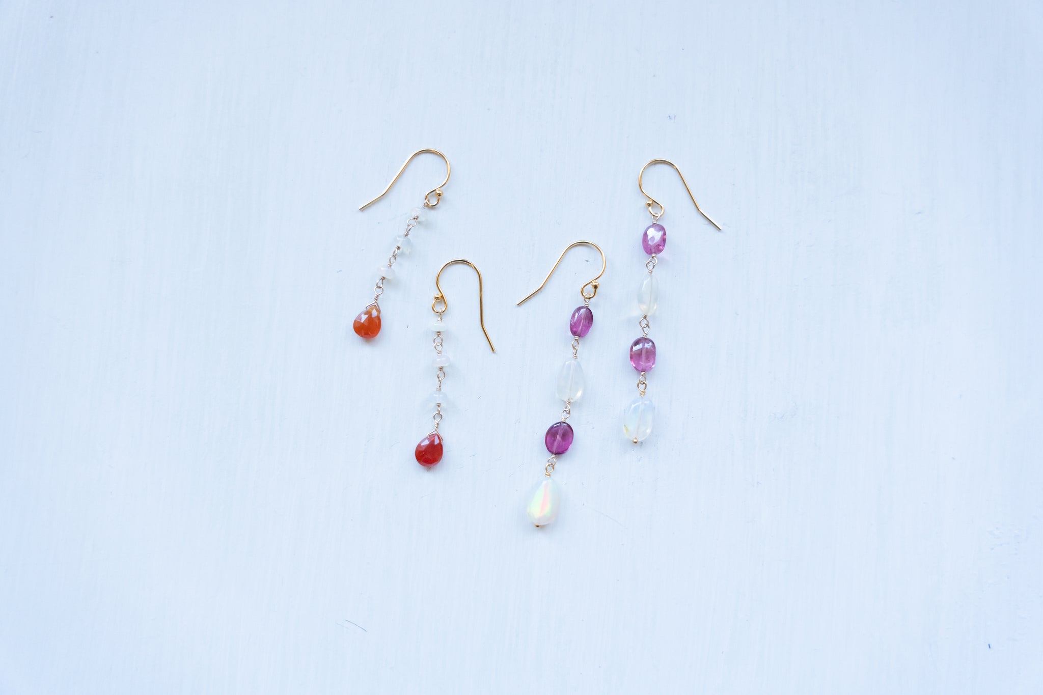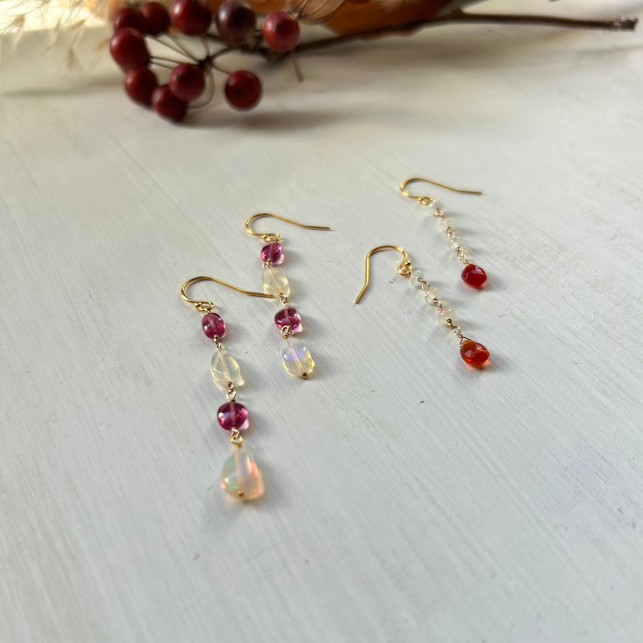 こちらのピアスには10月の誕生石であるピンクの「トルマリン」とホワイトの「オパール」を繋げ、優しい色合いの組み合わせに仕上げました。