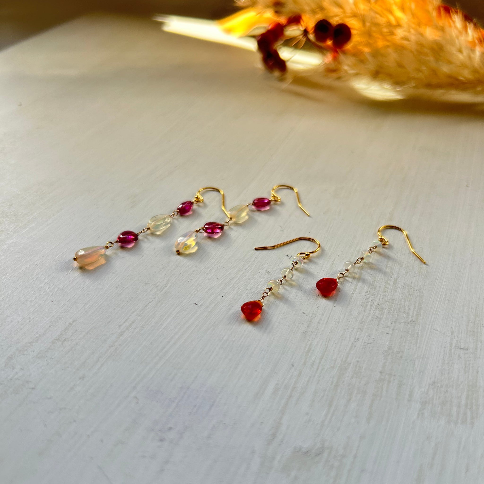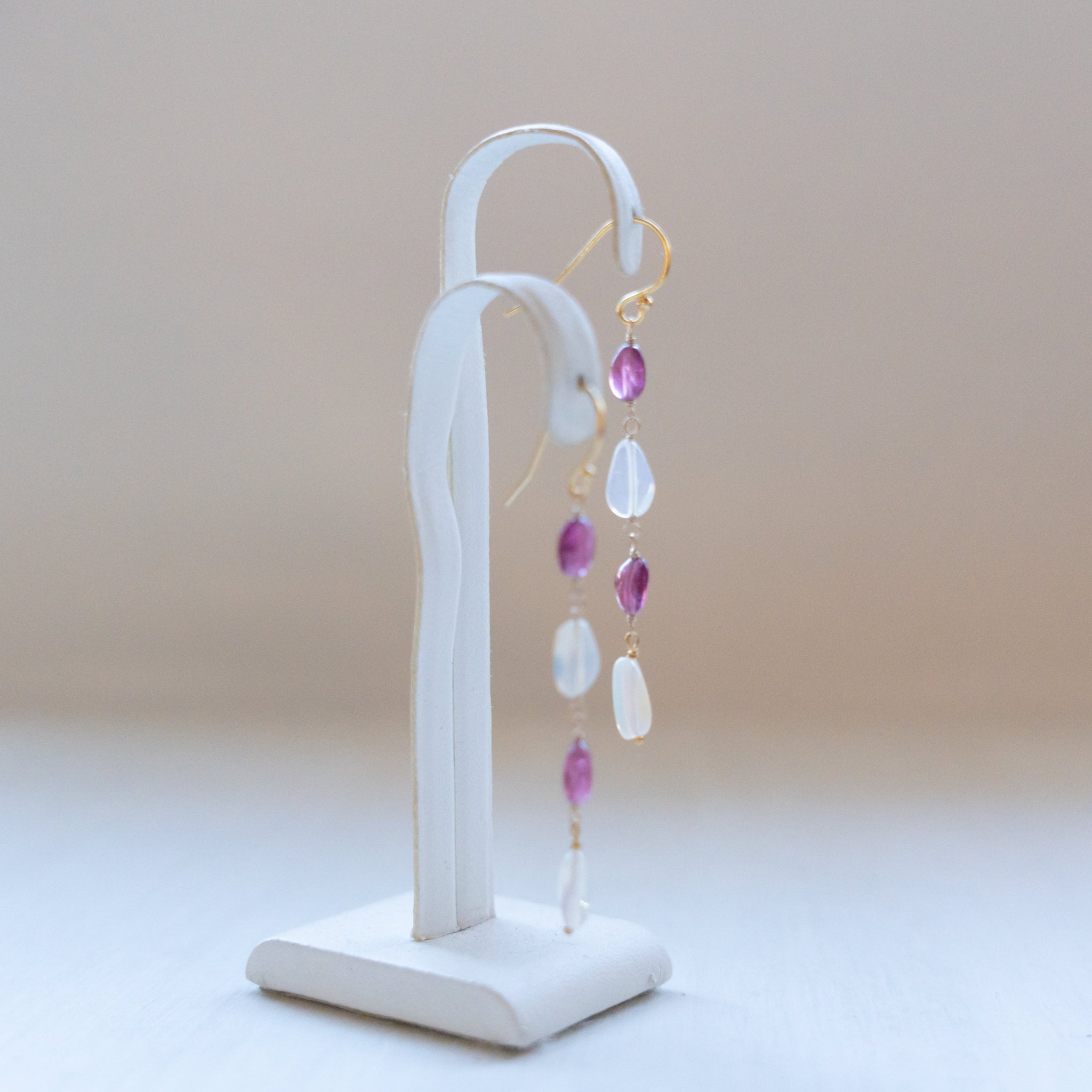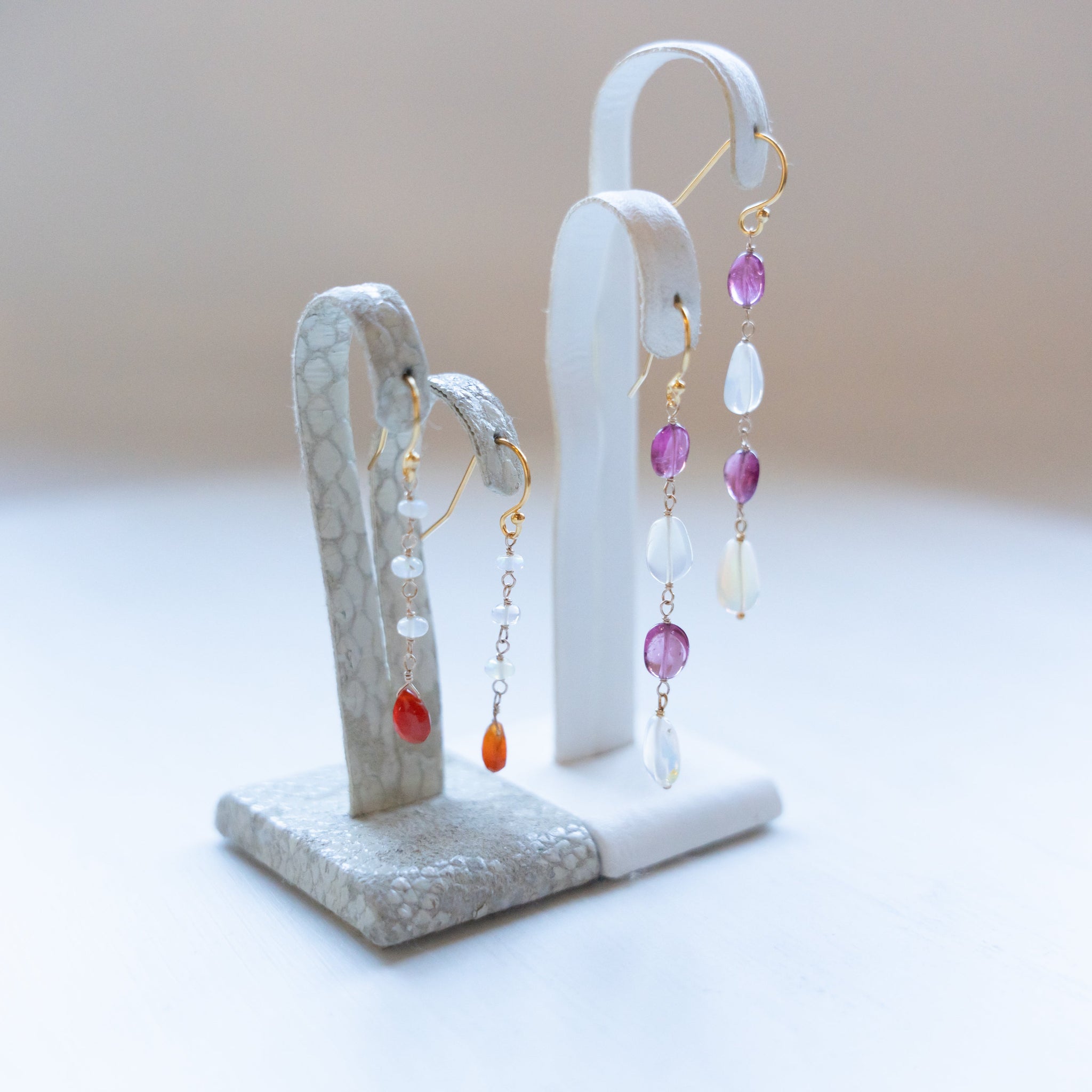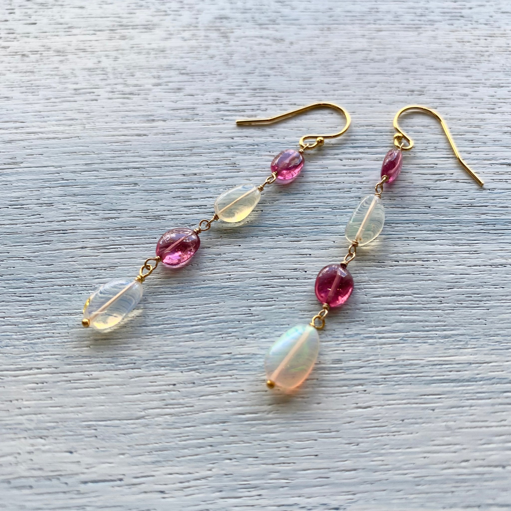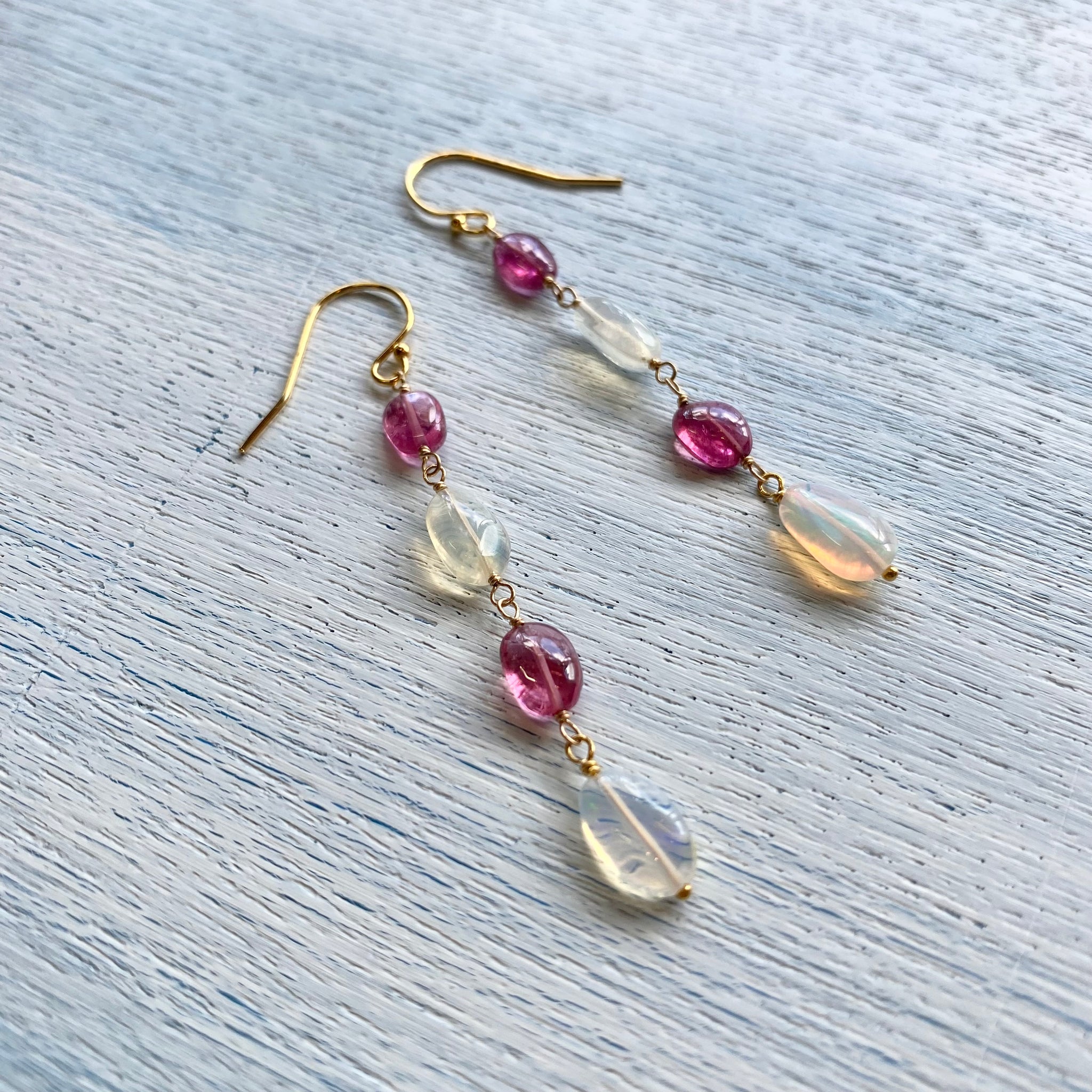 こちらのピアスには10月の誕生石であるピンクの「トルマリン」とホワイトの「オパール」を繋げ、優しい色合いの組み合わせに仕上げました。
