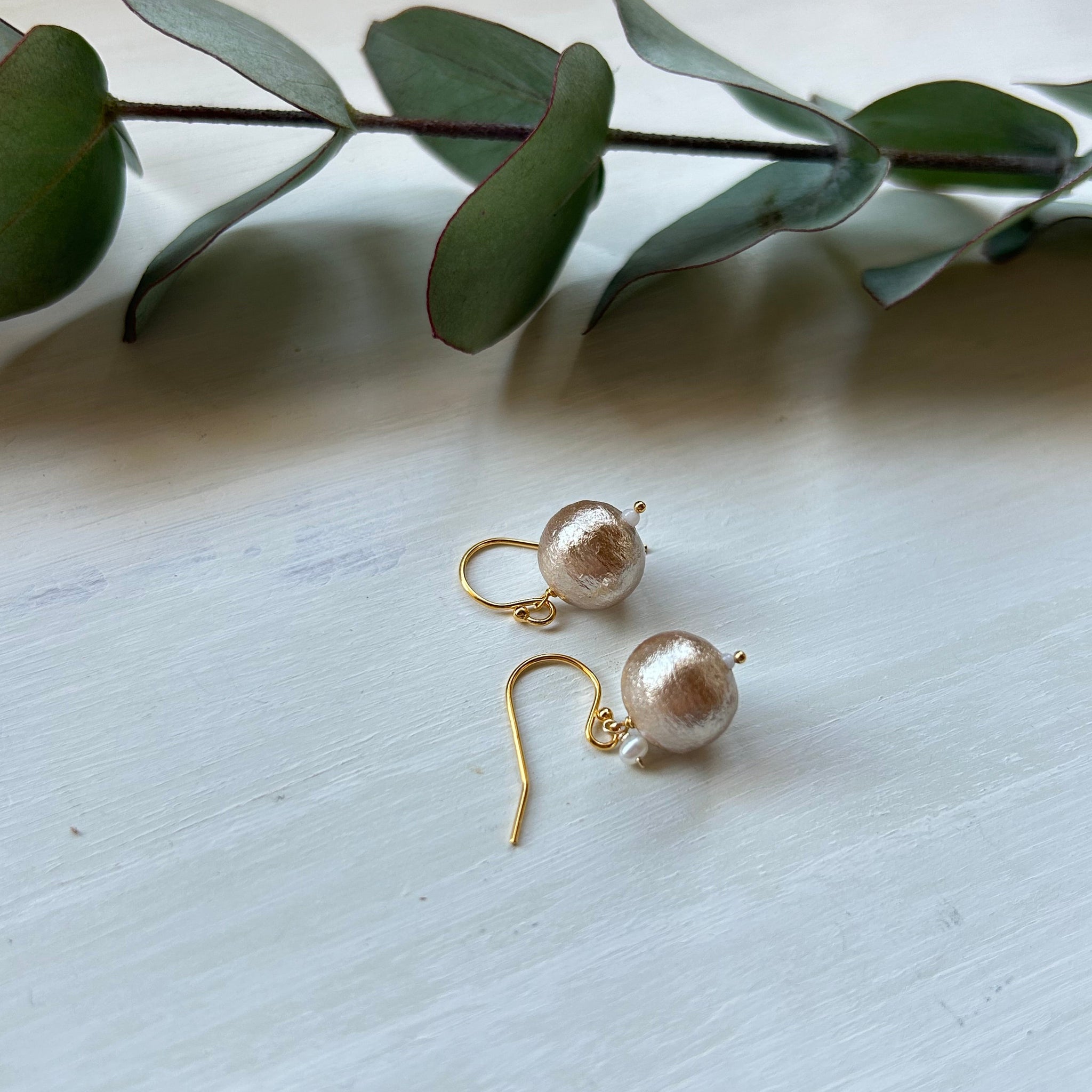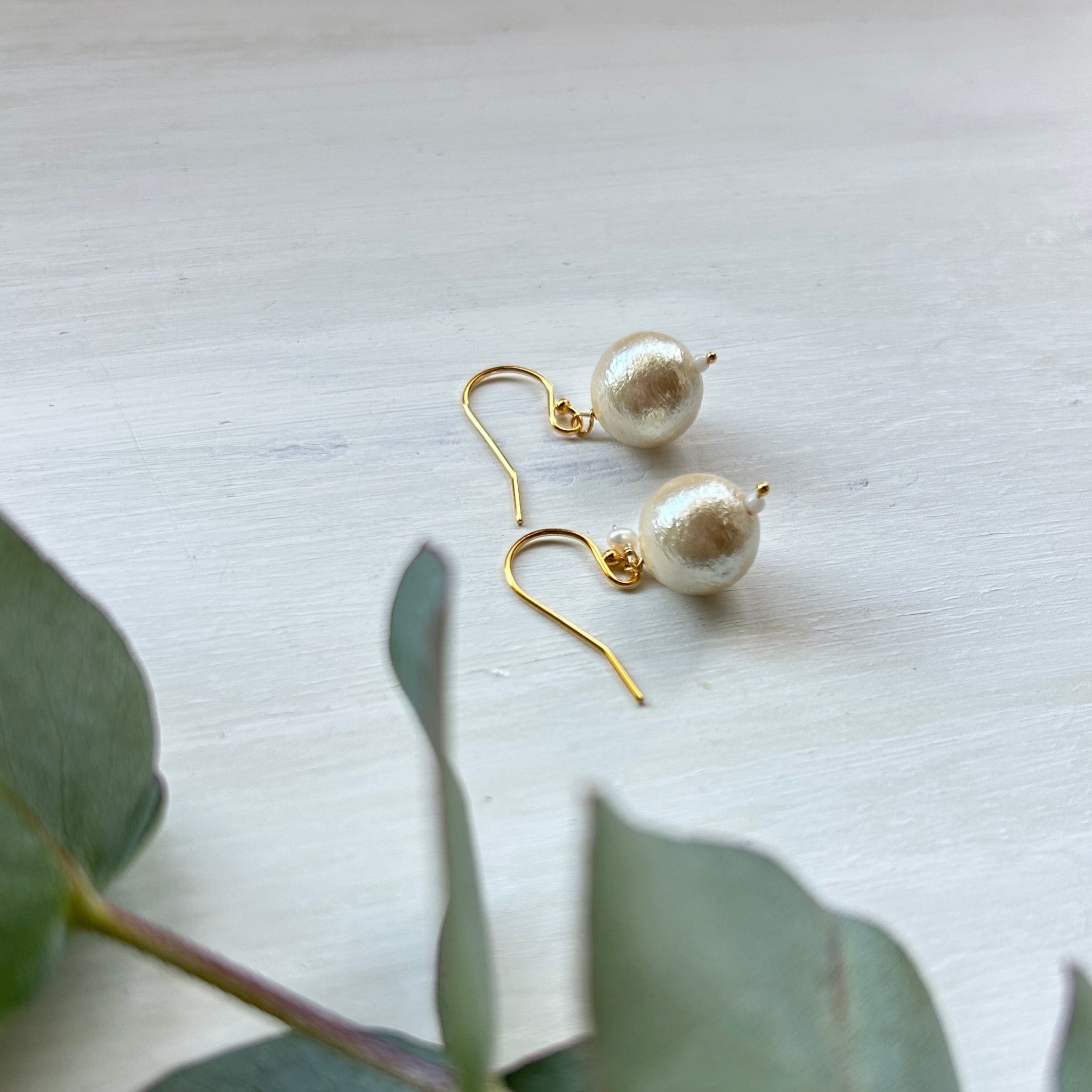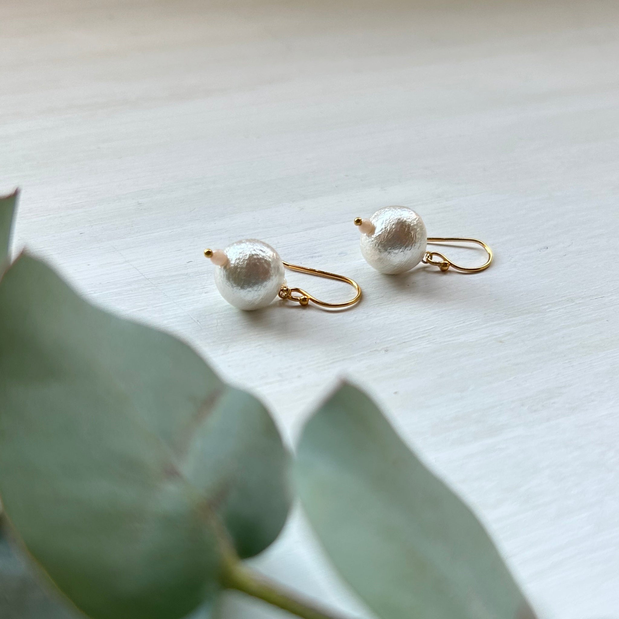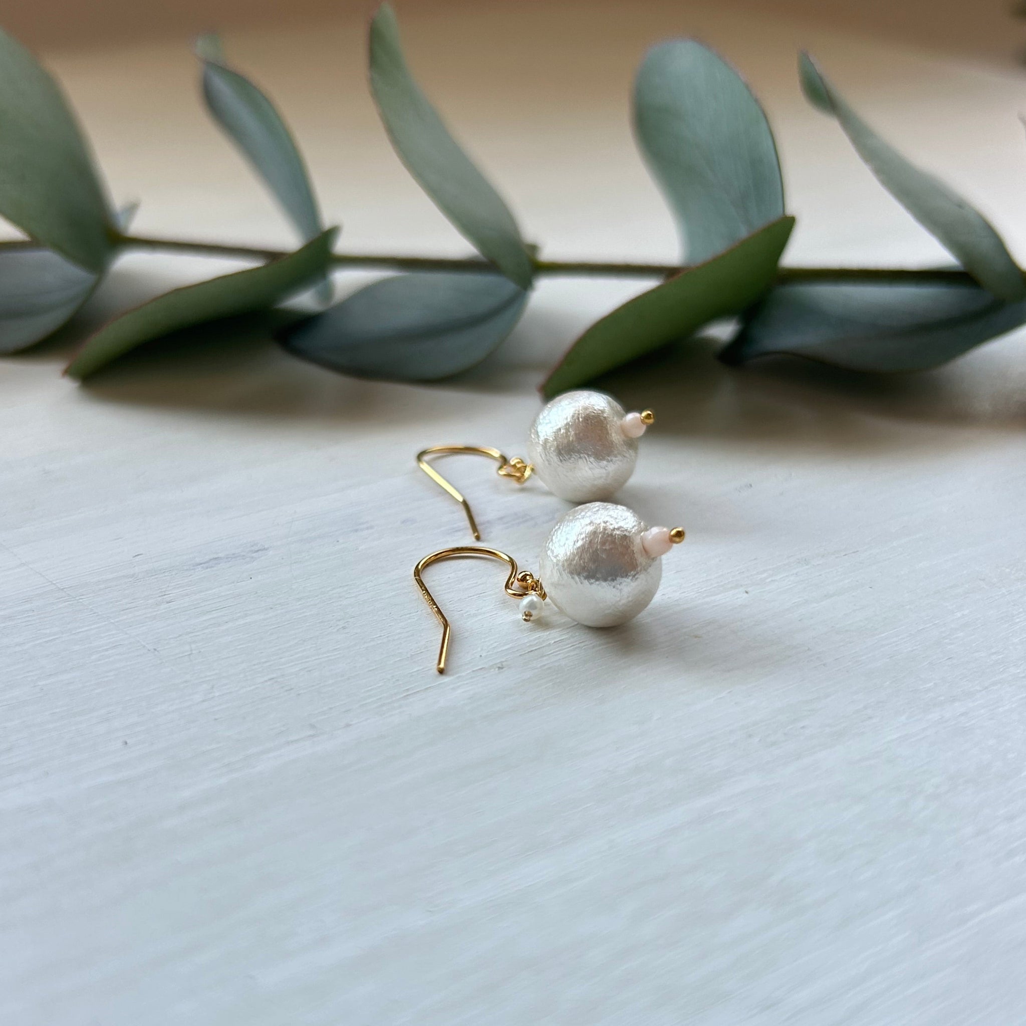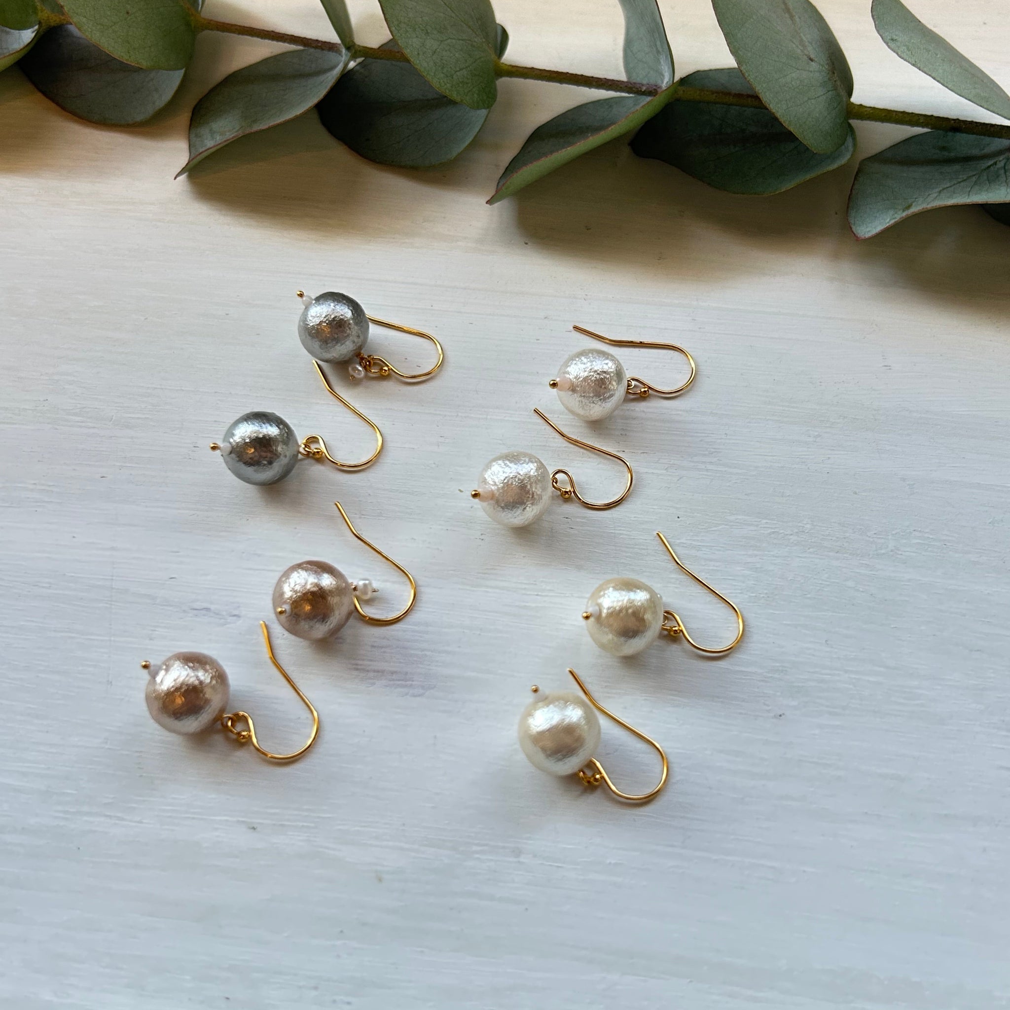 綿(コットン)を圧縮して丸い形にし、表面をパール風に加工したビーズ。真珠とは異なり、とても軽く、やわらかな風合いをお楽しみいただけます。