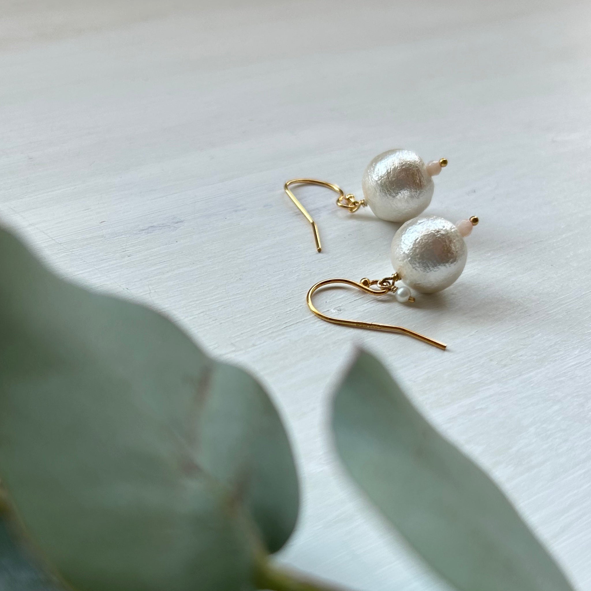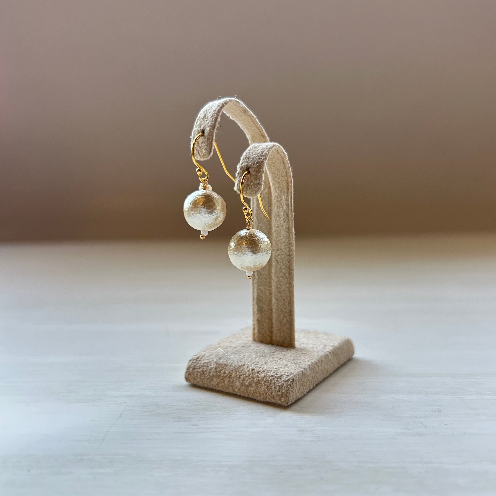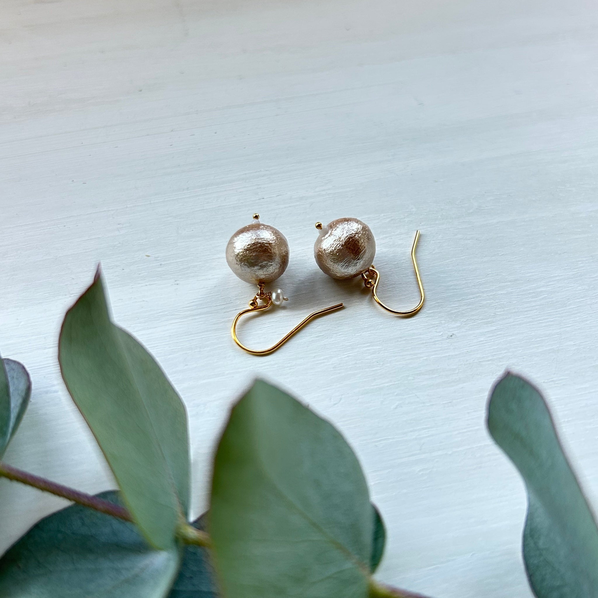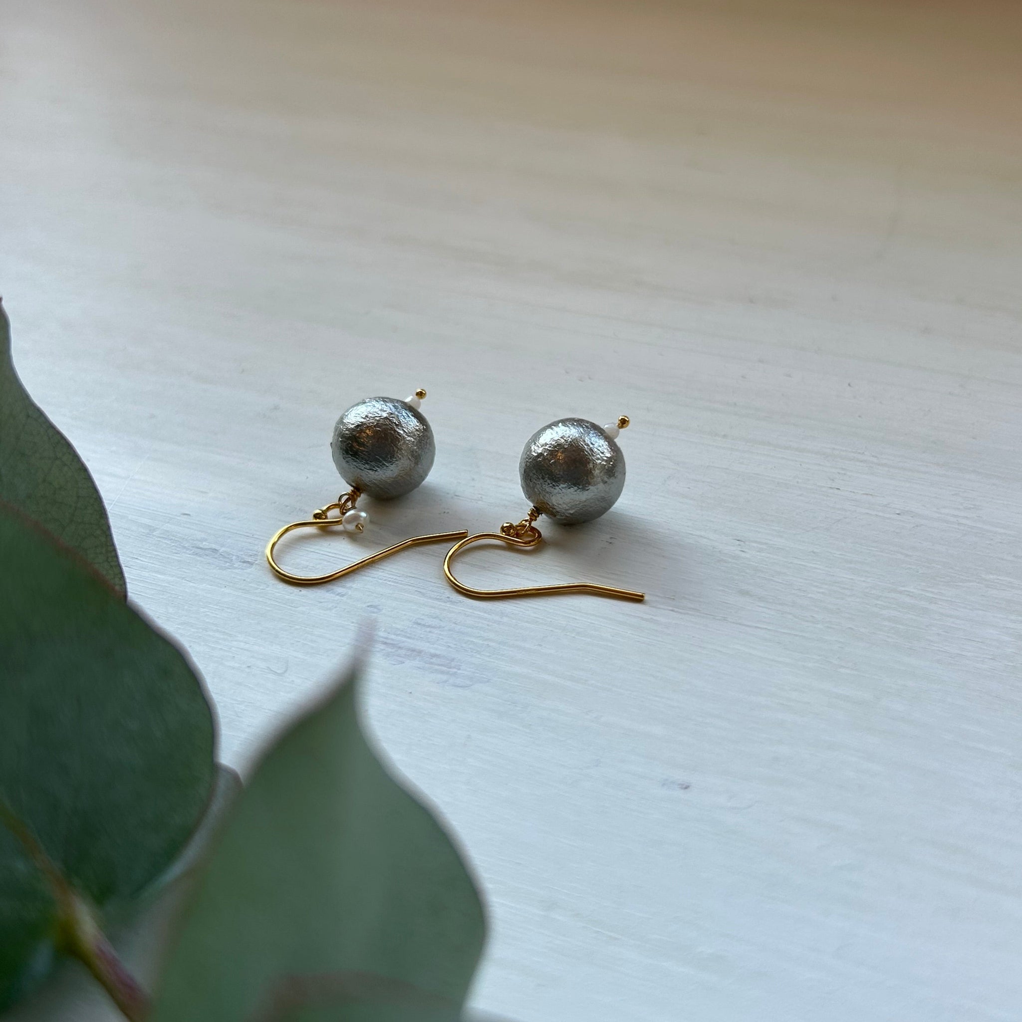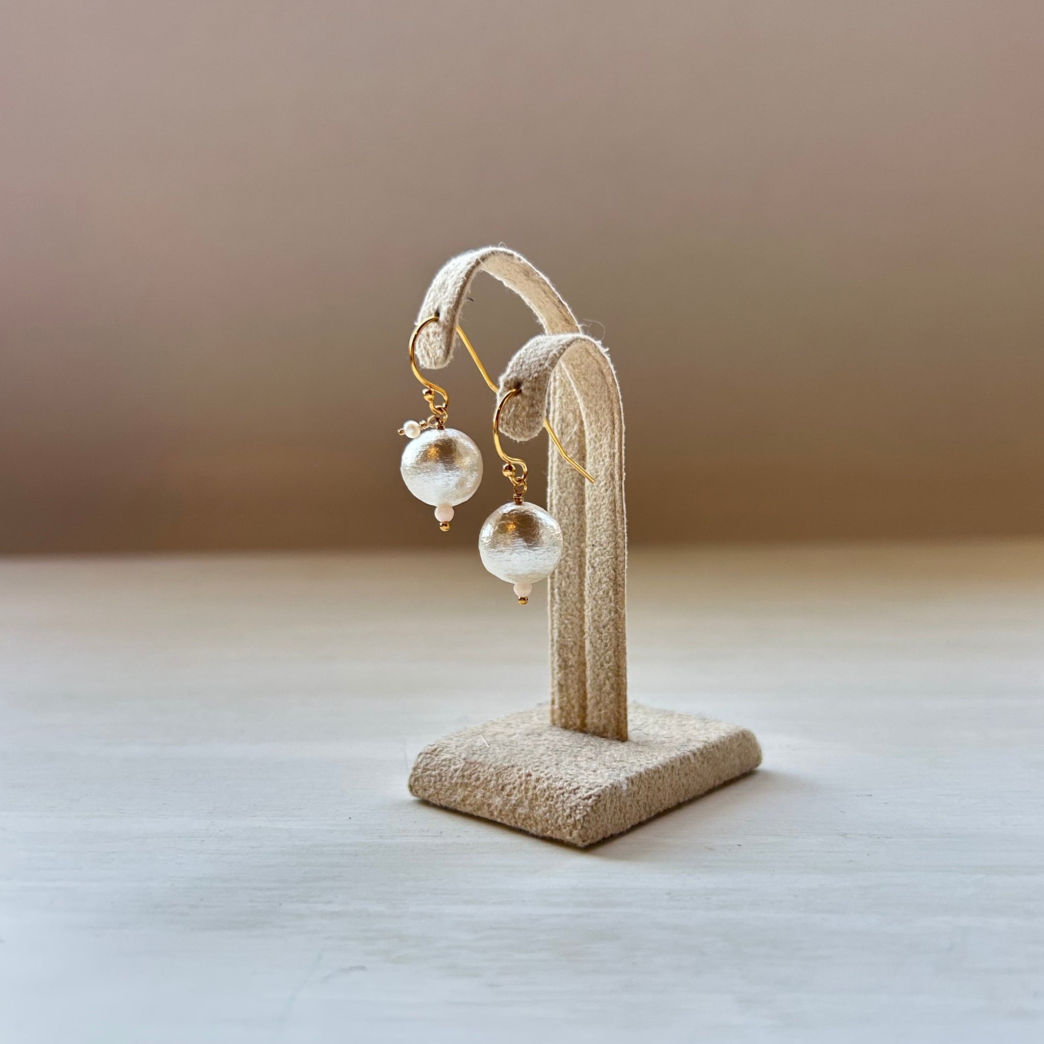 綿(コットン)を圧縮して丸い形にし、表面をパール風に加工したビーズ。真珠とは異なり、とても軽く、やわらかな風合いをお楽しみいただけます。