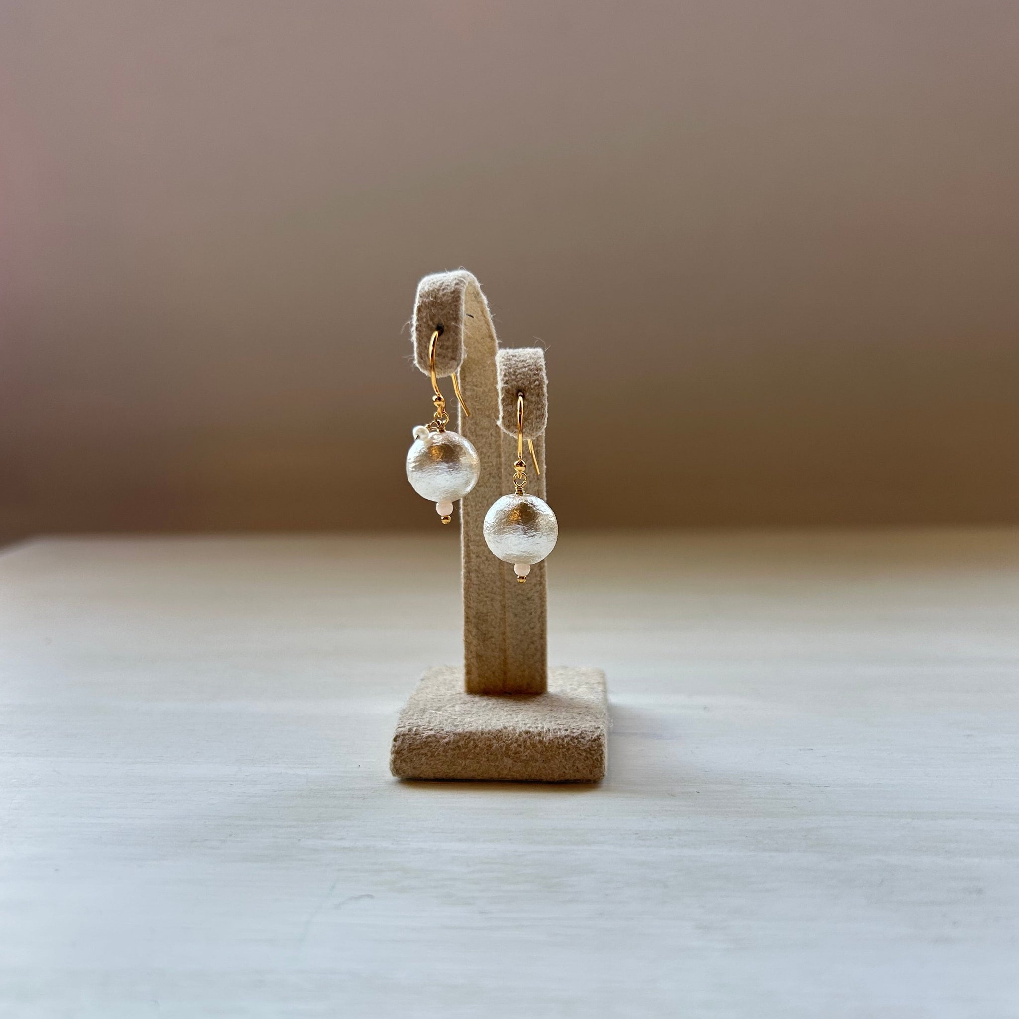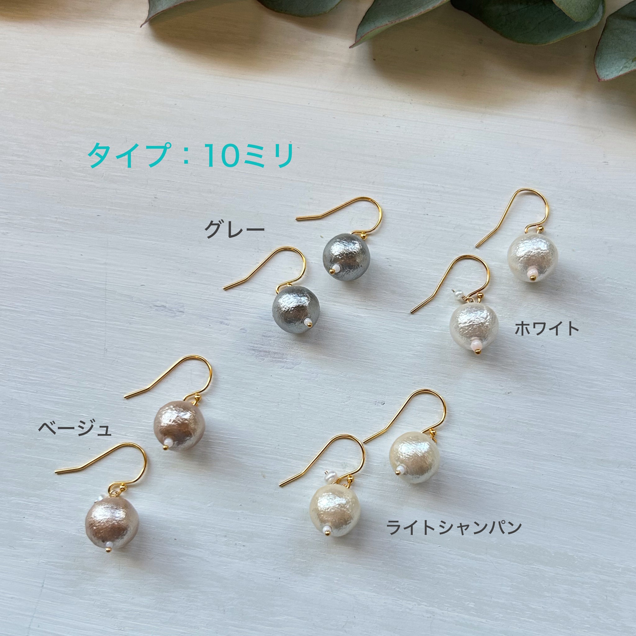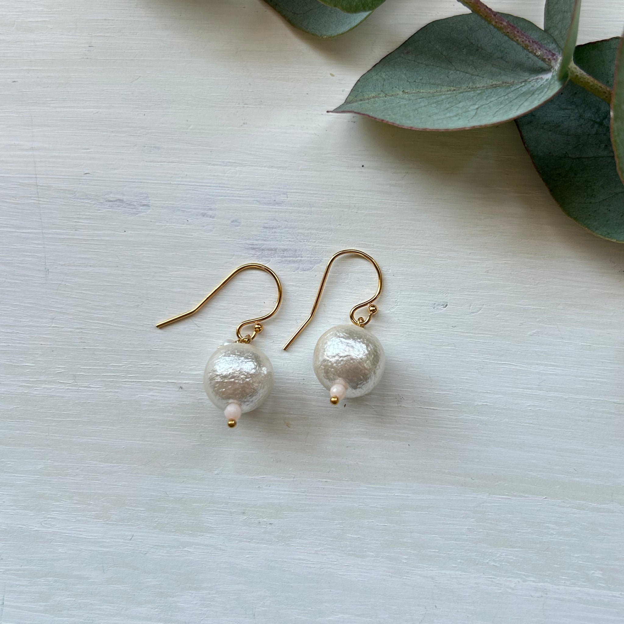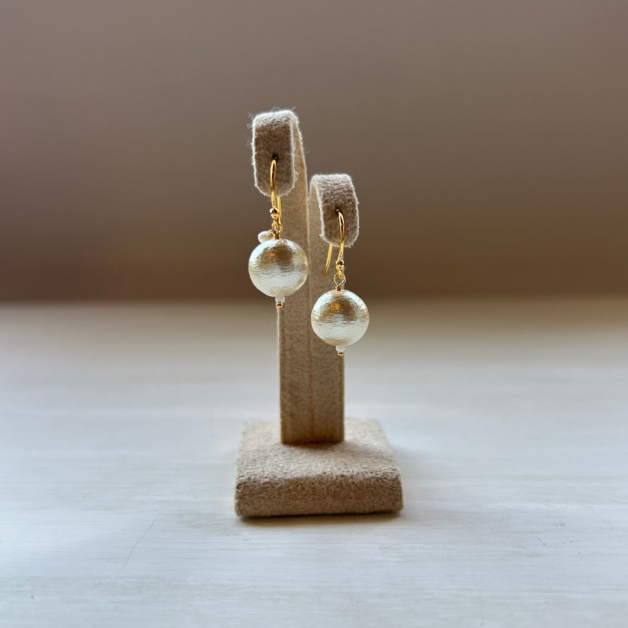 綿(コットン)を圧縮して丸い形にし、表面をパール風に加工したビーズ。真珠とは異なり、とても軽く、やわらかな風合いをお楽しみいただけます。