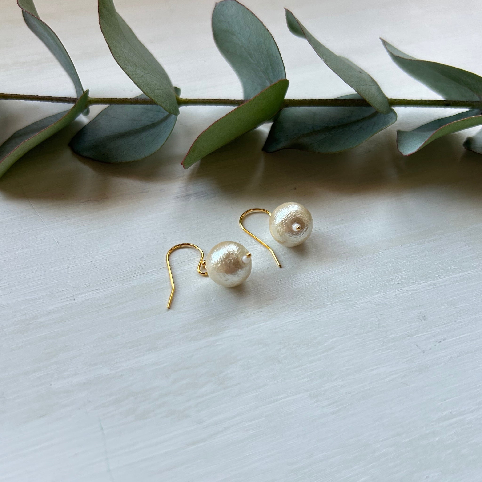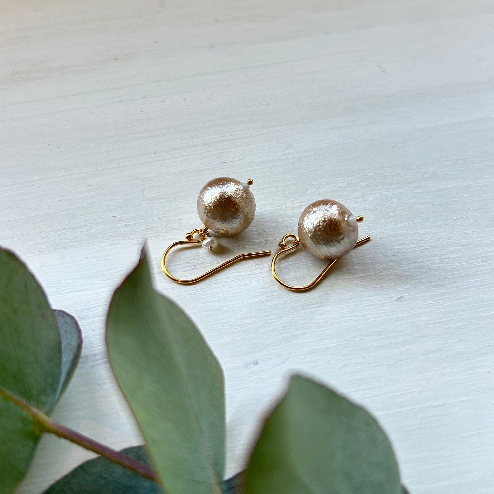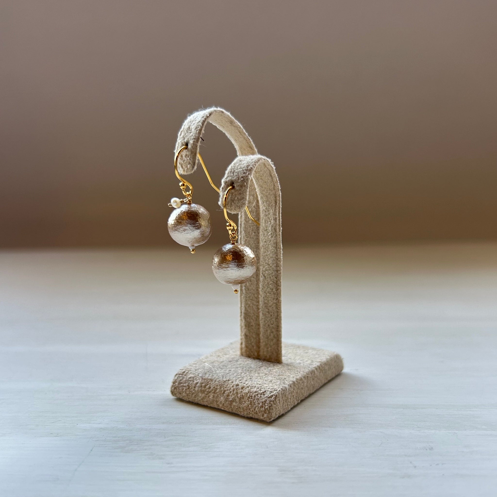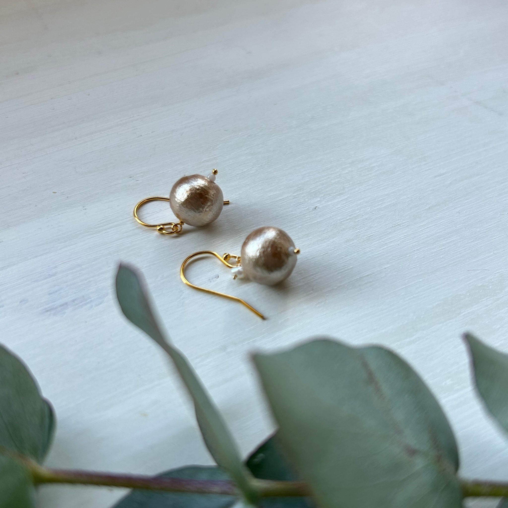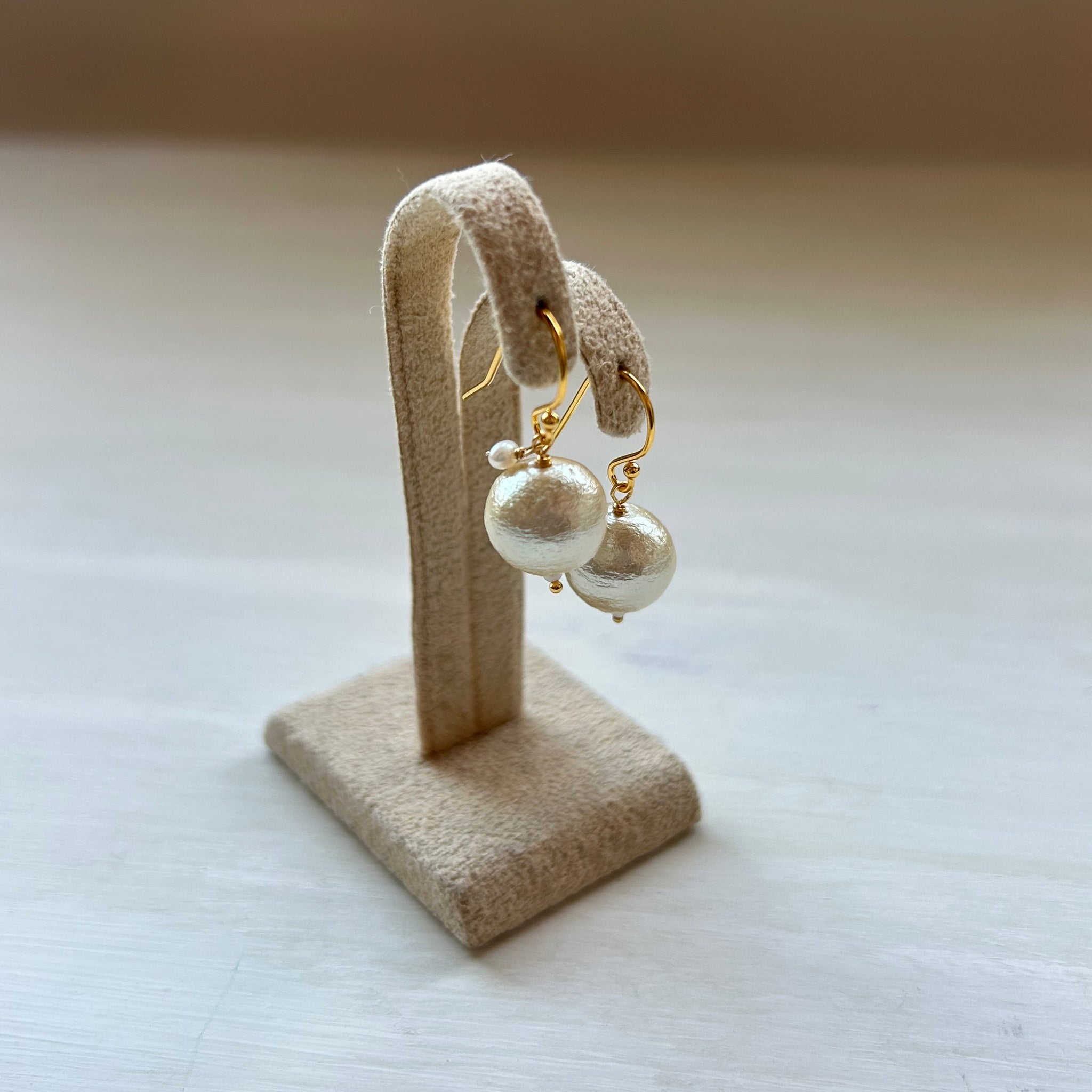 綿(コットン)を圧縮して丸い形にし、表面をパール風に加工したビーズ。真珠とは異なり、とても軽く、やわらかな風合いをお楽しみいただけます。