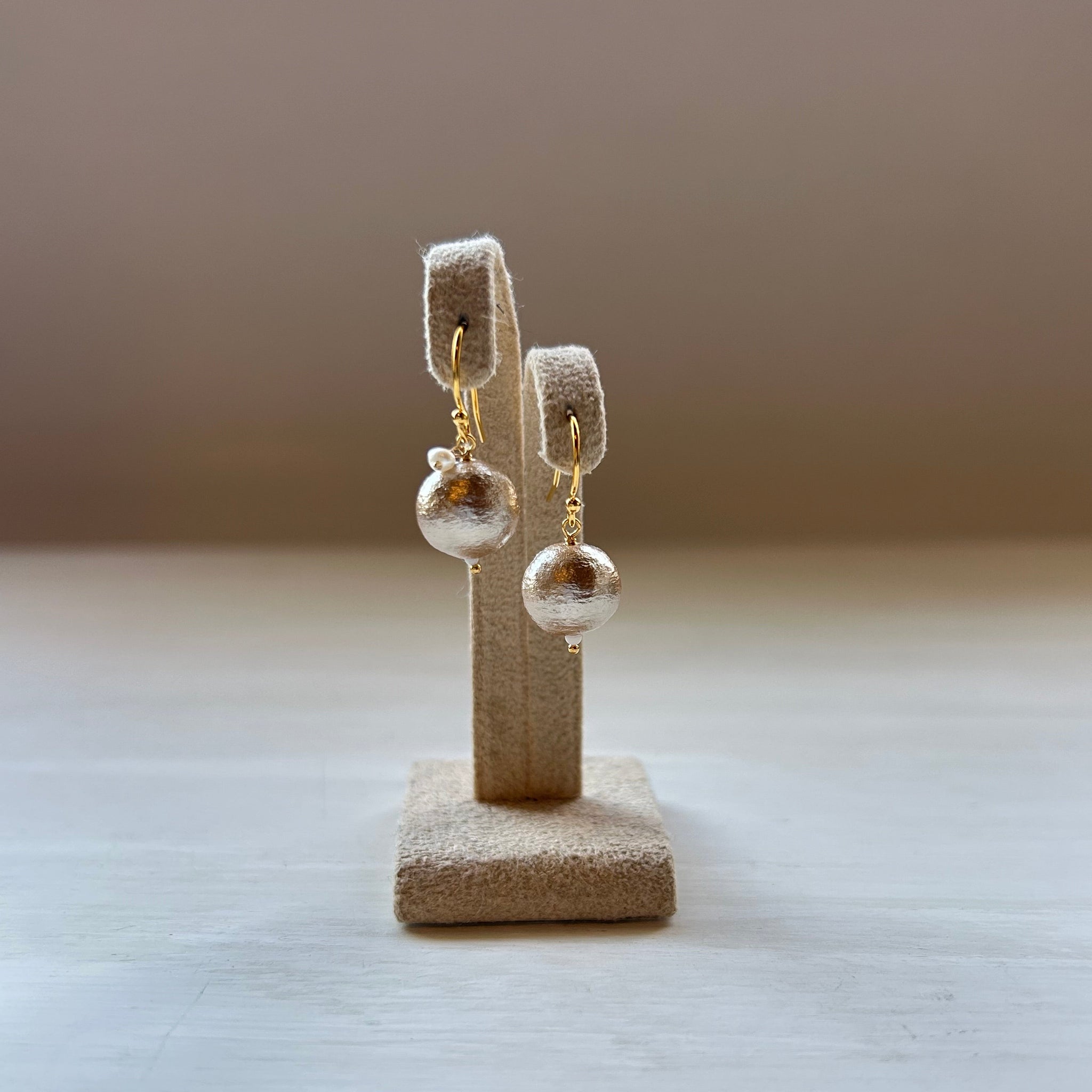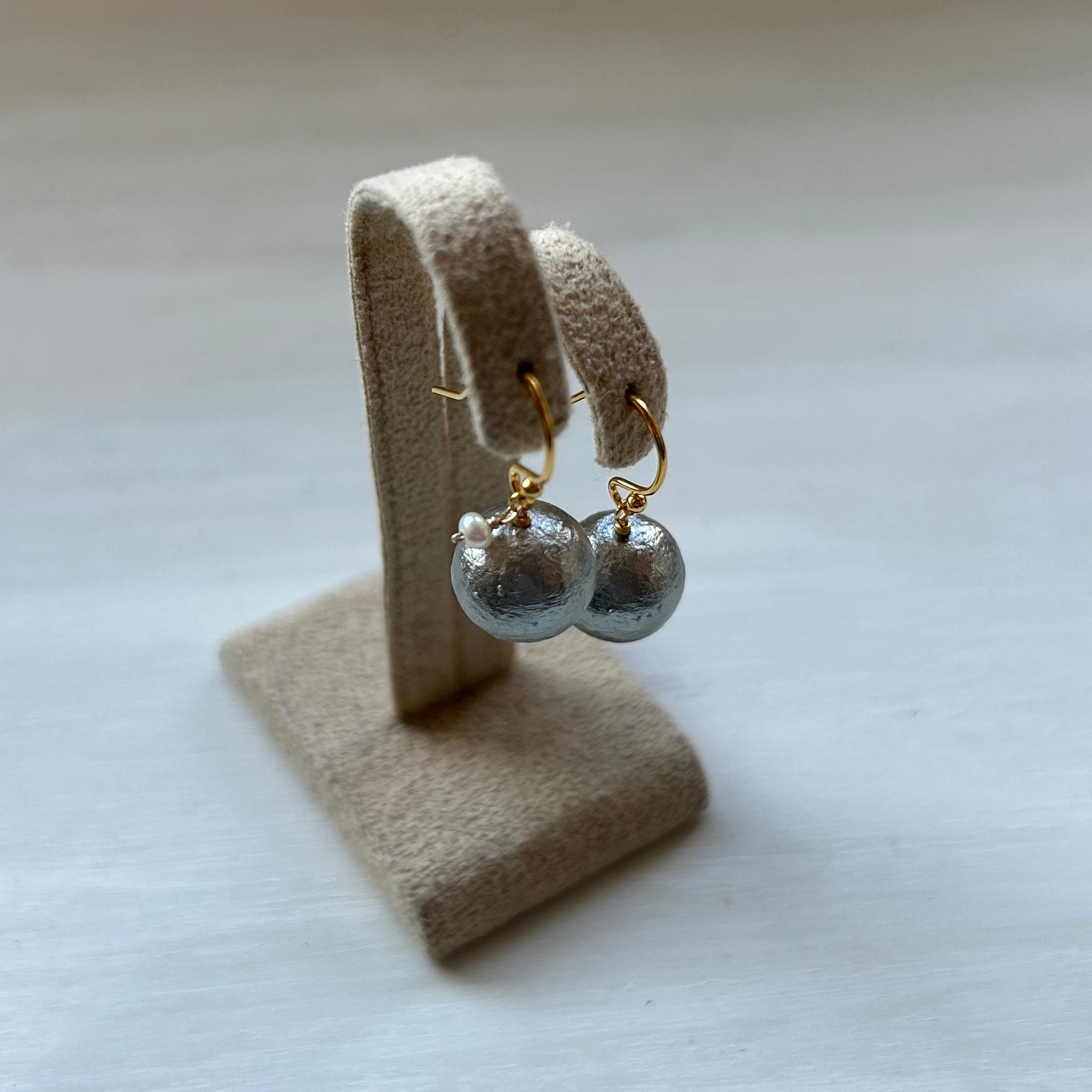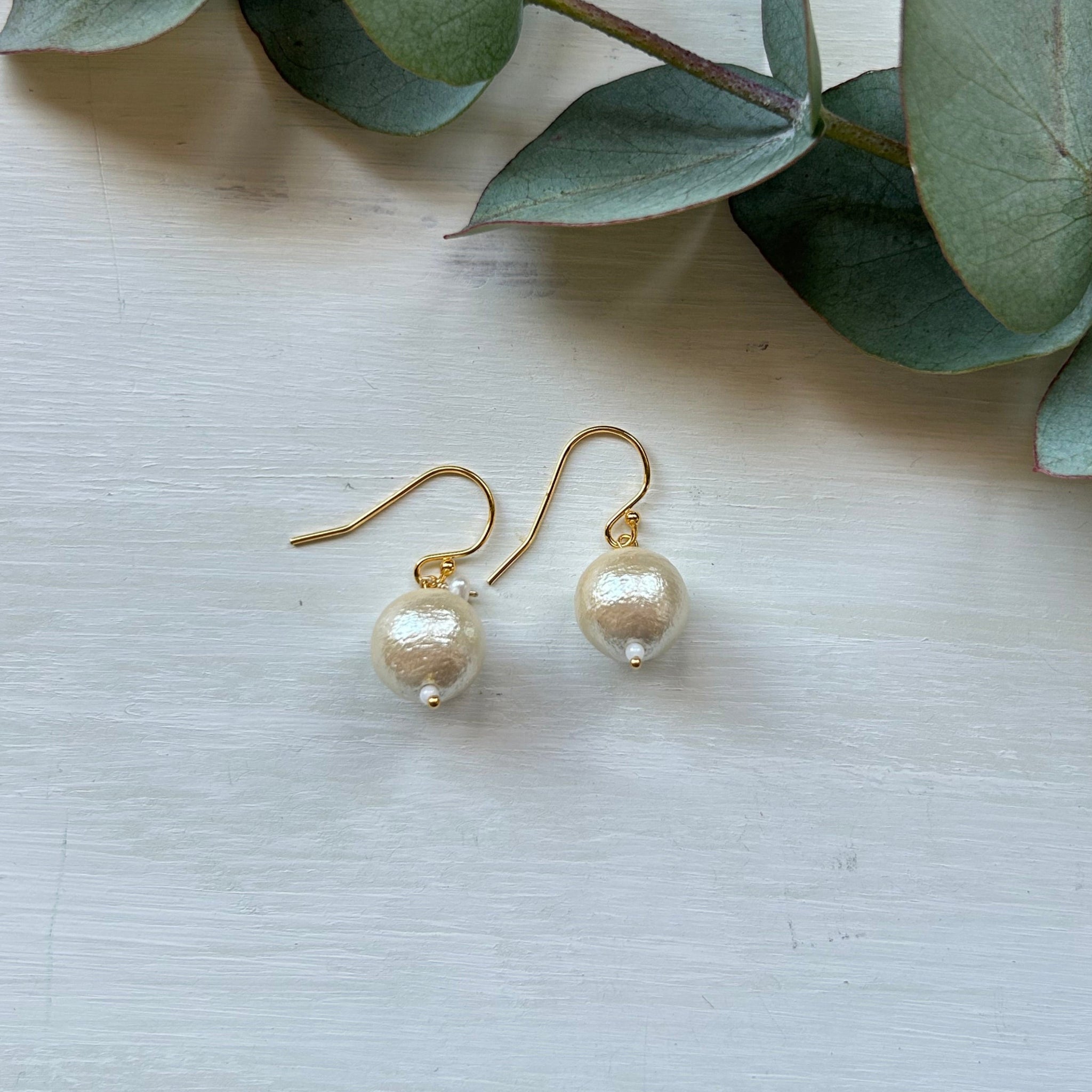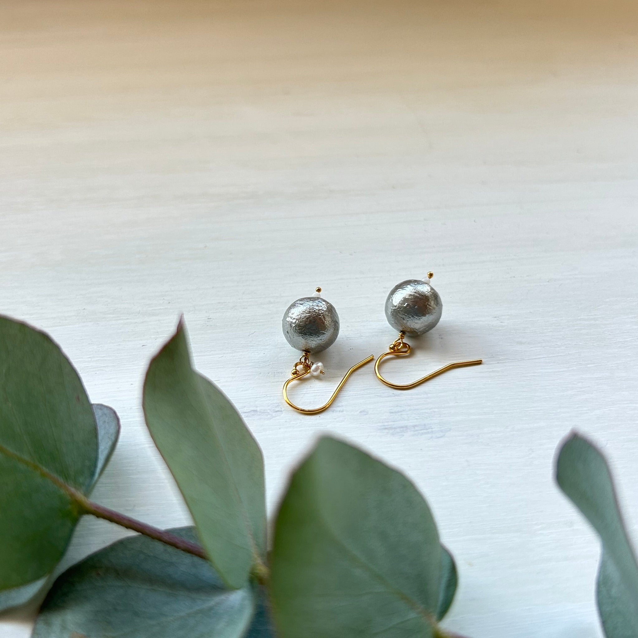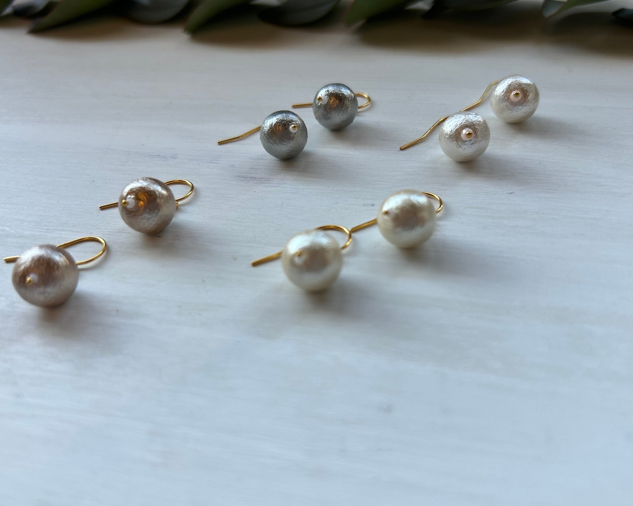 綿(コットン)を圧縮して丸い形にし、表面をパール風に加工したビーズ。真珠とは異なり、とても軽く、やわらかな風合いをお楽しみいただけます。