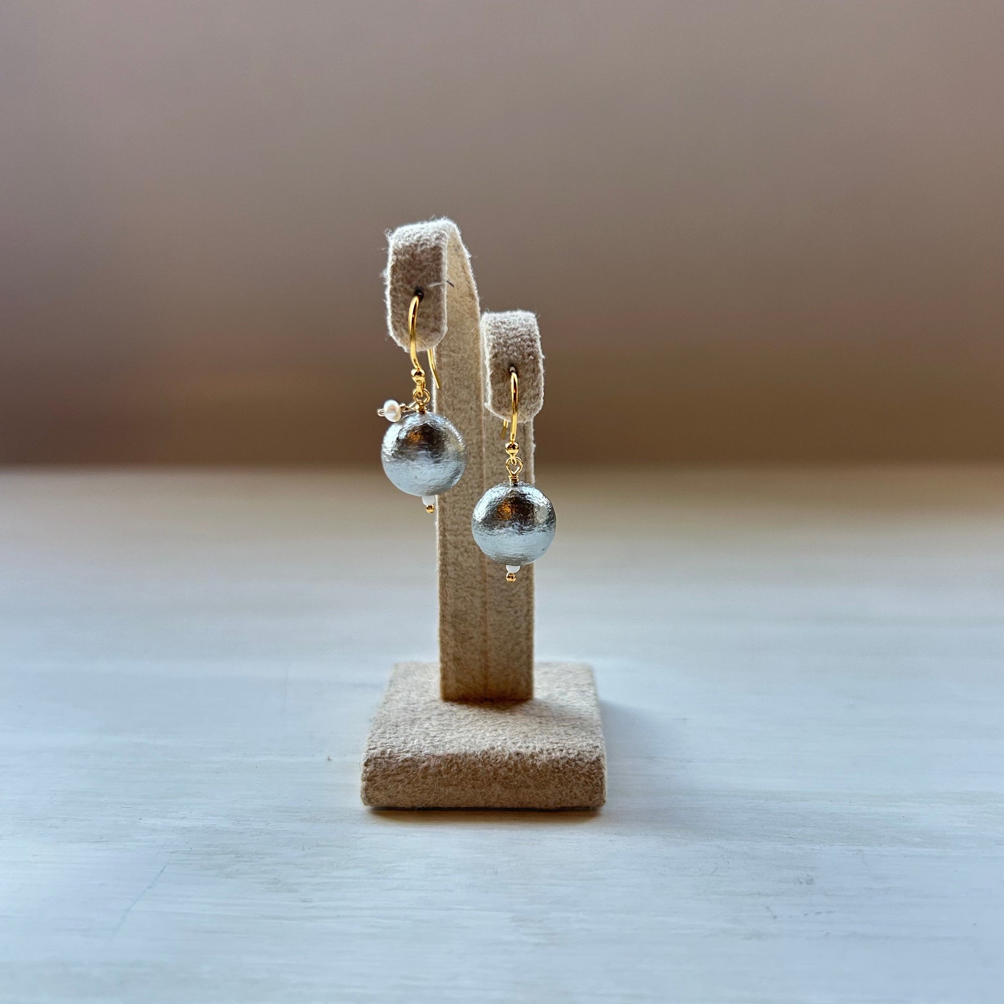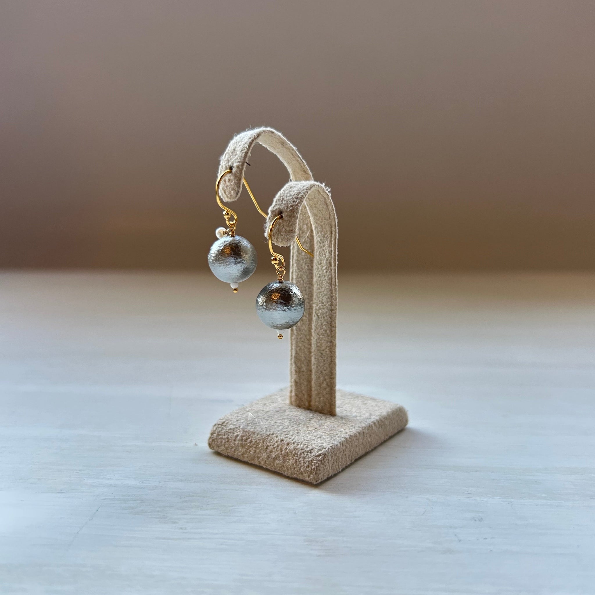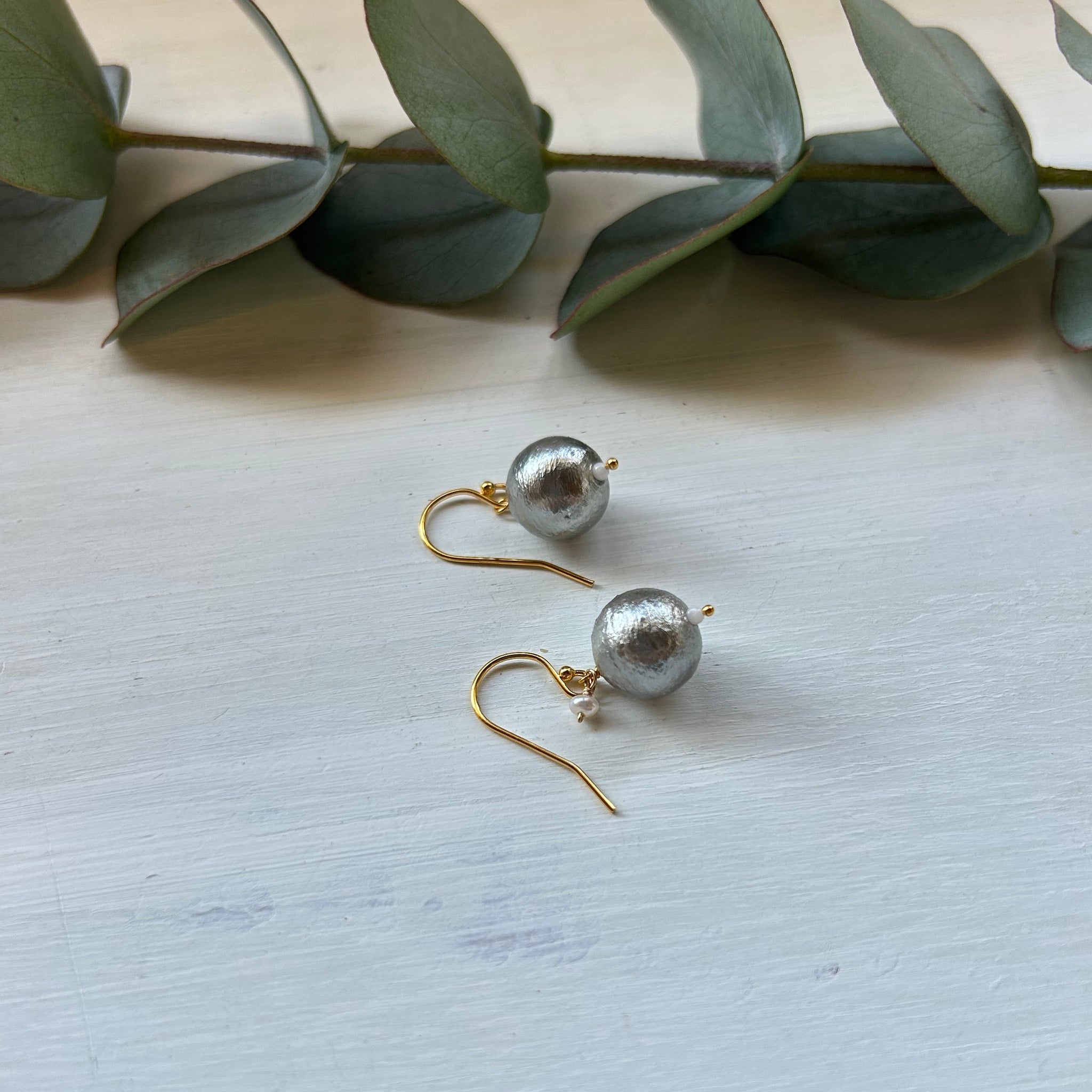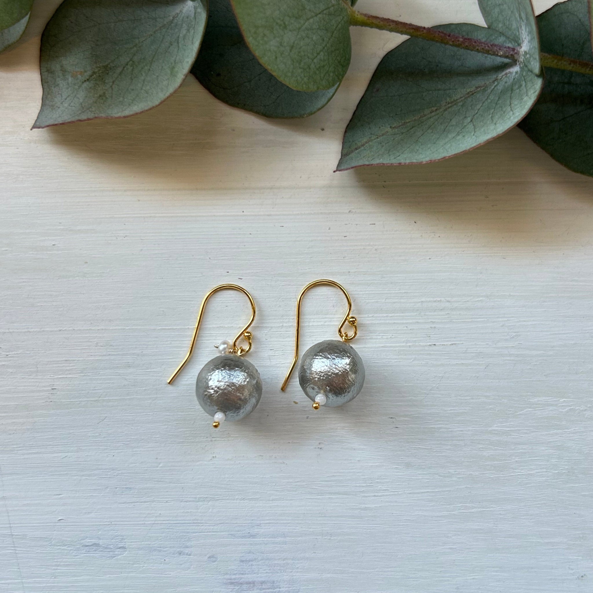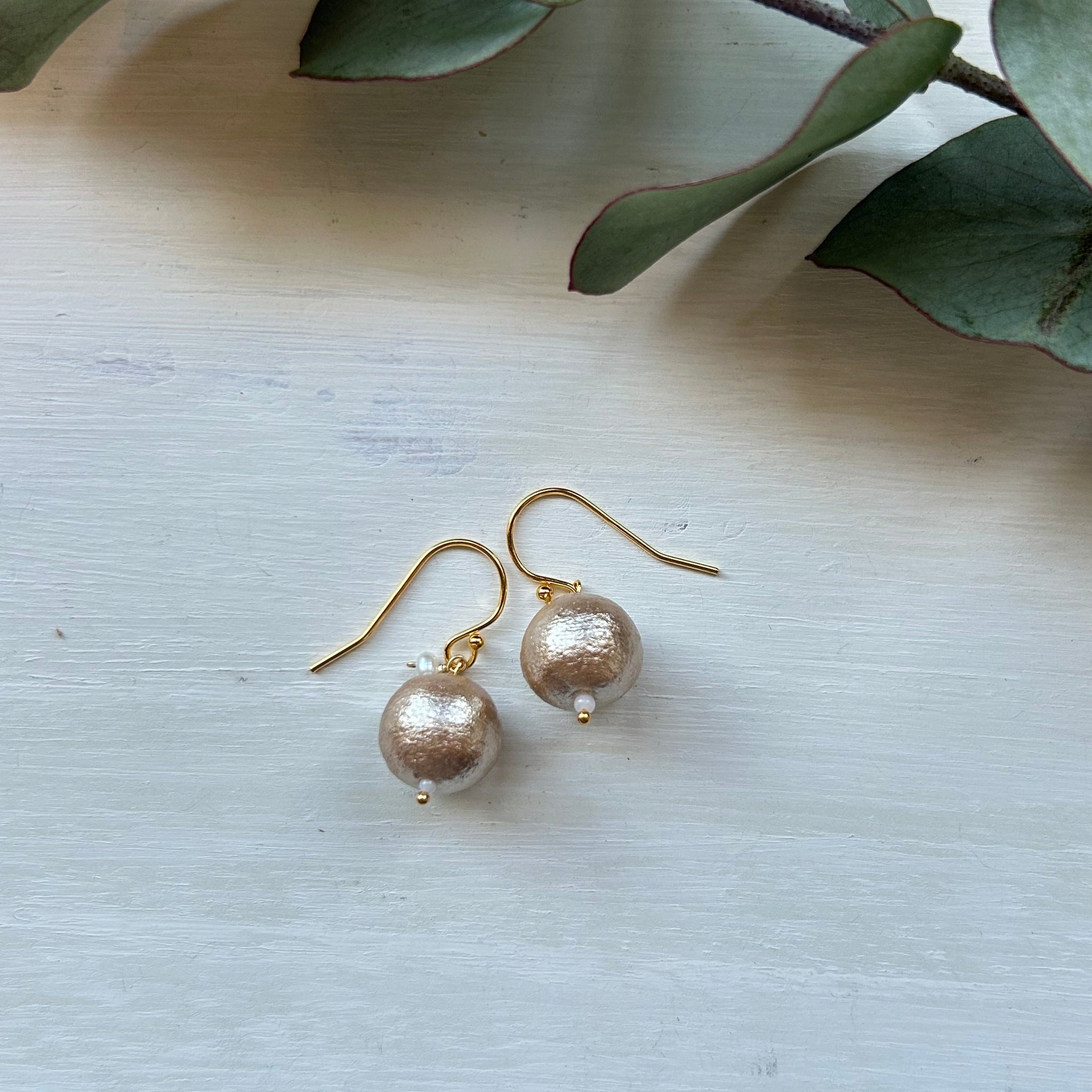 綿(コットン)を圧縮して丸い形にし、表面をパール風に加工したビーズ。真珠とは異なり、とても軽く、やわらかな風合いをお楽しみいただけます。