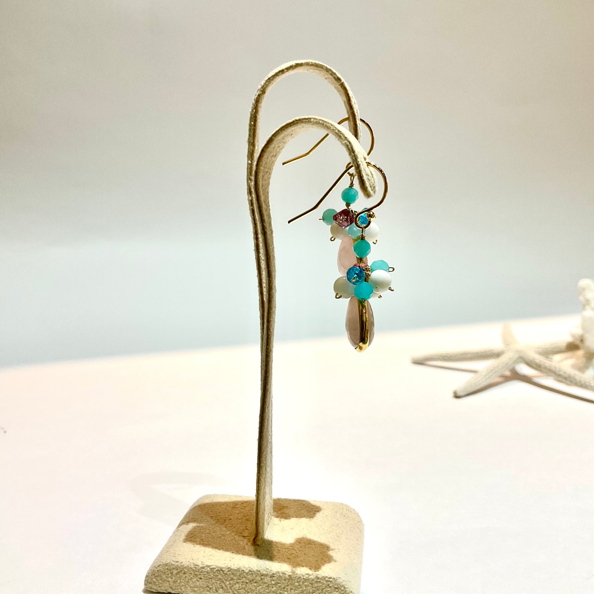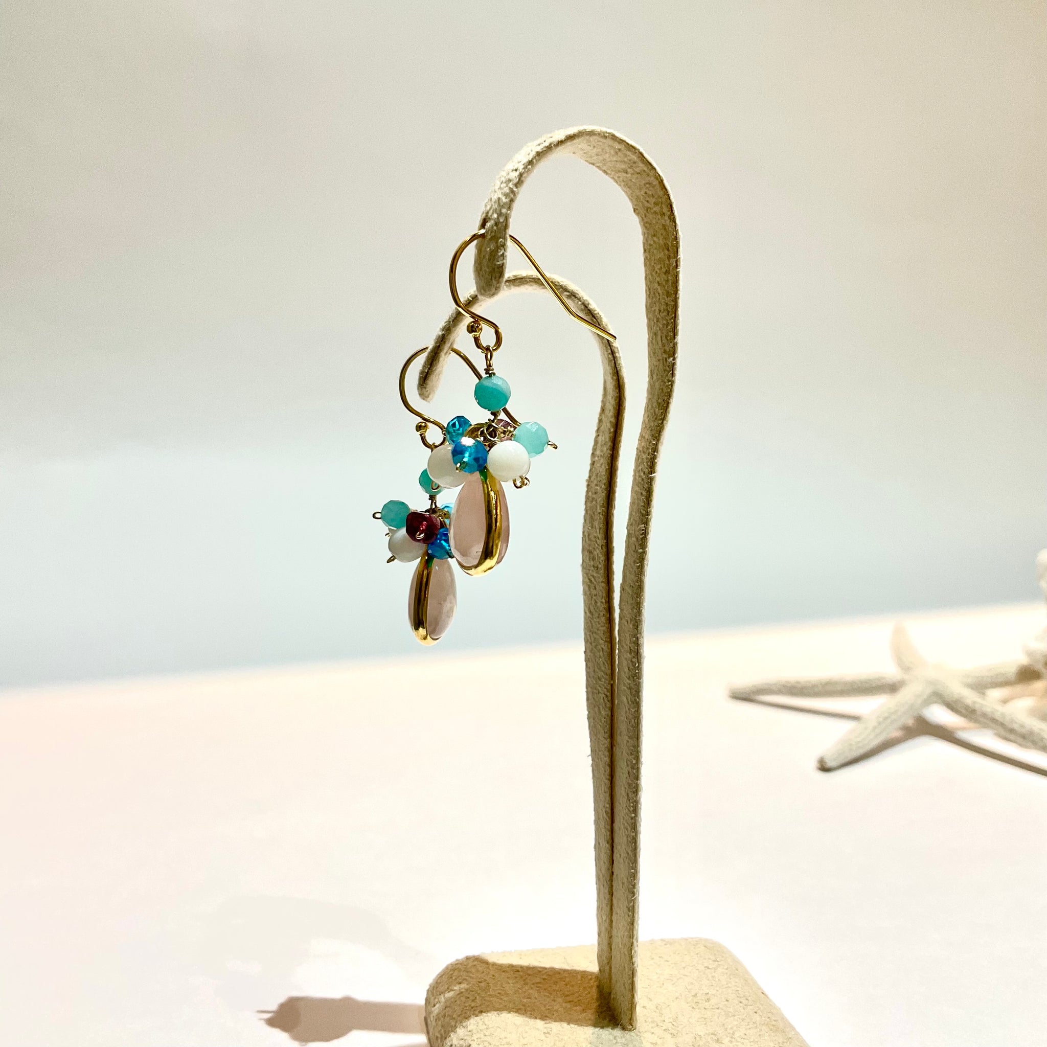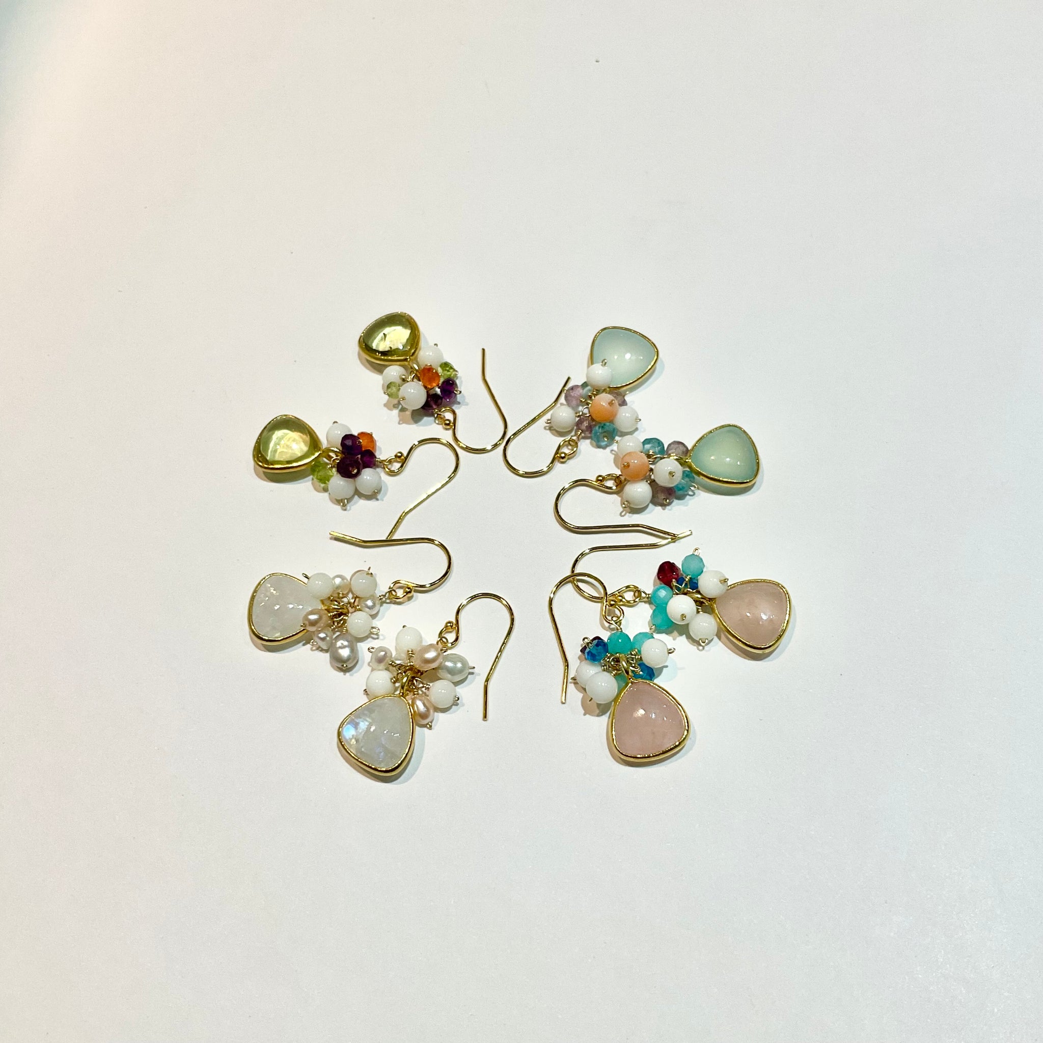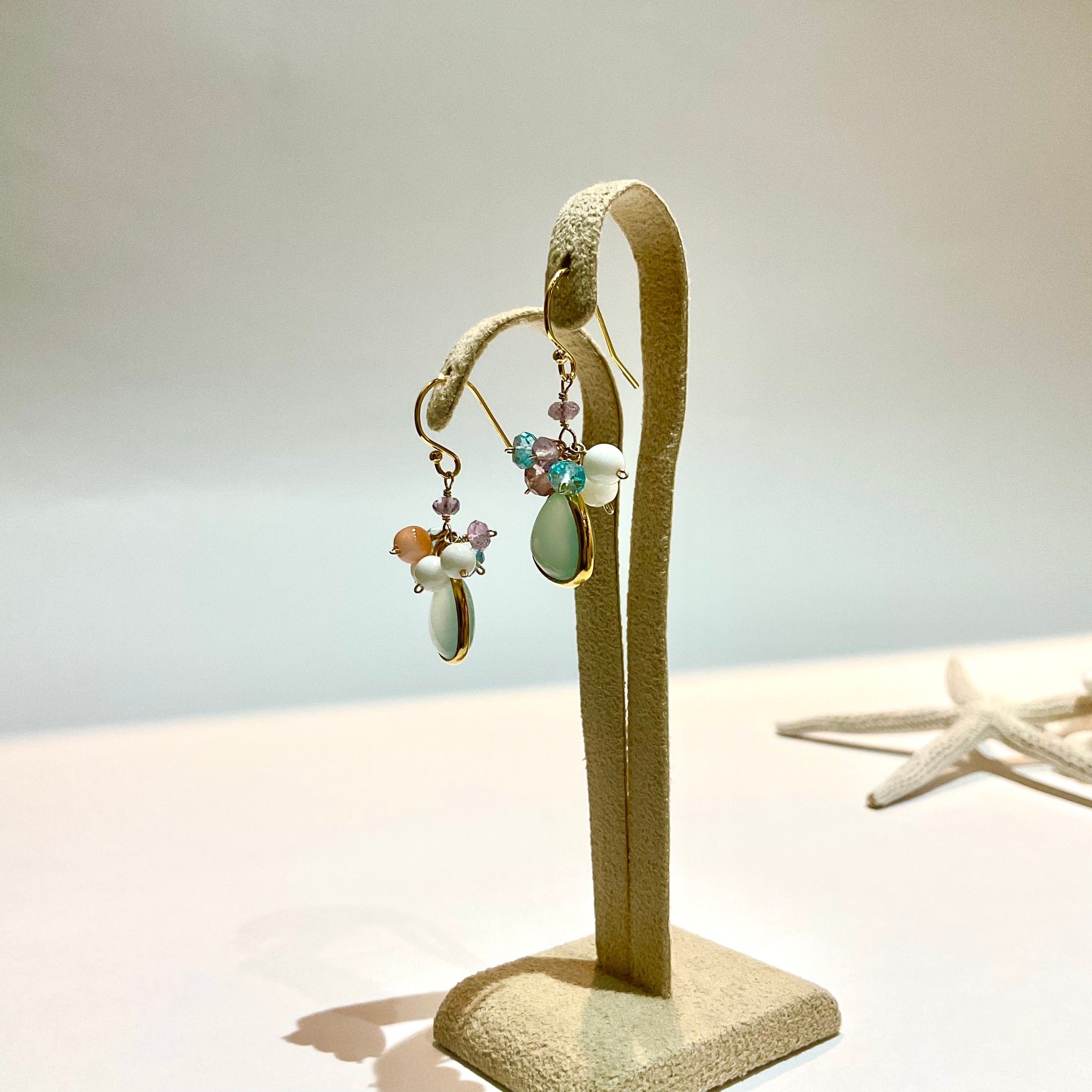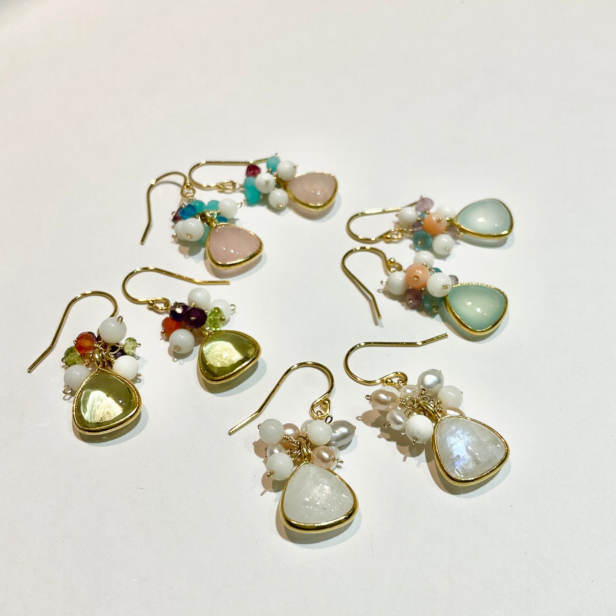 ぷっくりとした天然石に小さな天然石をあわせた、花束のようなカラフルでcuteなピアスです。
