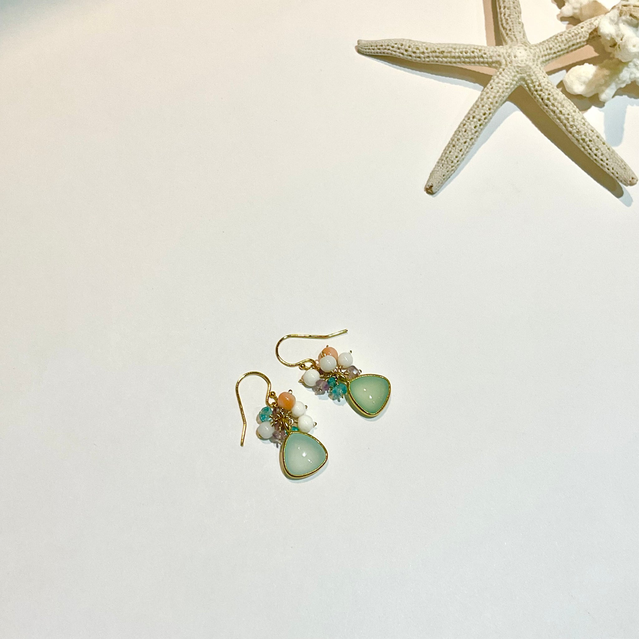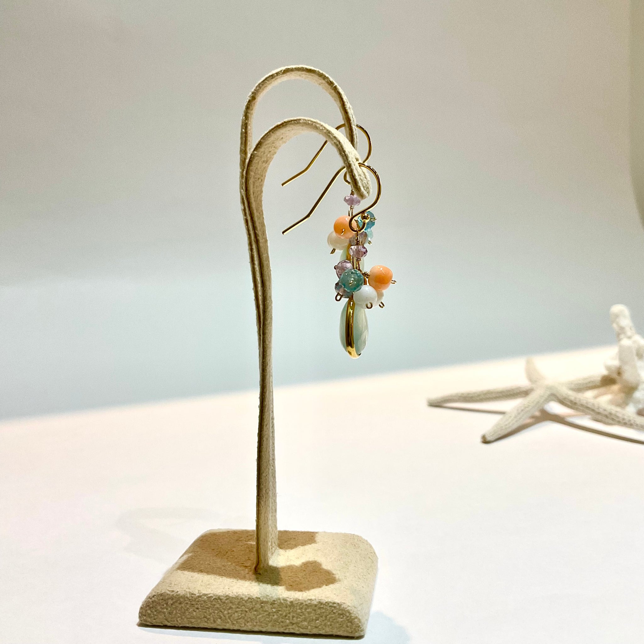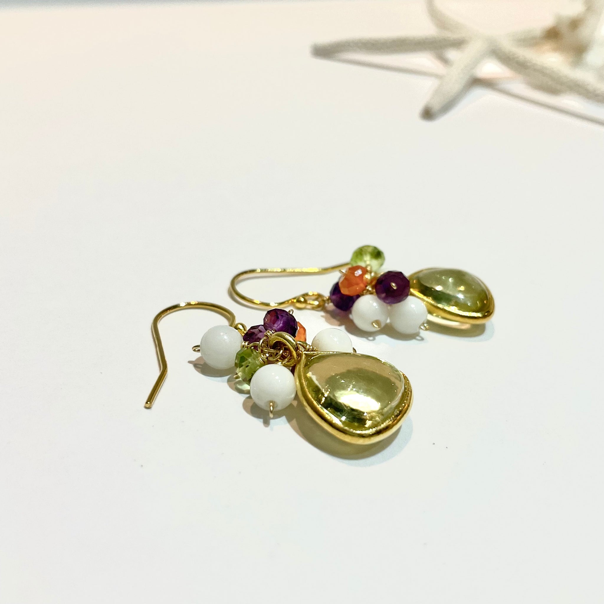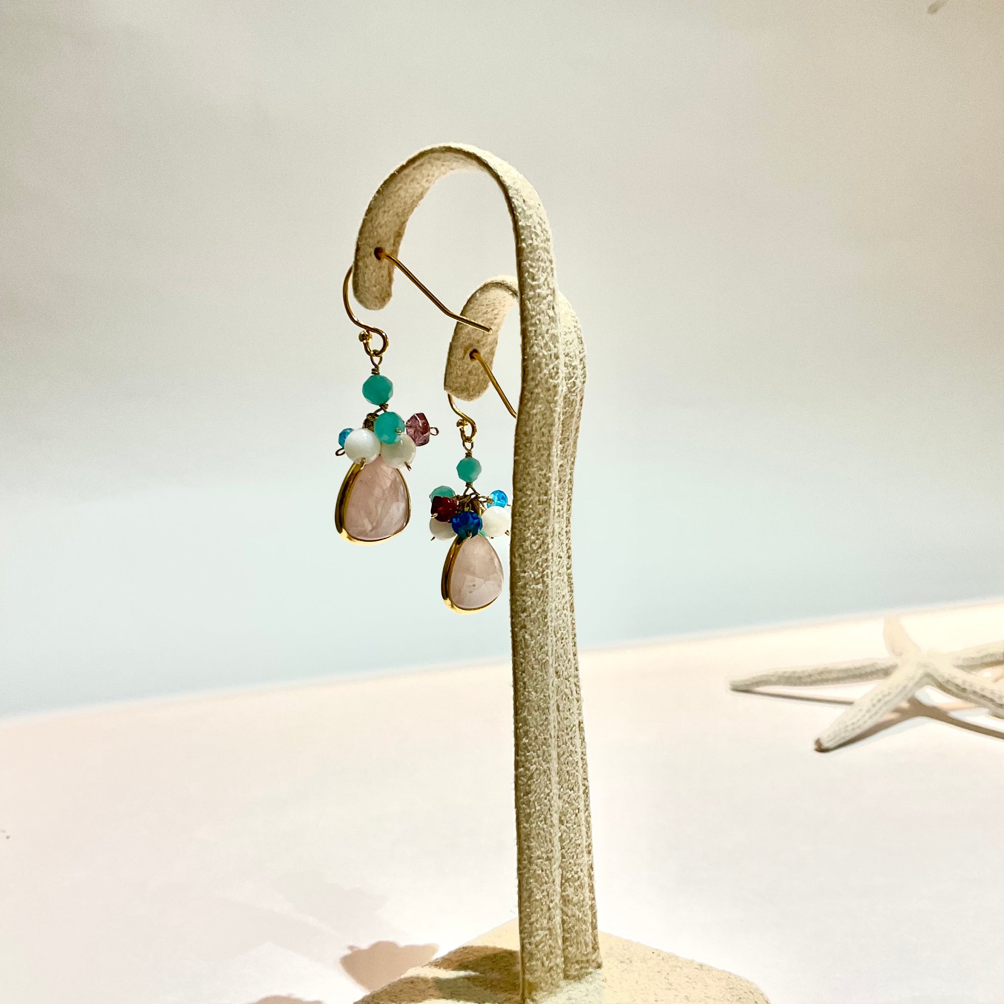 ぷっくりとした天然石に小さな天然石をあわせた、花束のようなカラフルでcuteなピアスです。