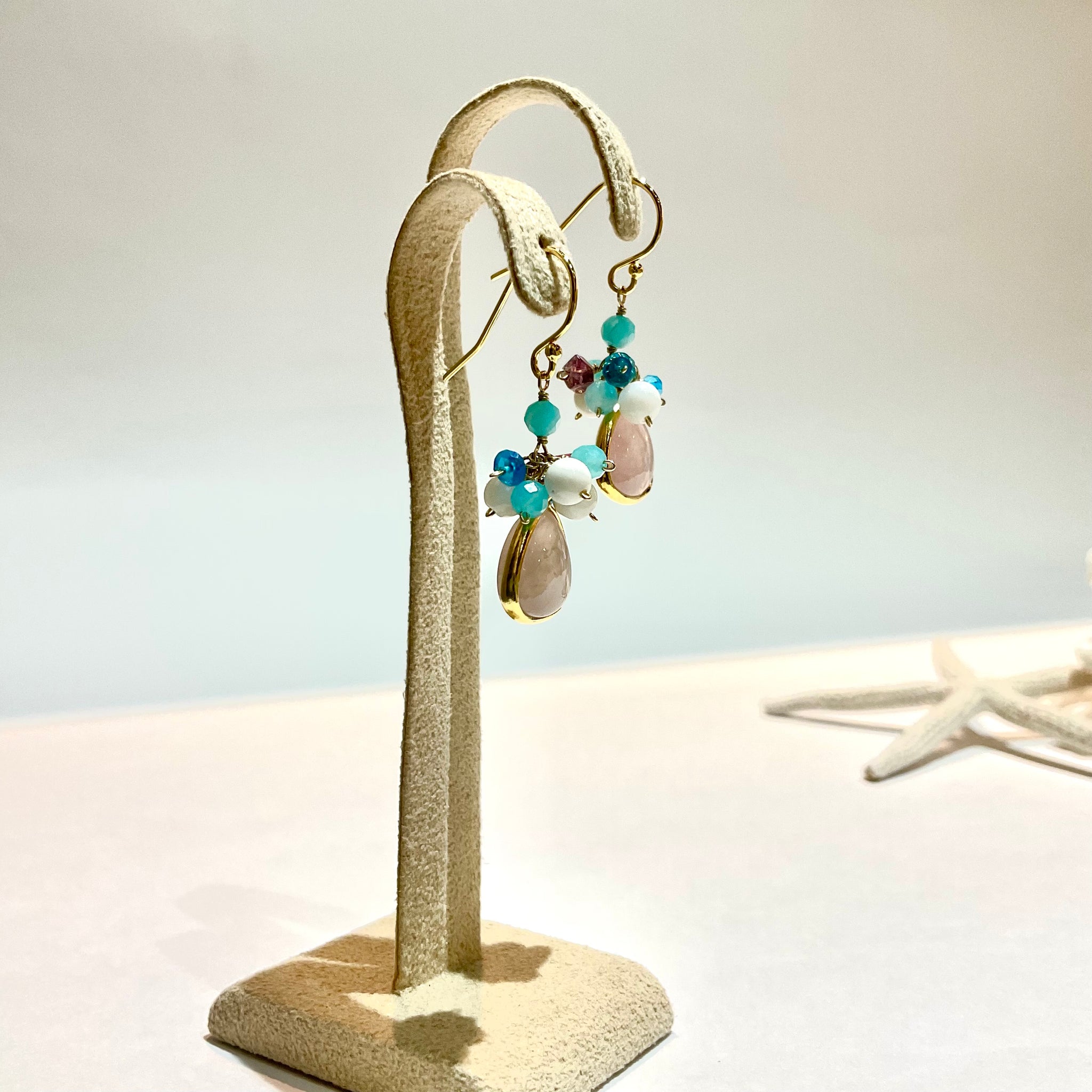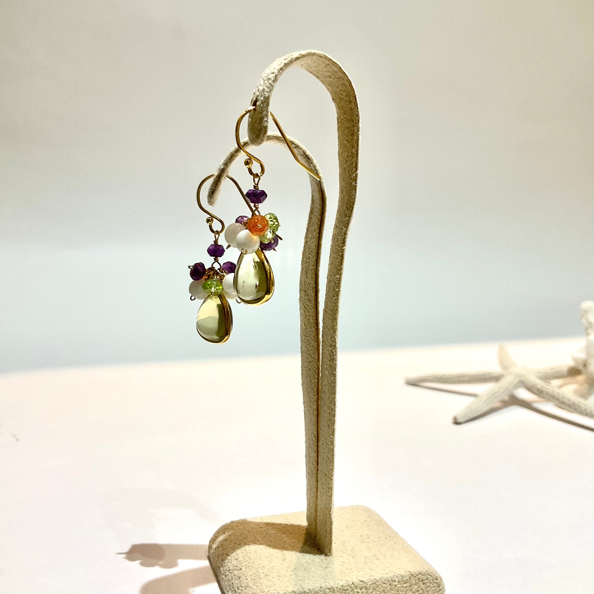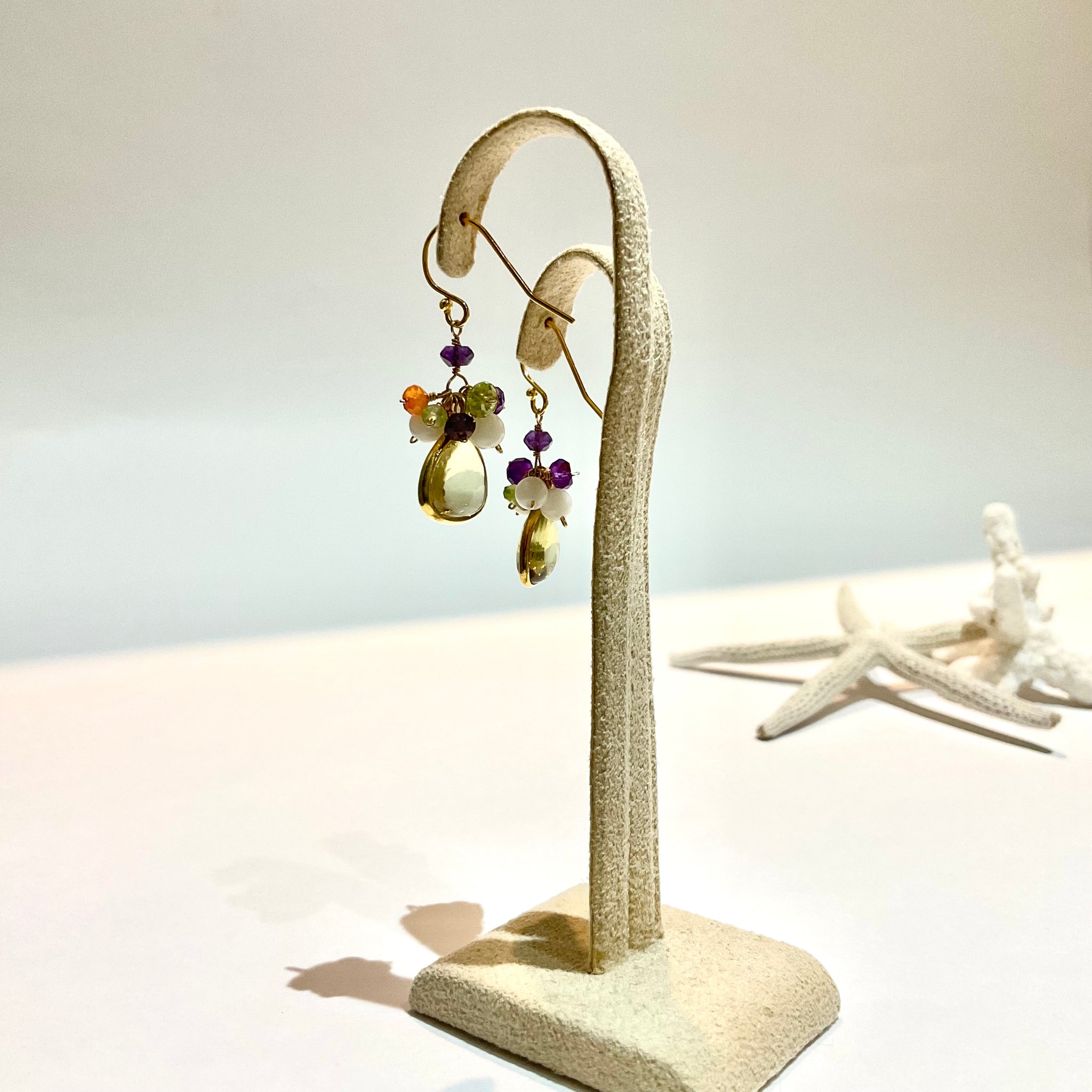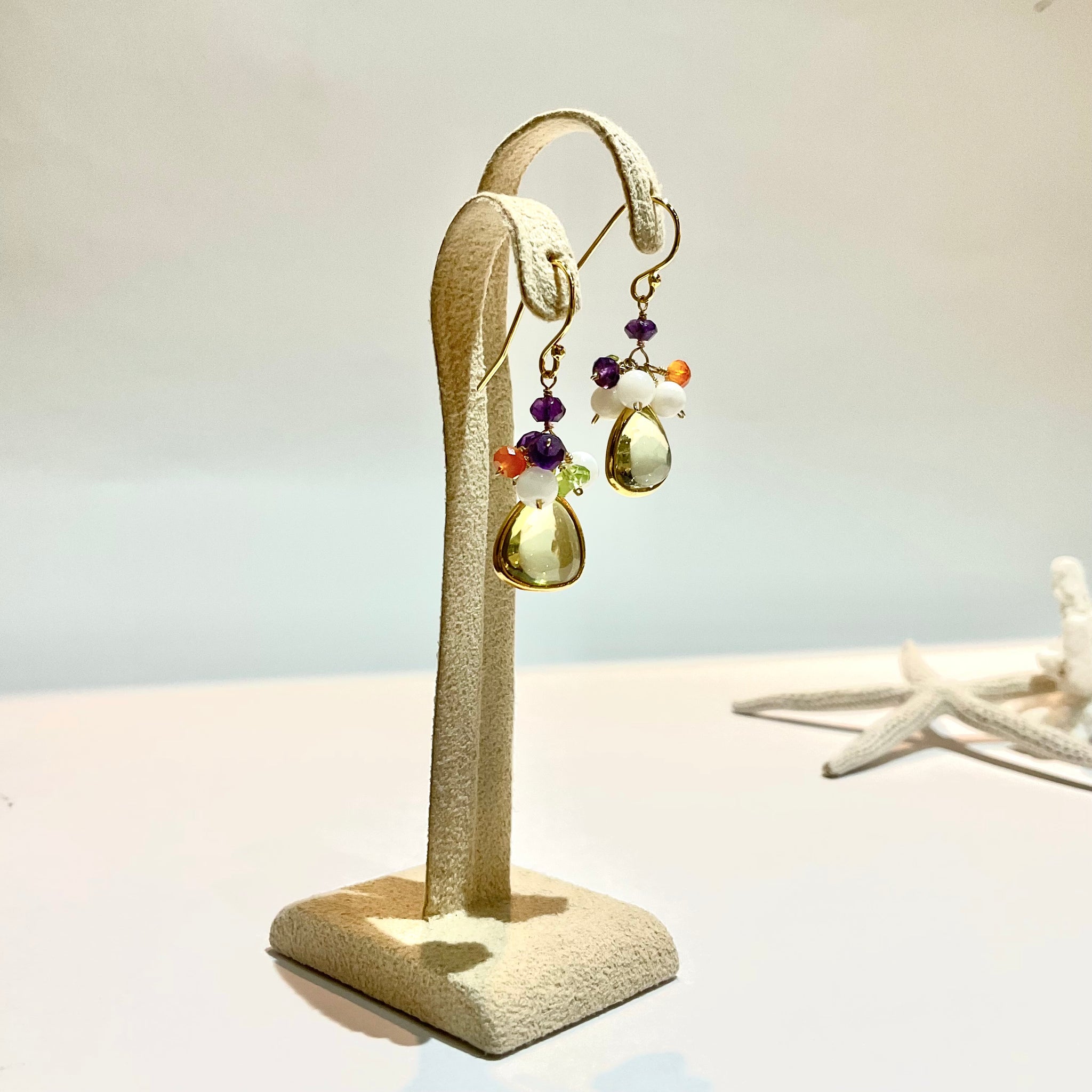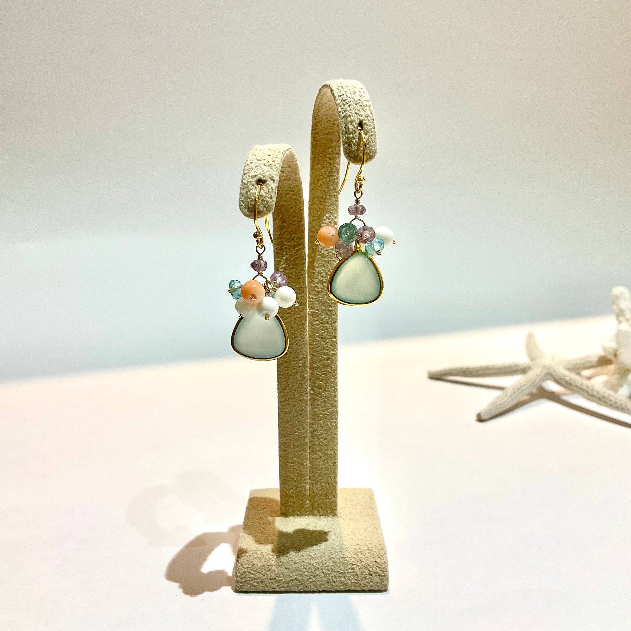 ぷっくりとした天然石に小さな天然石をあわせた、花束のようなカラフルでcuteなピアスです。