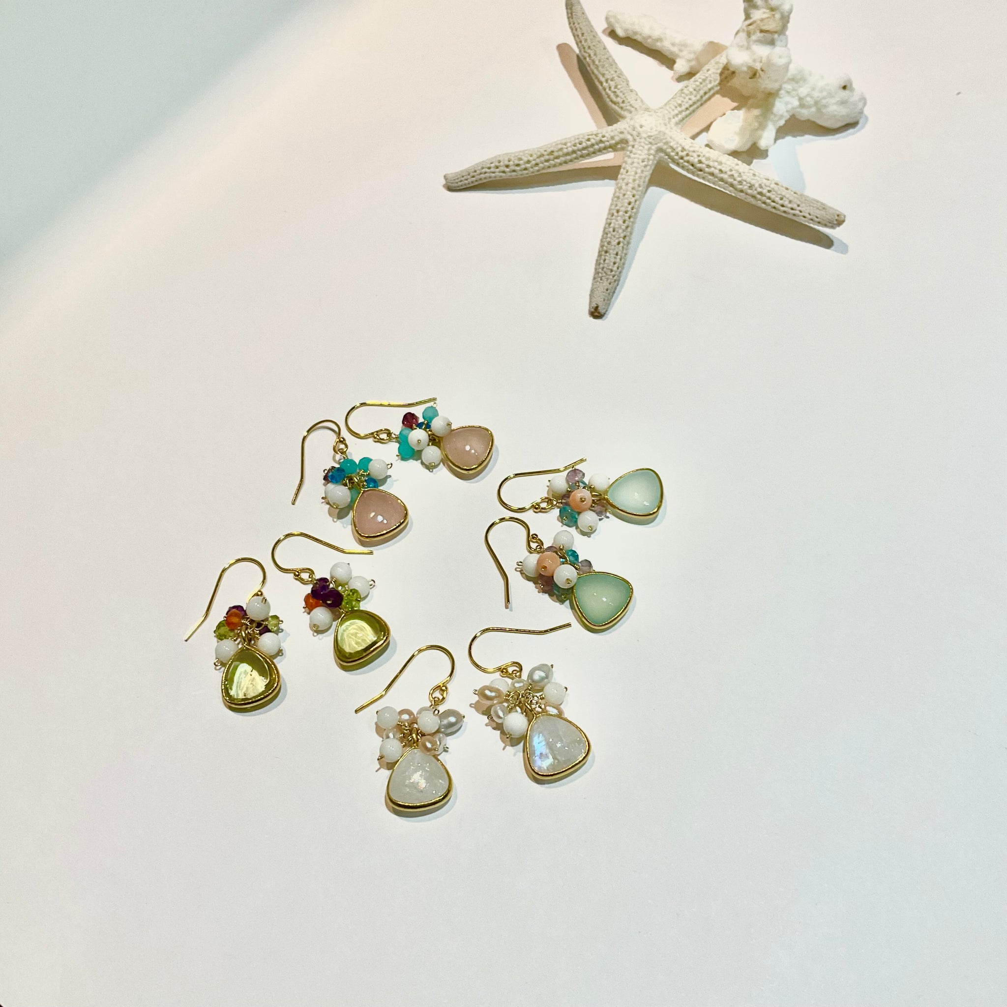 石名 ムーンストーン、・カルセドニー、ローズクォーツ、イエロークオーツ、白珊瑚、淡水パール、深海珊瑚、アパタイト、アメシスト、アマゾナイト、マルチスピネル、カーネリアン・ペリドット