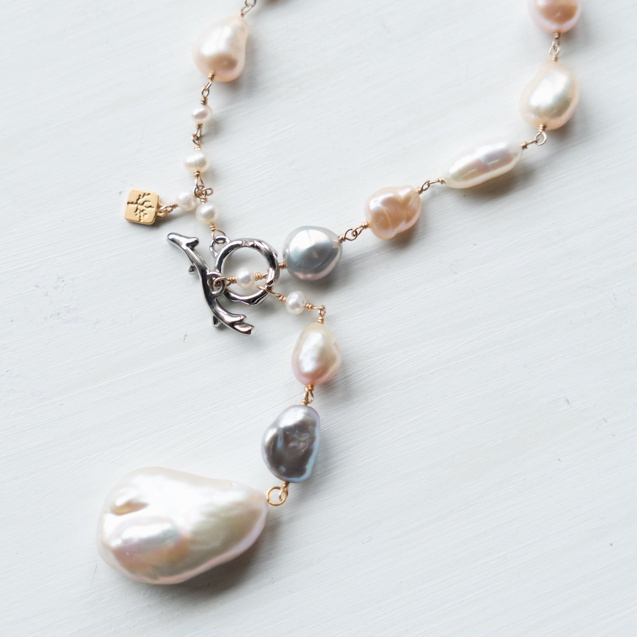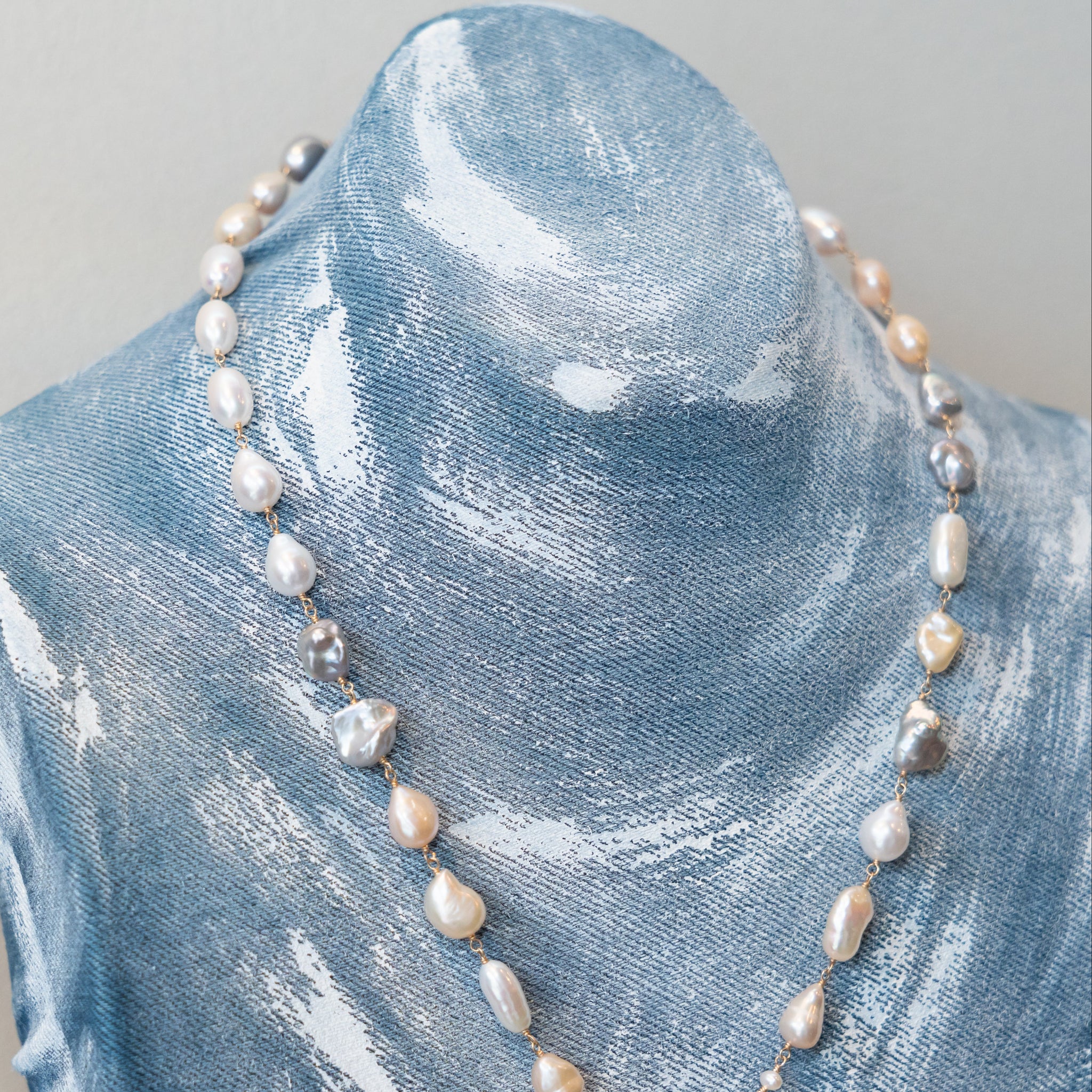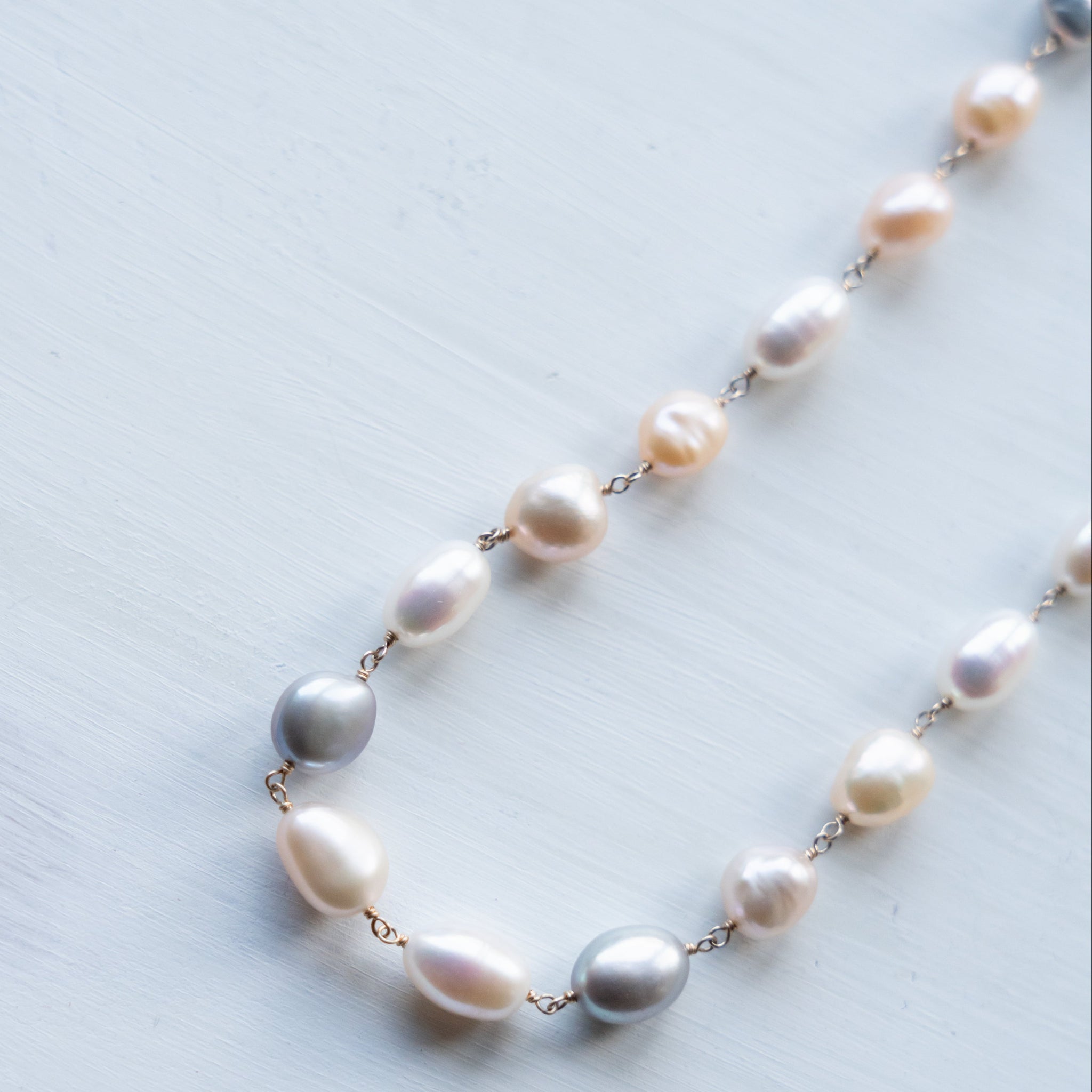 一つひとつの形やカラーが異なる淡水パールをランダムに組み合わせた