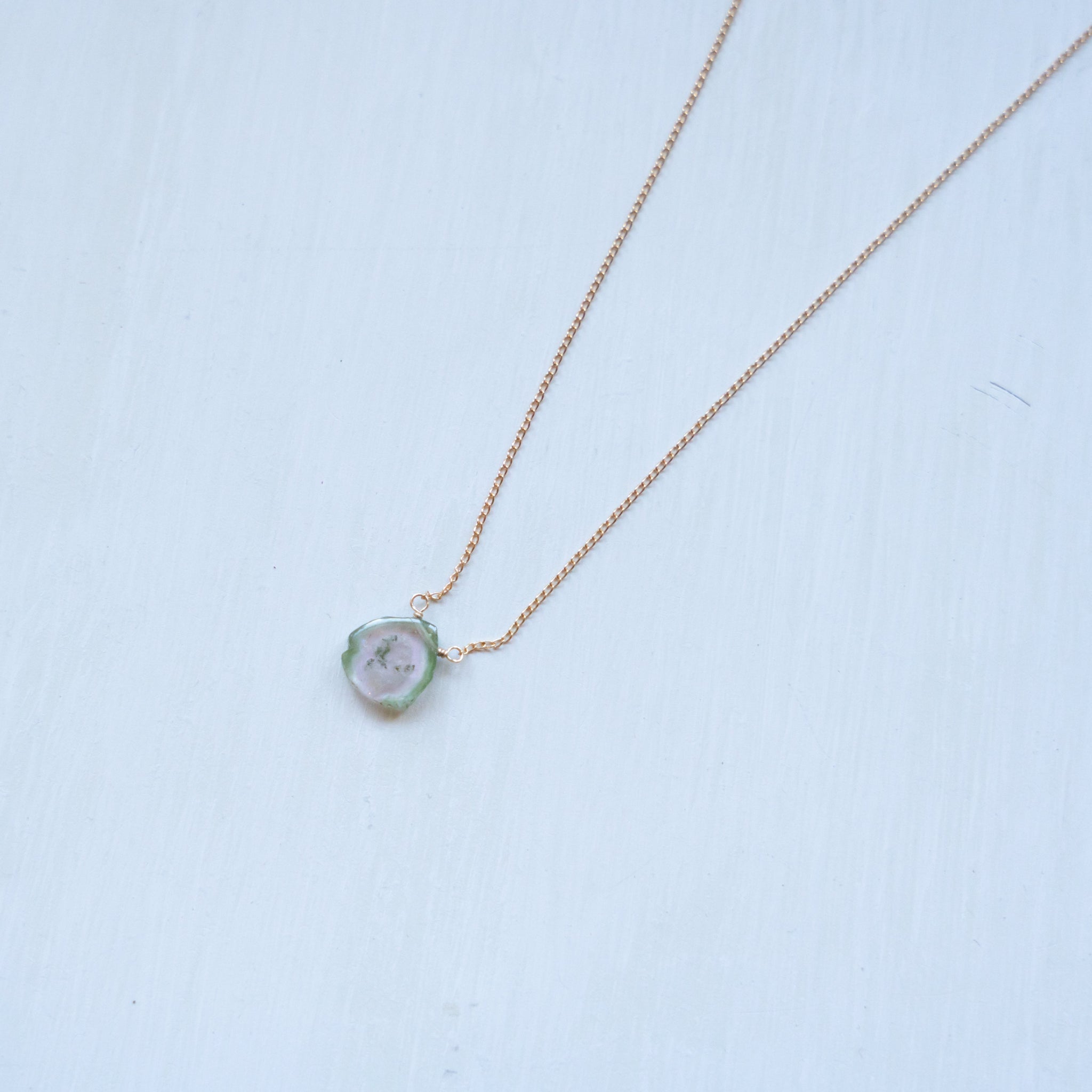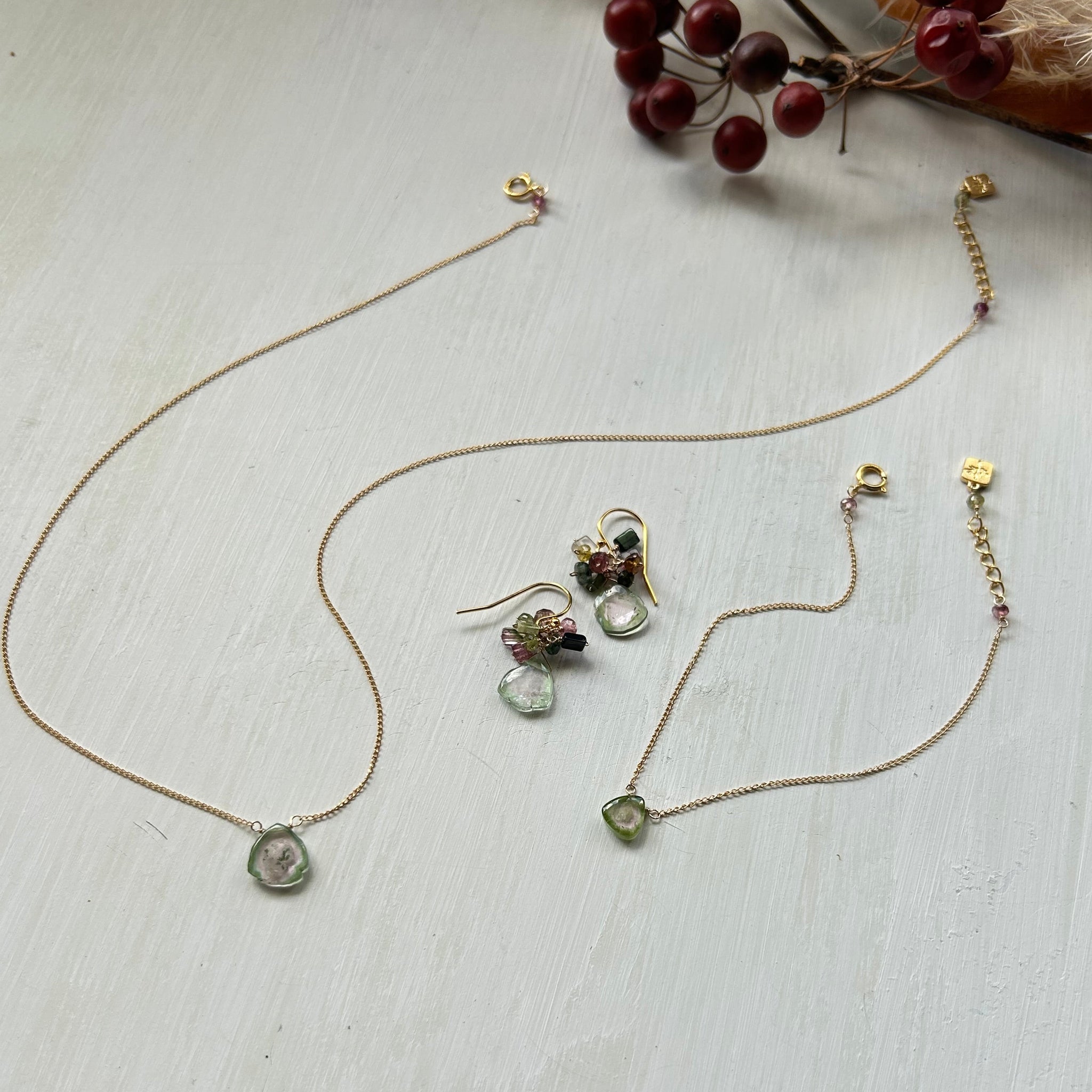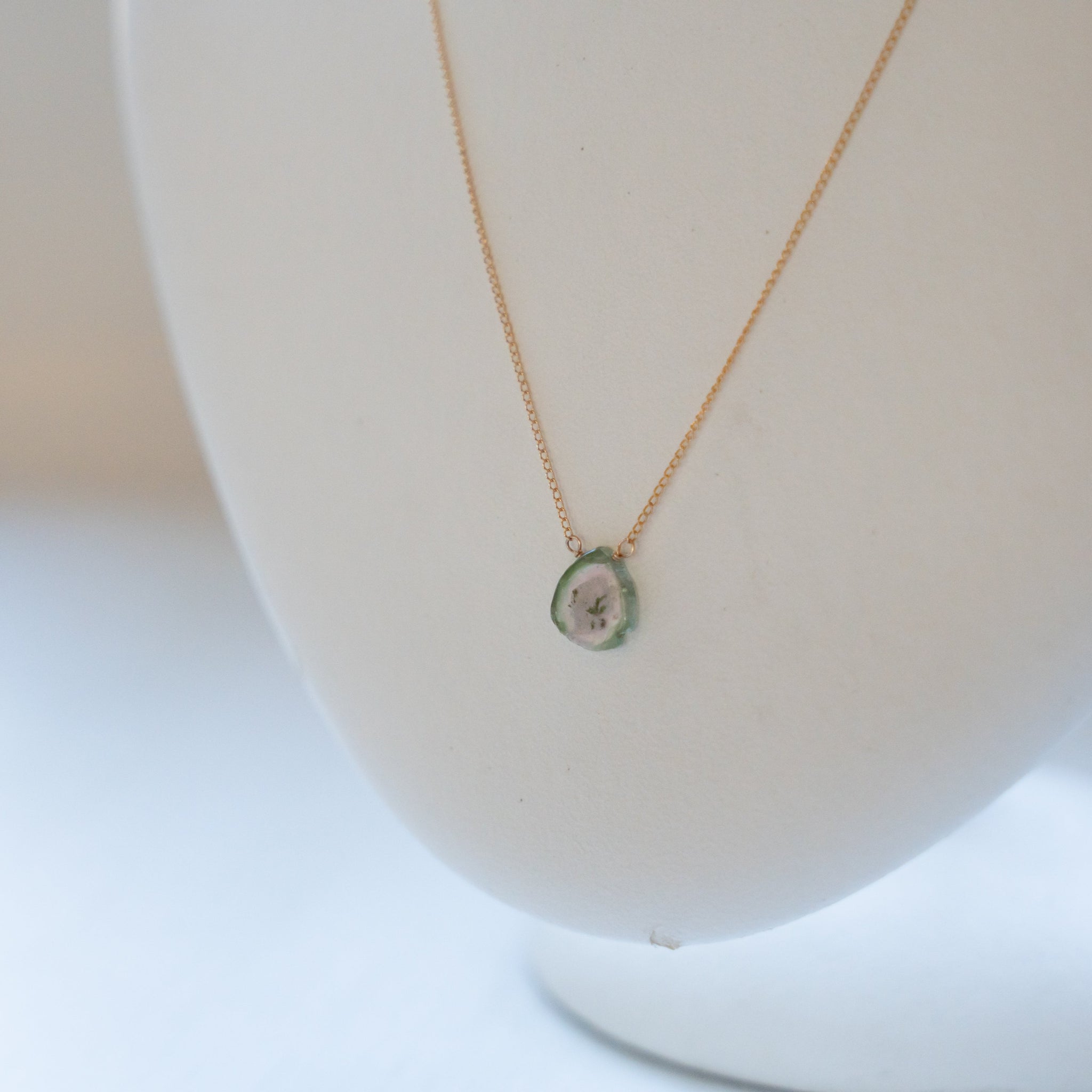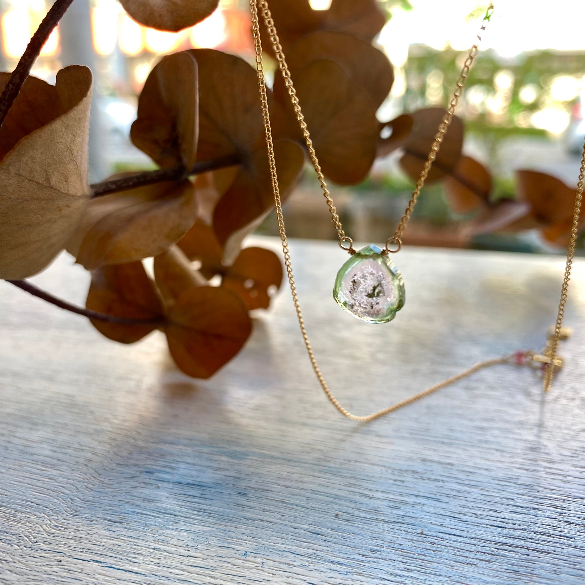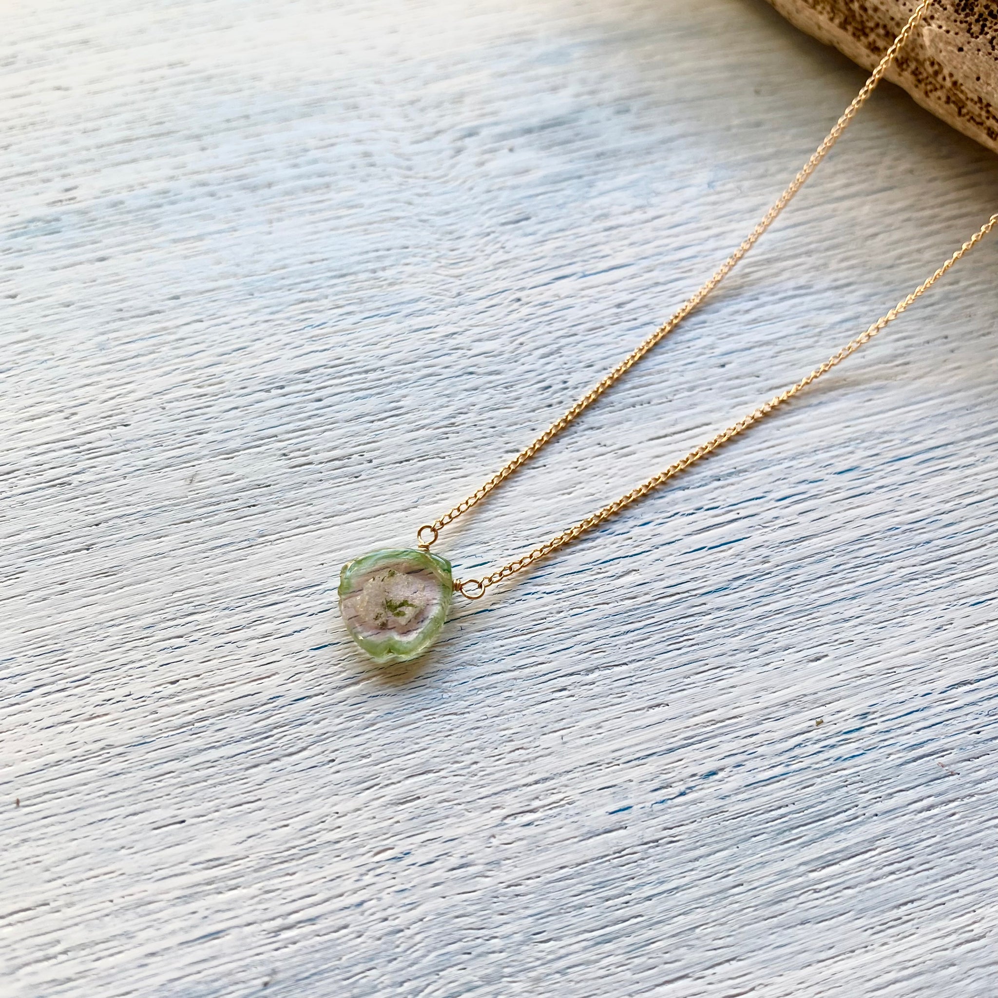 こちらのネックレスには、『ウォーターメロントルマリン』を選びました。その名の通り「スイカ」のように外側が緑色、内側がピンク色になっている、とてもユニークなトルマリンです。