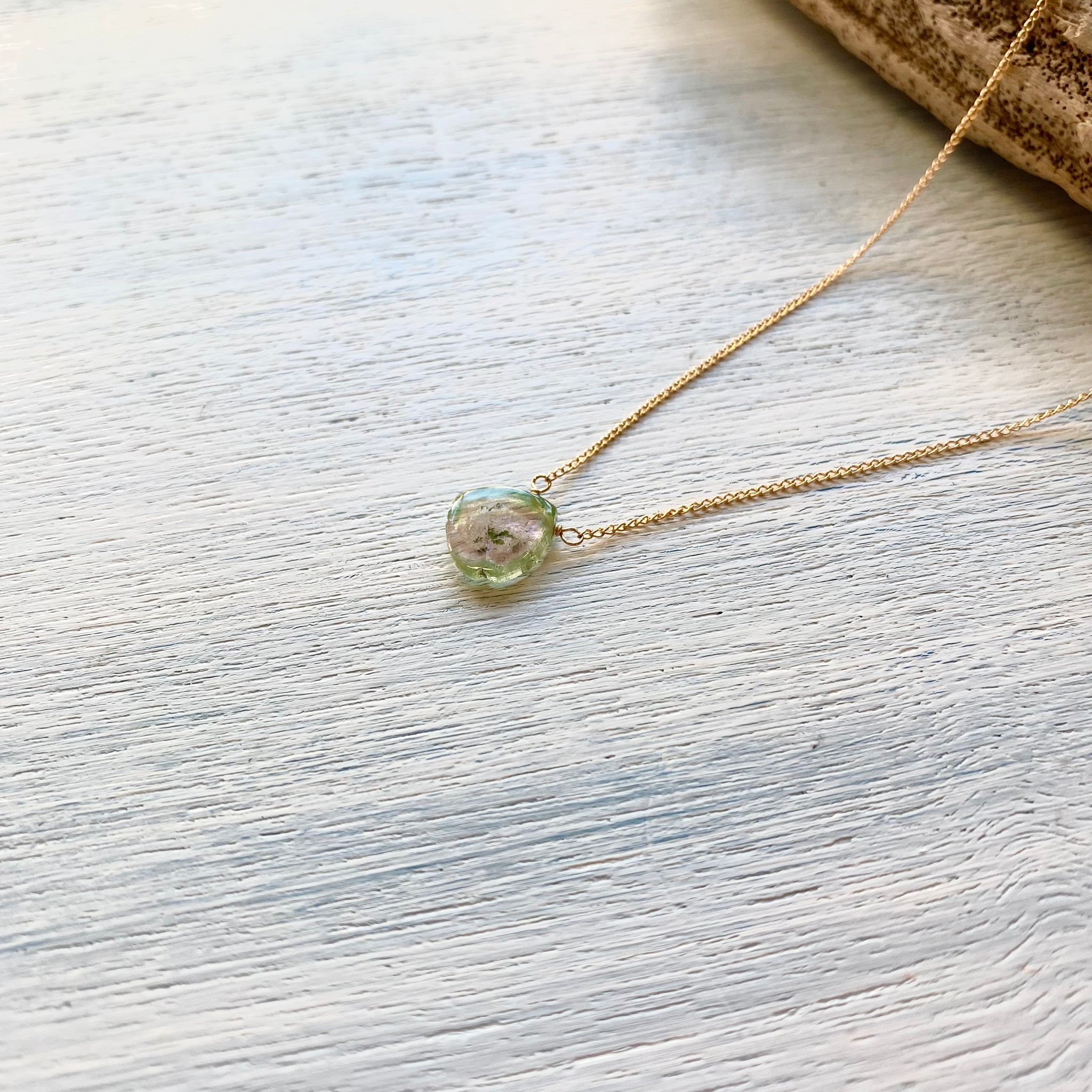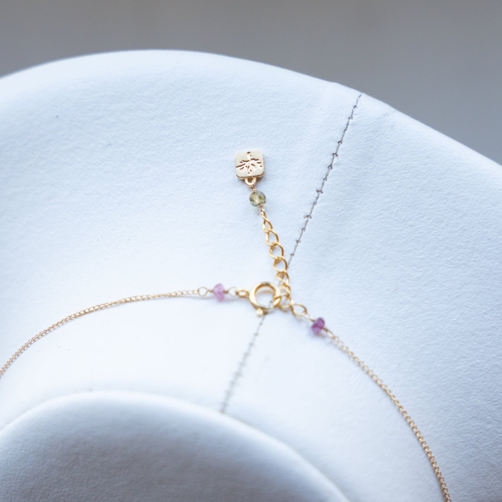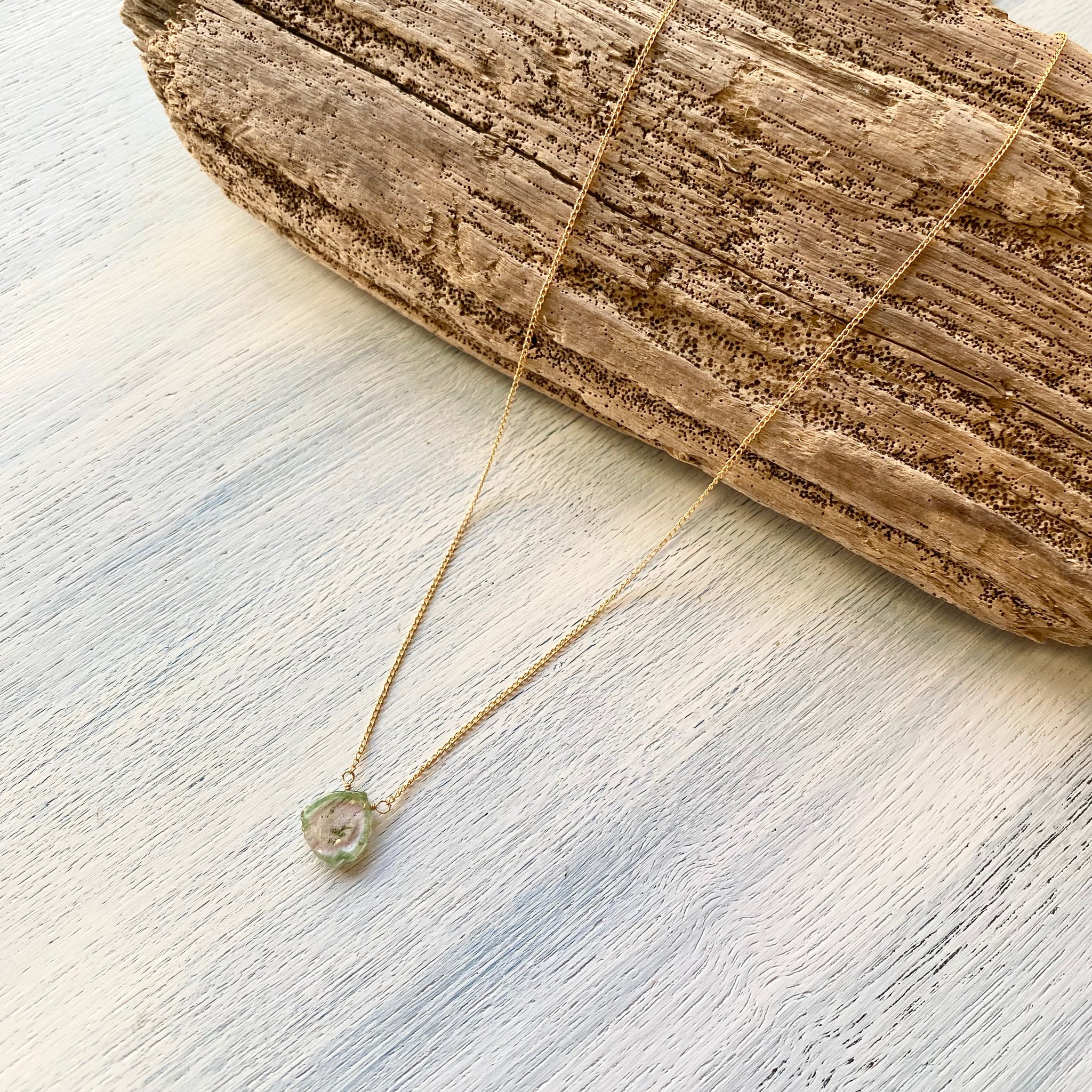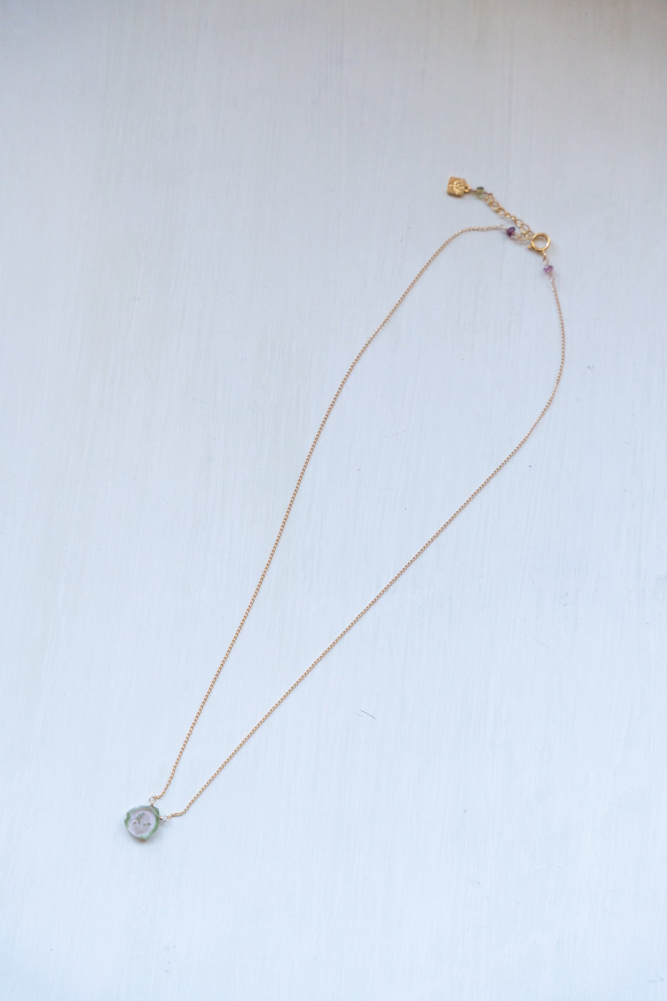 こちらのネックレスには、『ウォーターメロントルマリン』を選びました。その名の通り「スイカ」のように外側が緑色、内側がピンク色になっている、とてもユニークなトルマリンです。