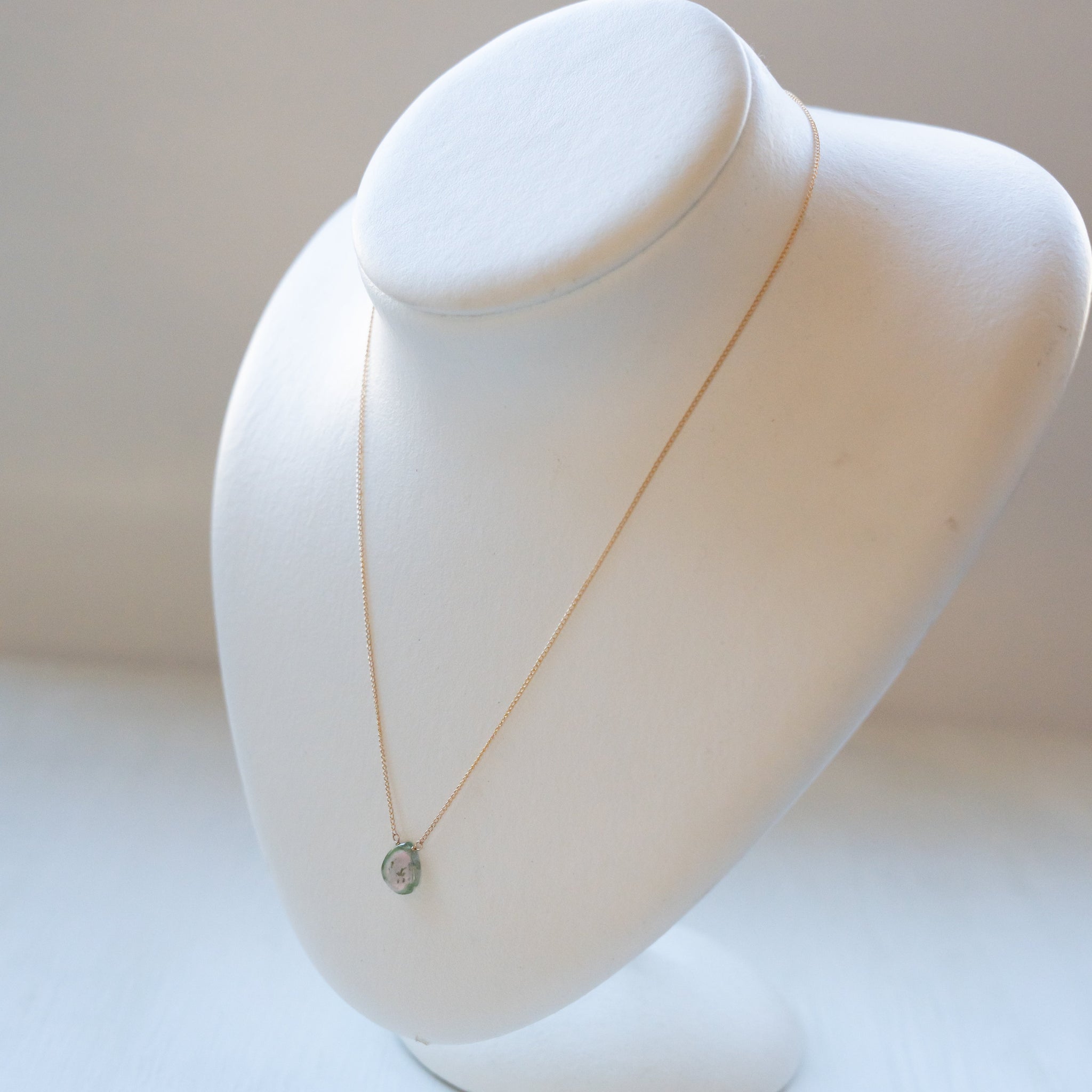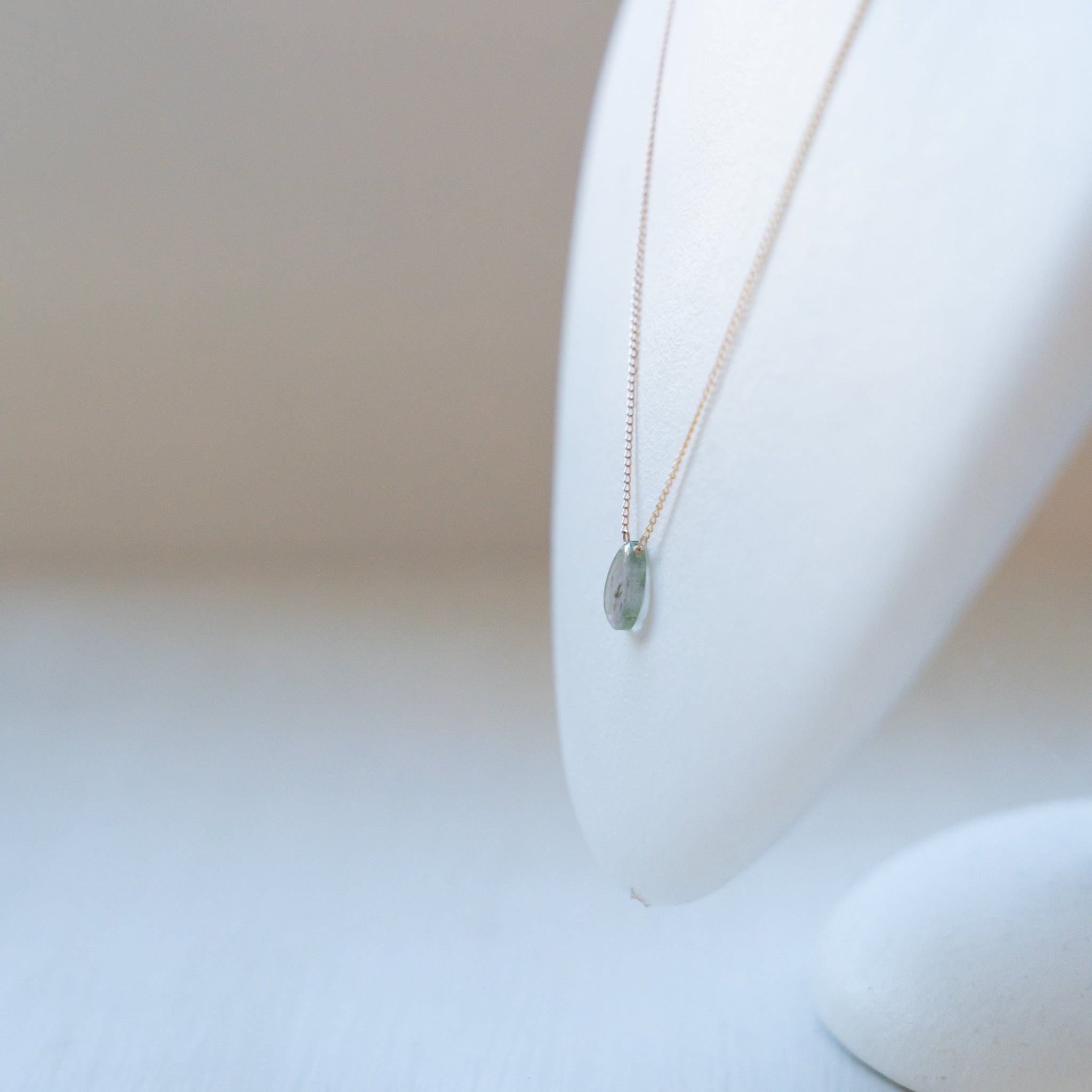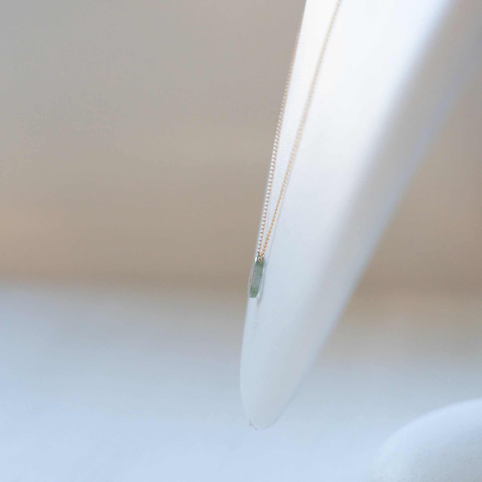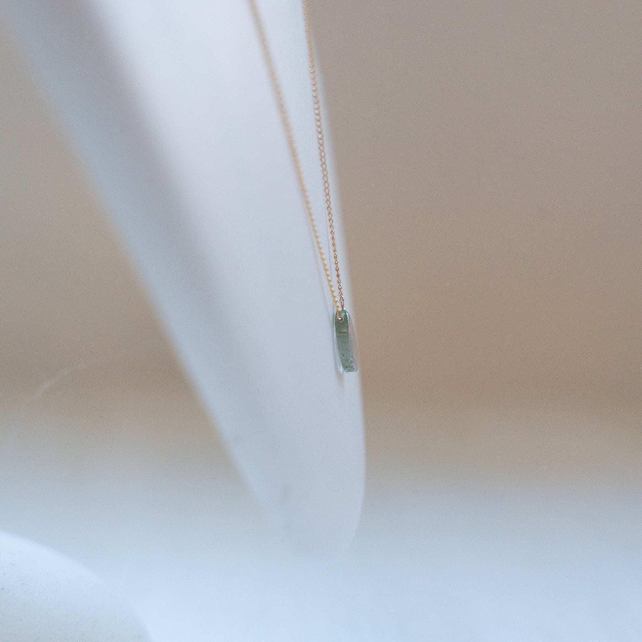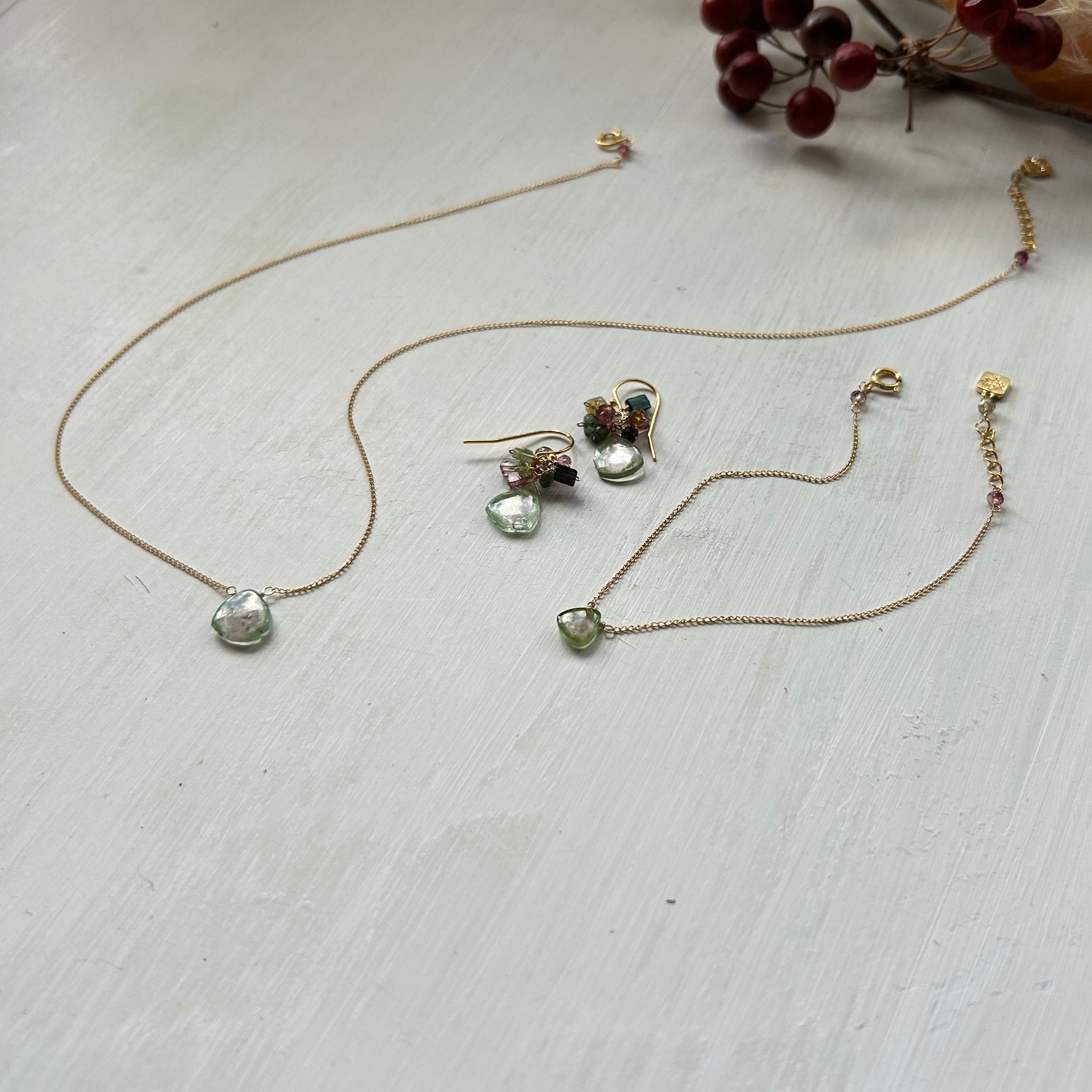 こちらのネックレスには、『ウォーターメロントルマリン』を選びました。その名の通り「スイカ」のように外側が緑色、内側がピンク色になっている、とてもユニークなトルマリンです。