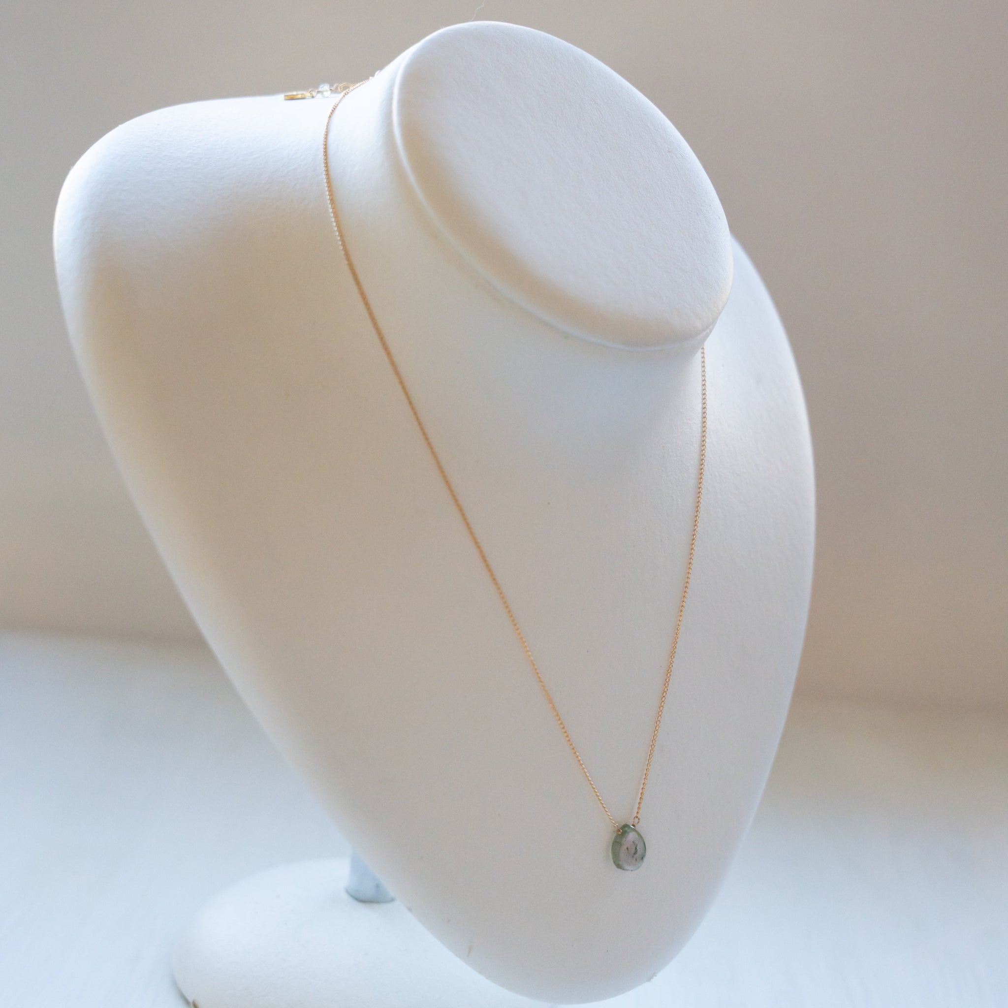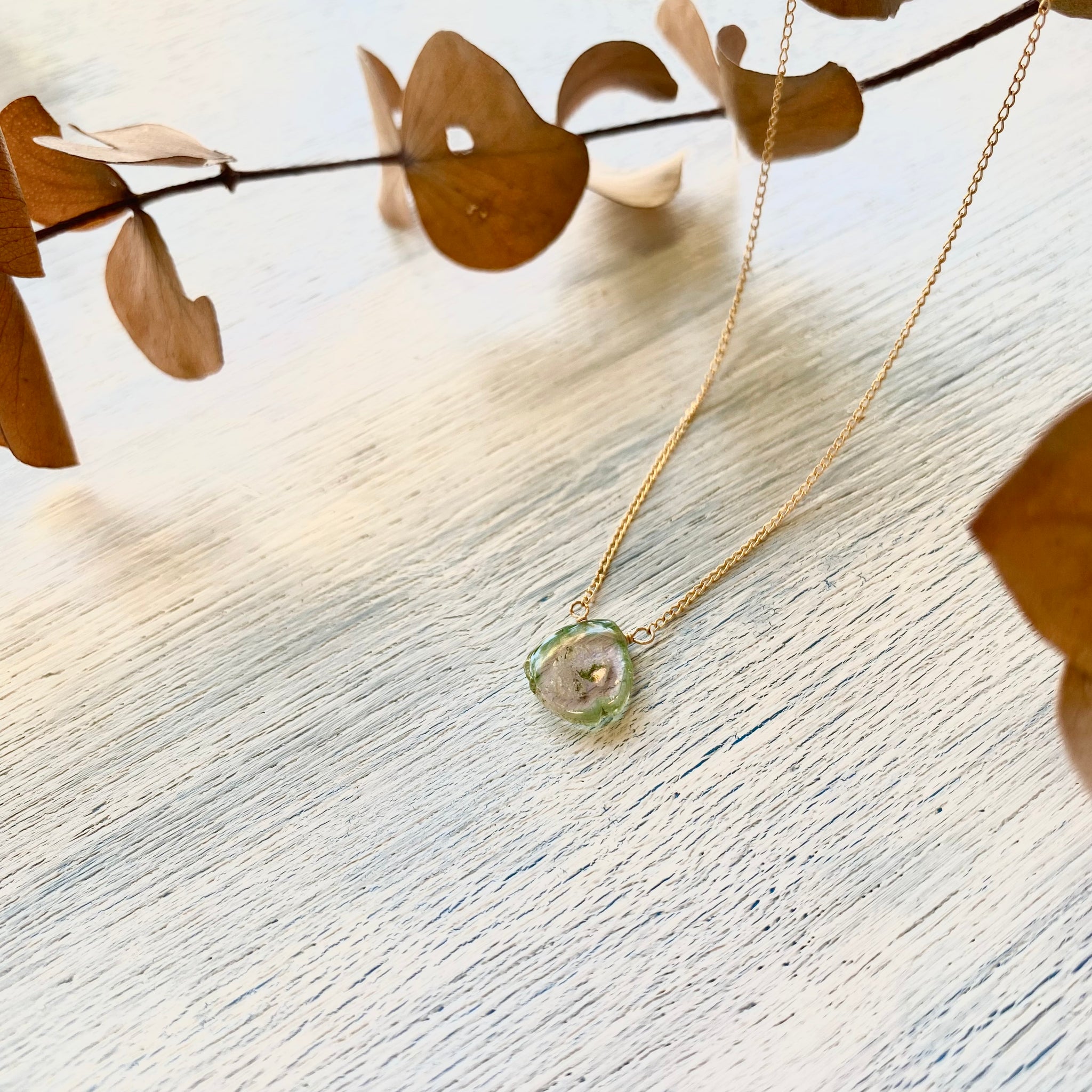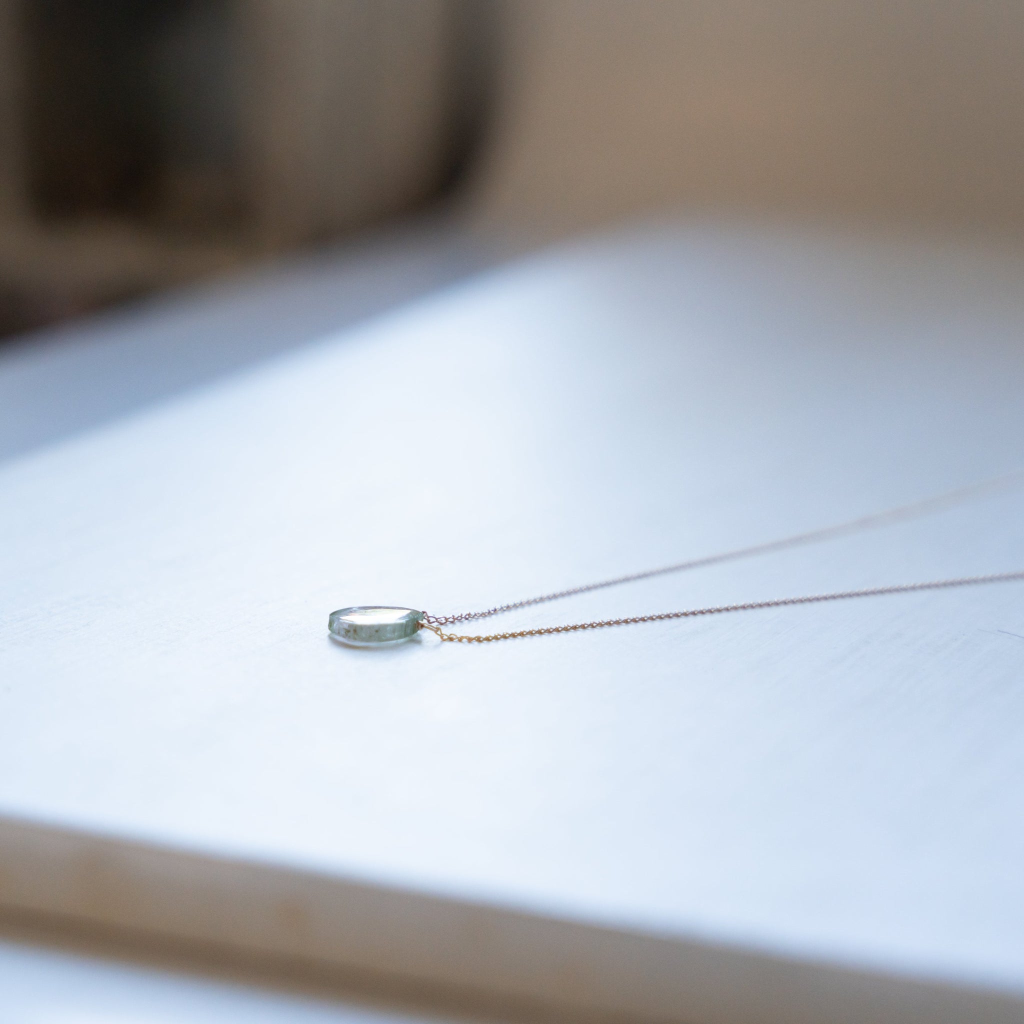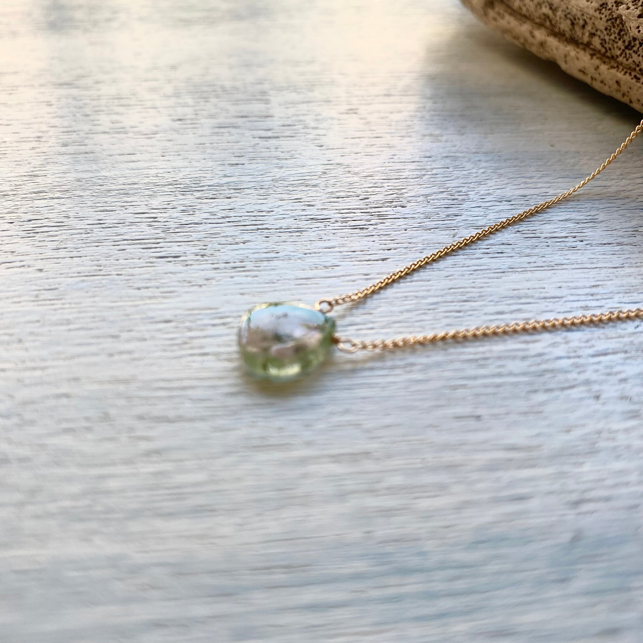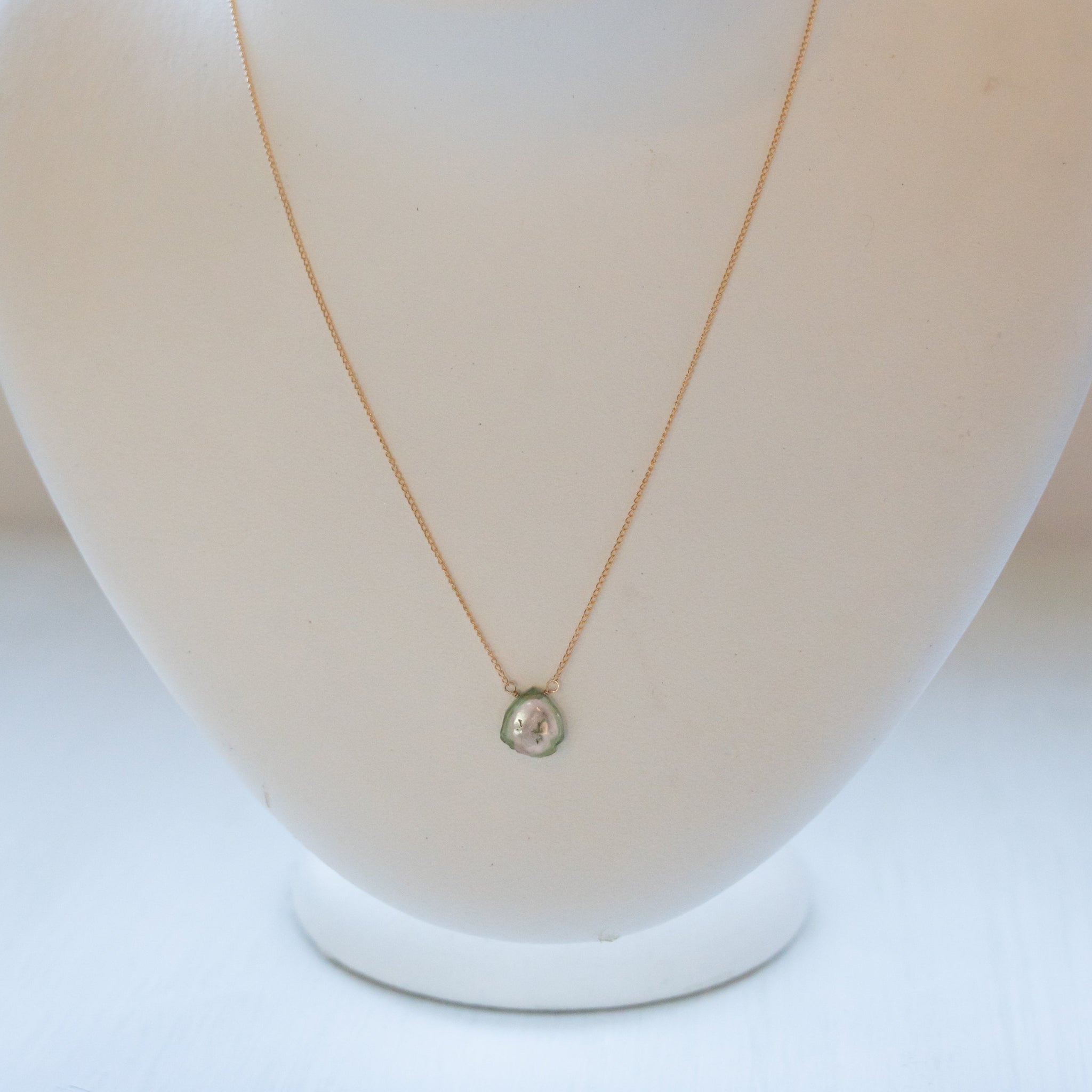 こちらのネックレスには、『ウォーターメロントルマリン』を選びました。その名の通り「スイカ」のように外側が緑色、内側がピンク色になっている、とてもユニークなトルマリンです。