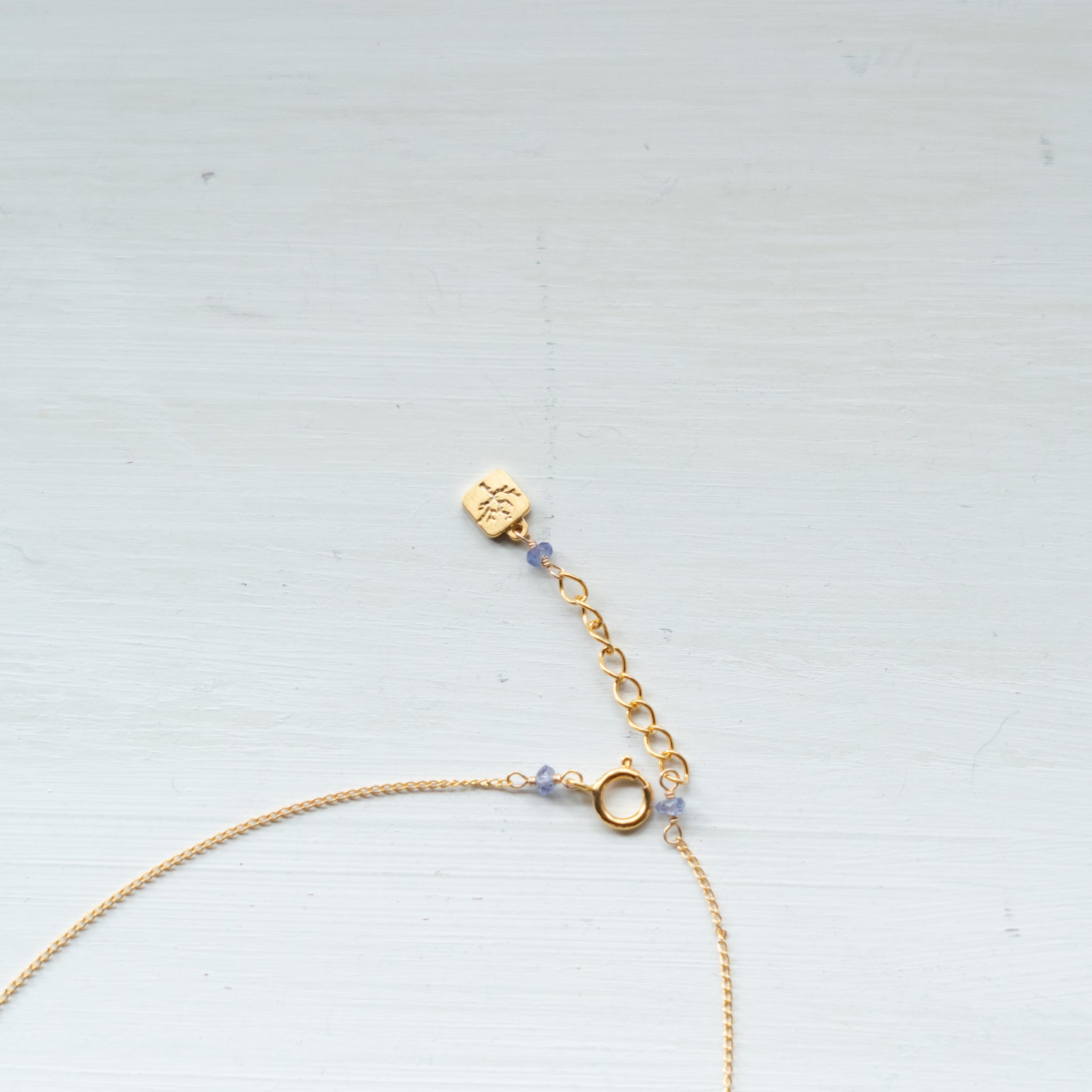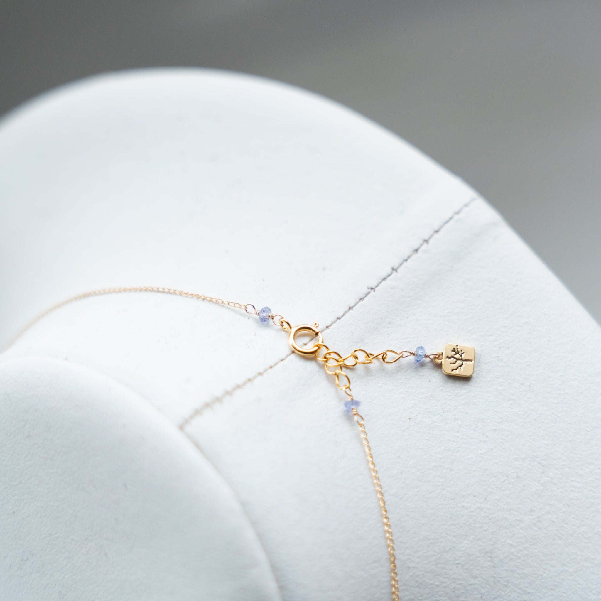 金具側とロゴプレートにも、同じく12月の誕生石のタンザナイトを使用しています。