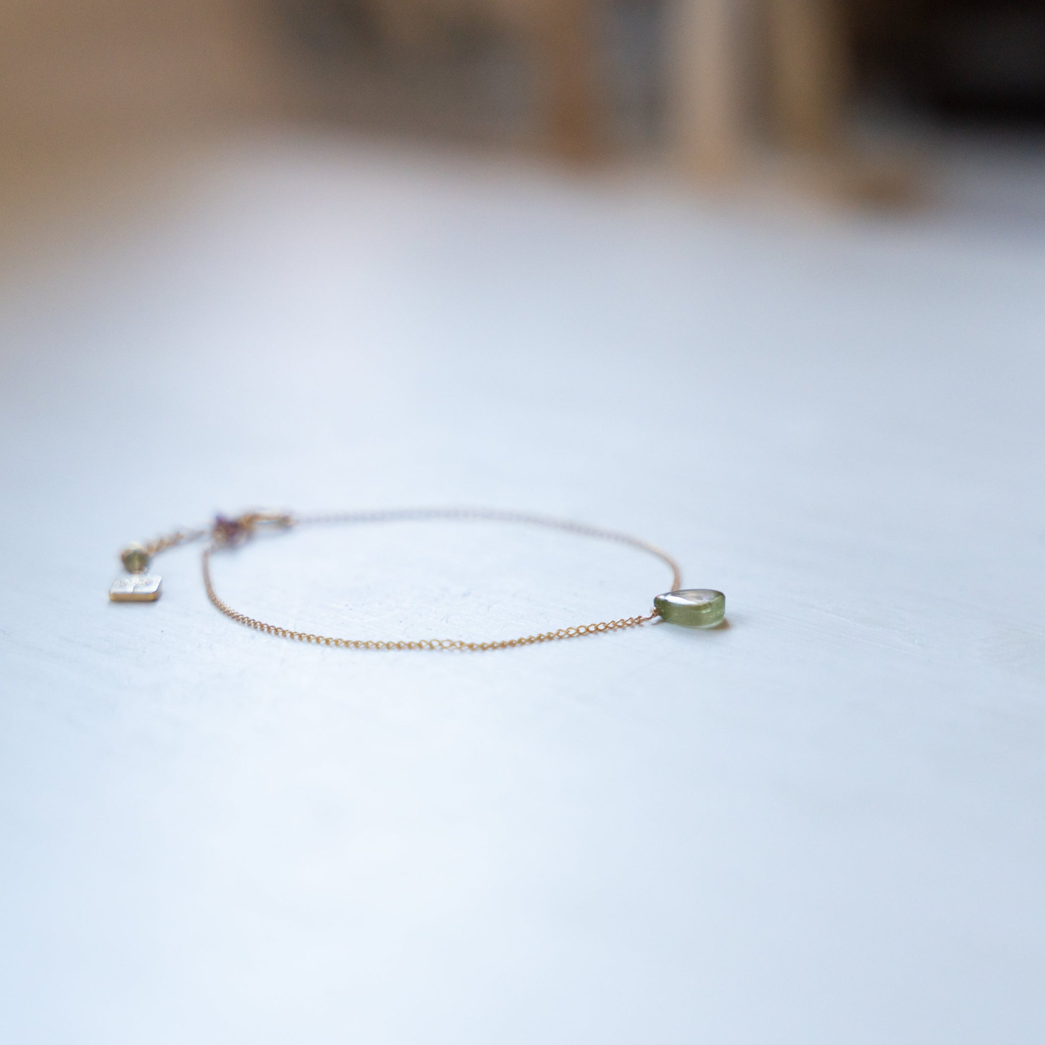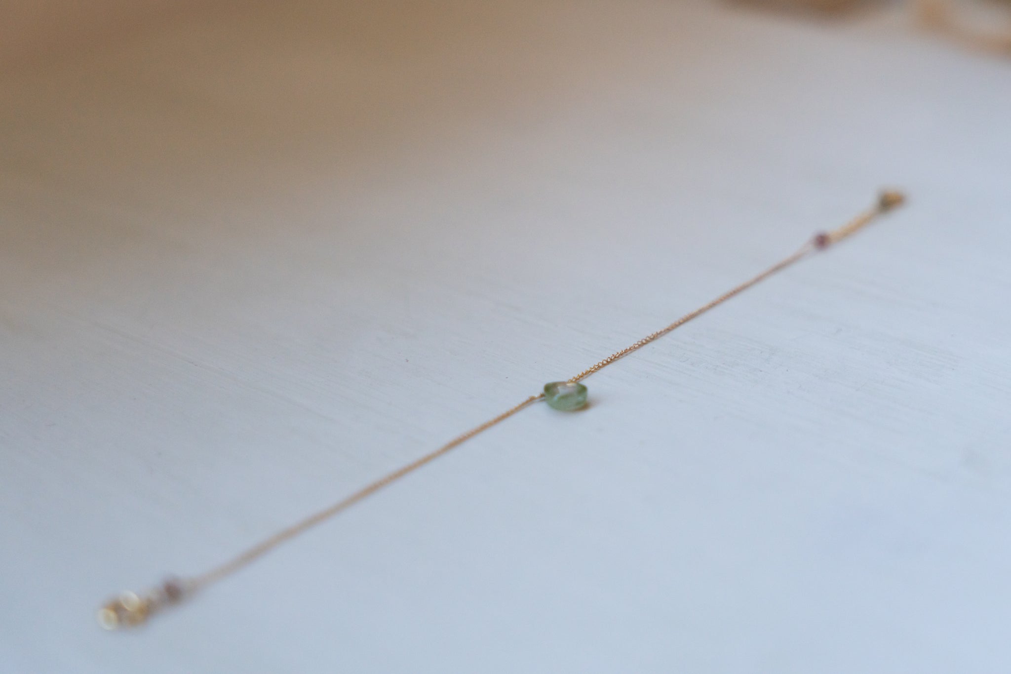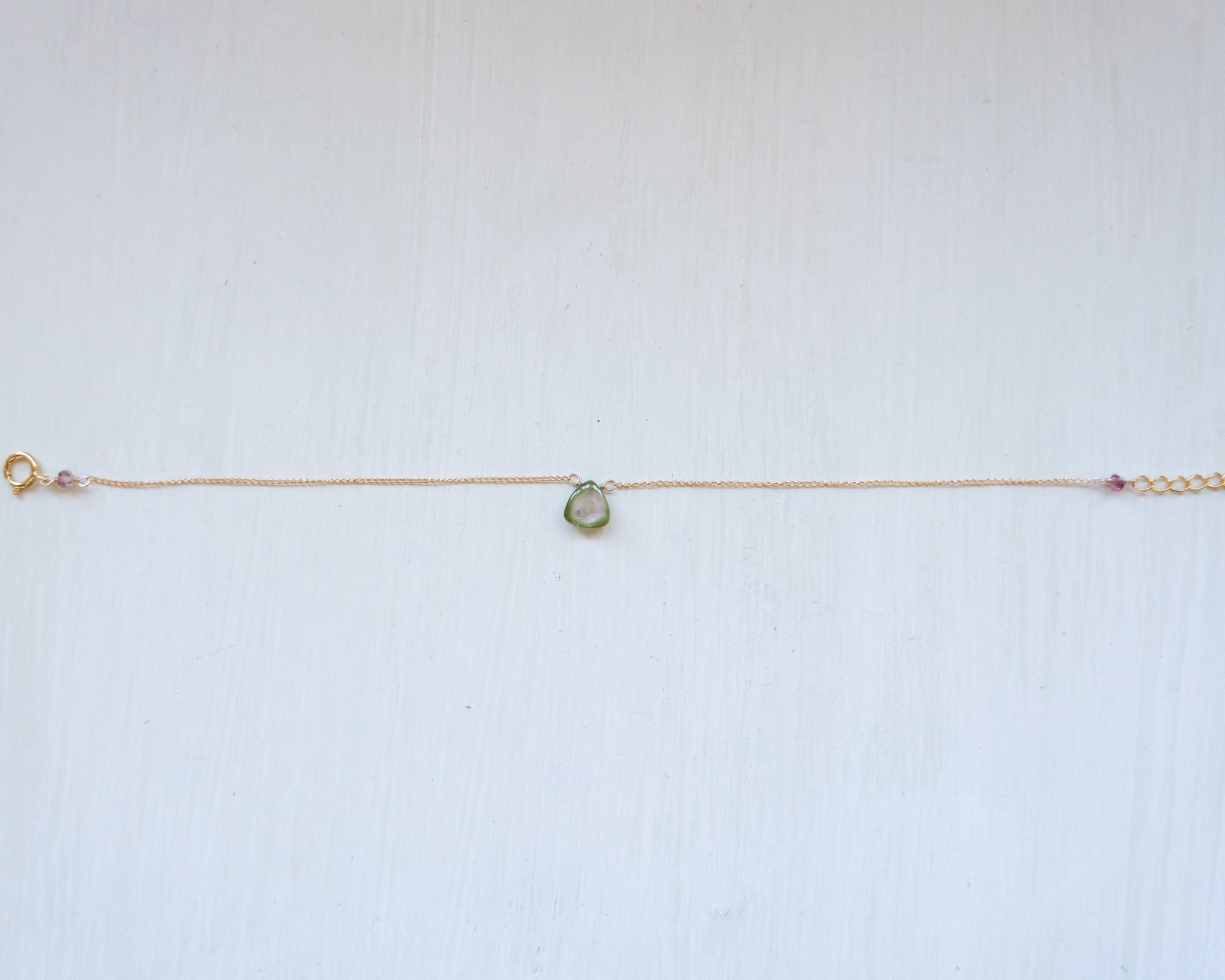 こちらのブレスレットには、『ウォーターメロントルマリン』を選びました。その名の通り「スイカ」のように外側が緑色、内側がピンク色になっている、とてもユニークなトルマリンです。
