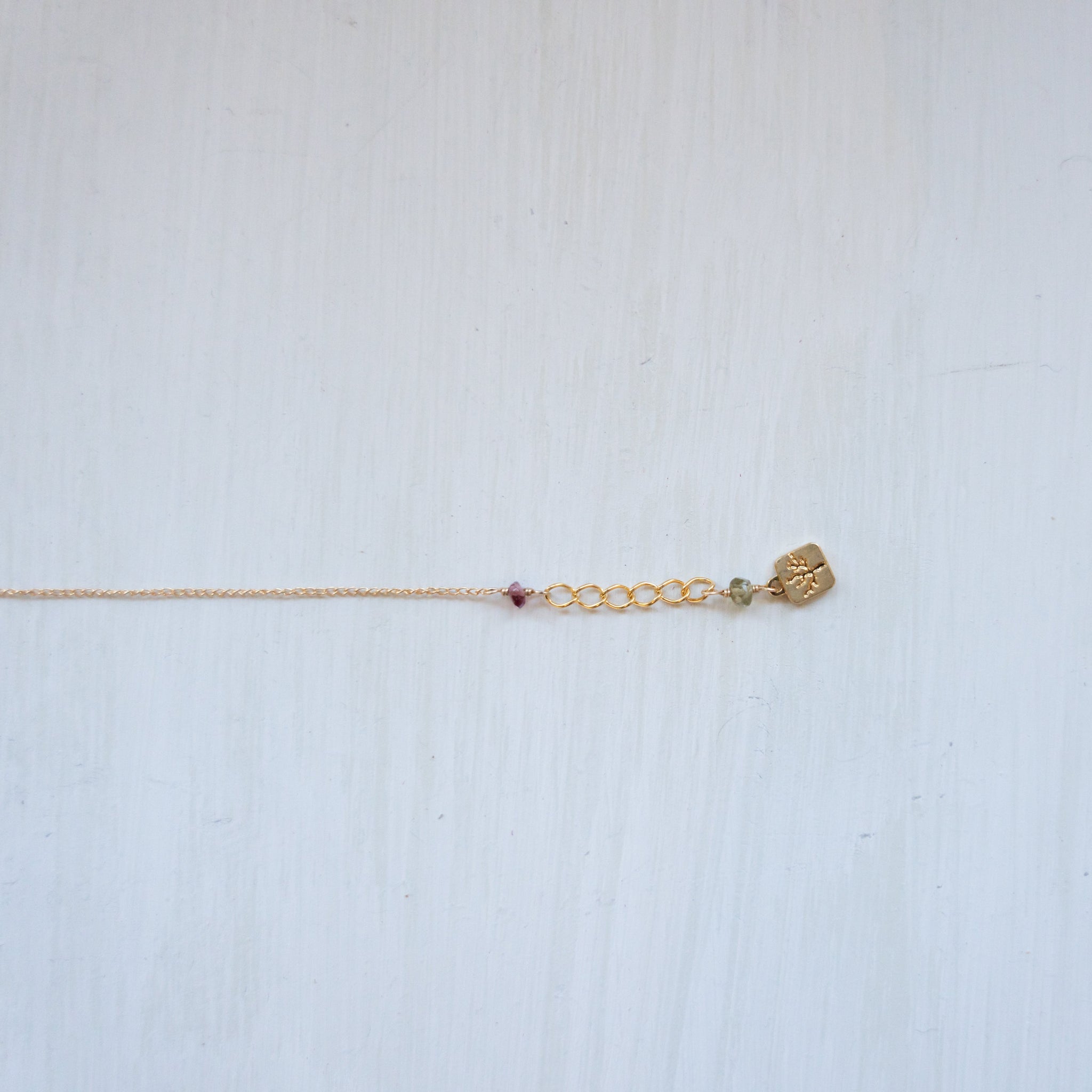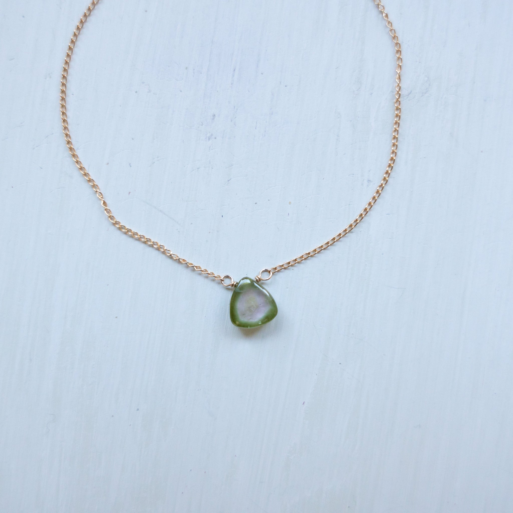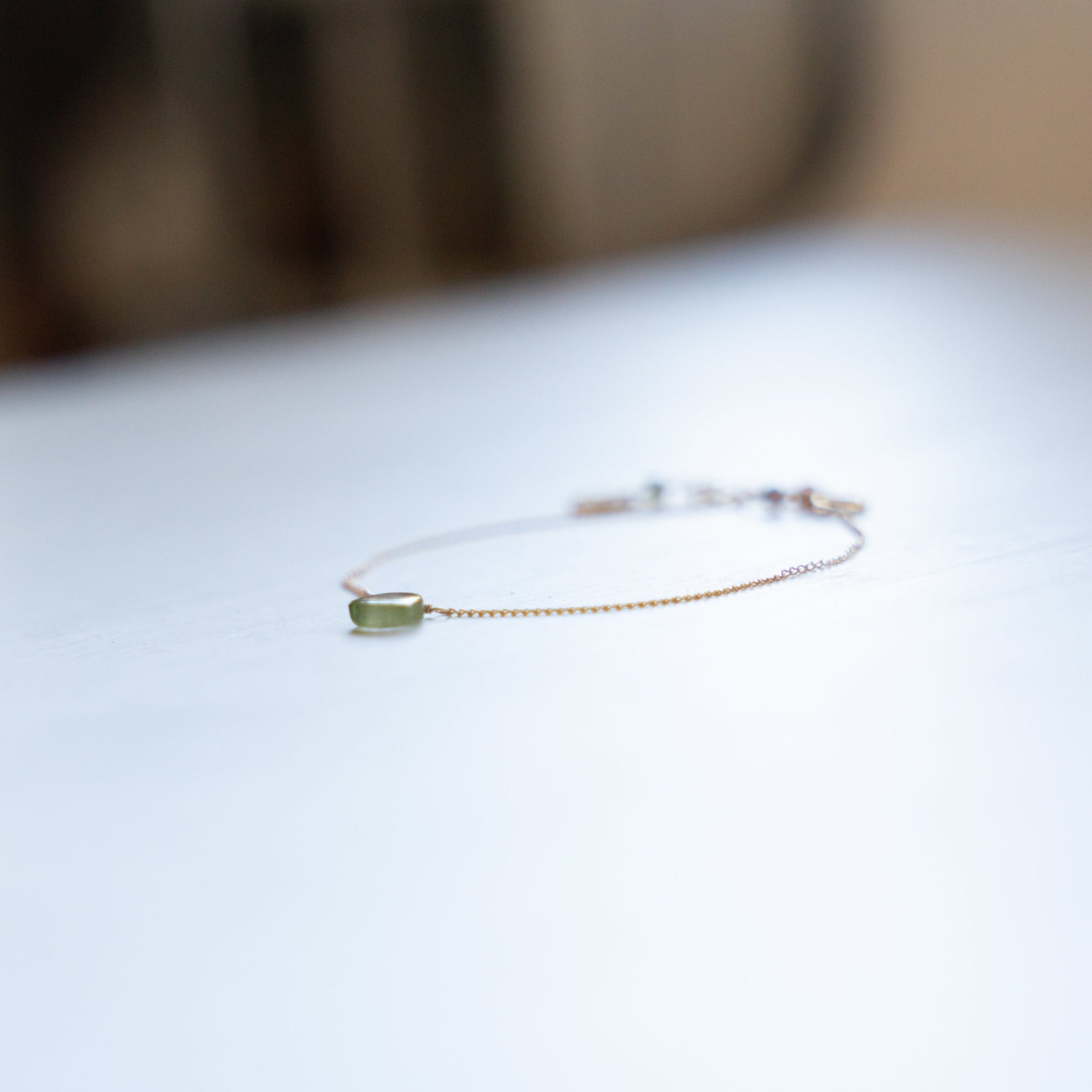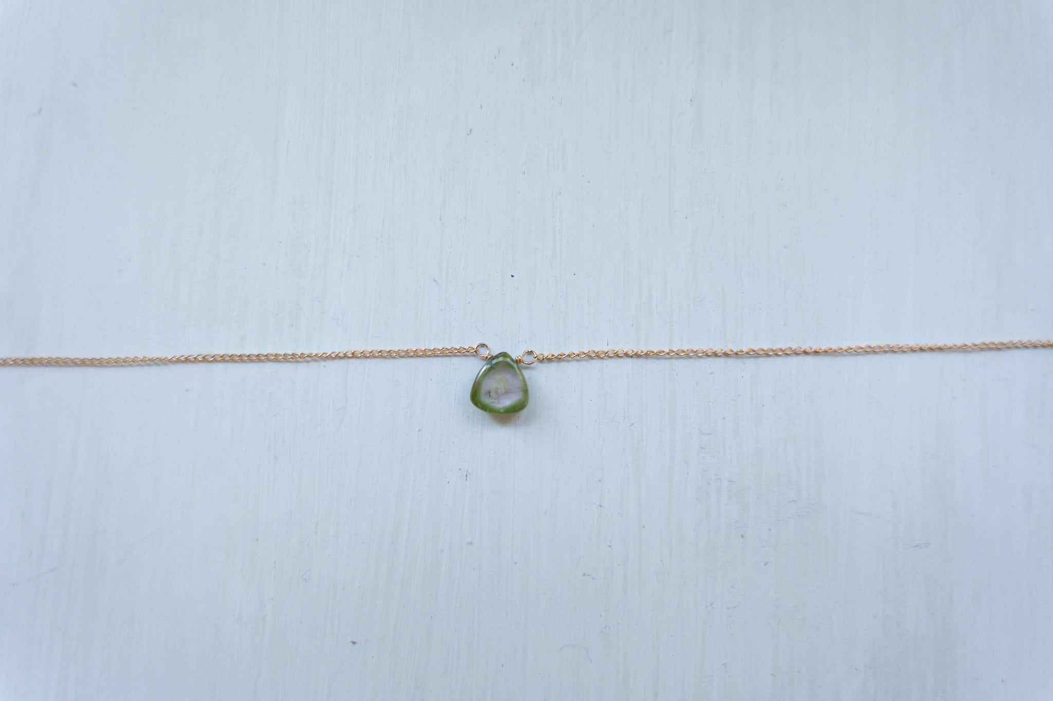 こちらのブレスレットには、『ウォーターメロントルマリン』を選びました。その名の通り「スイカ」のように外側が緑色、内側がピンク色になっている、とてもユニークなトルマリンです。