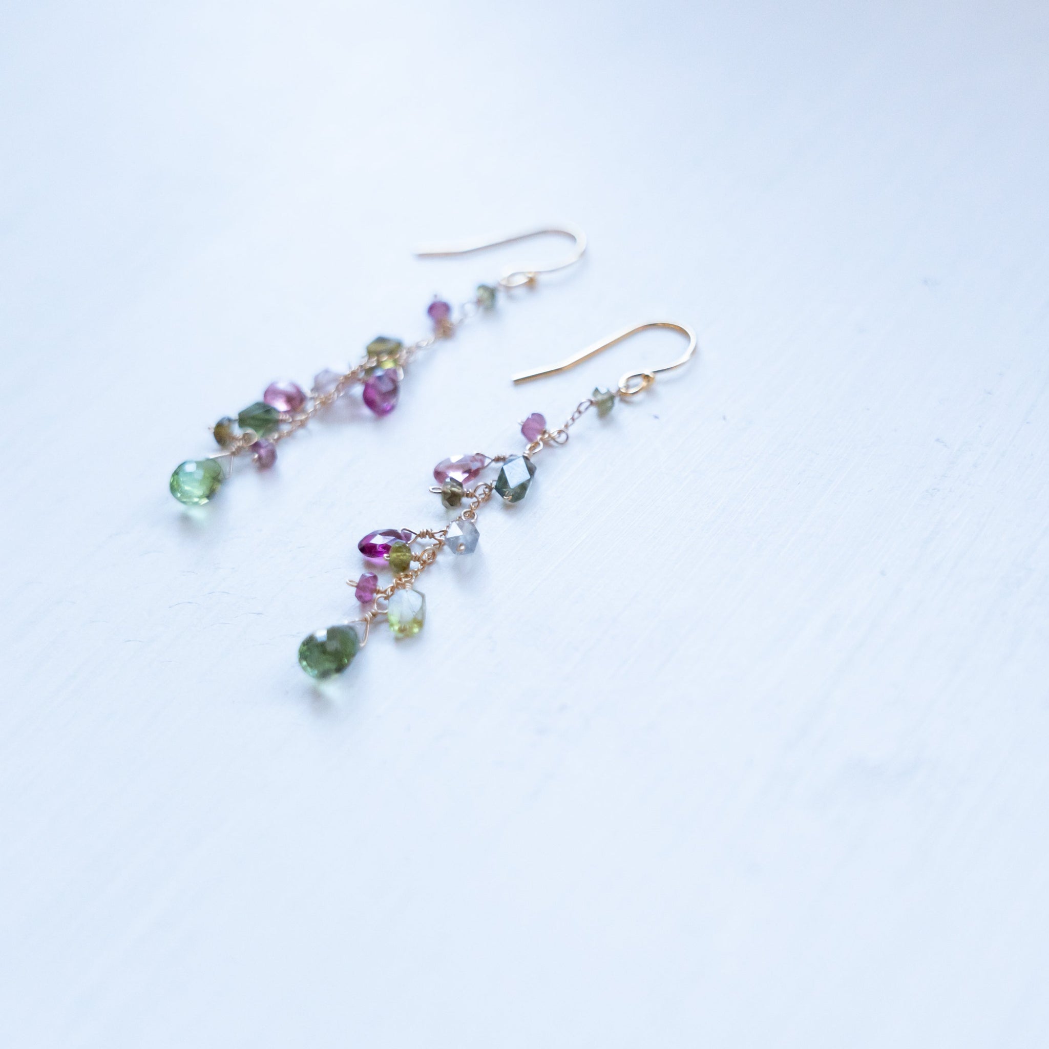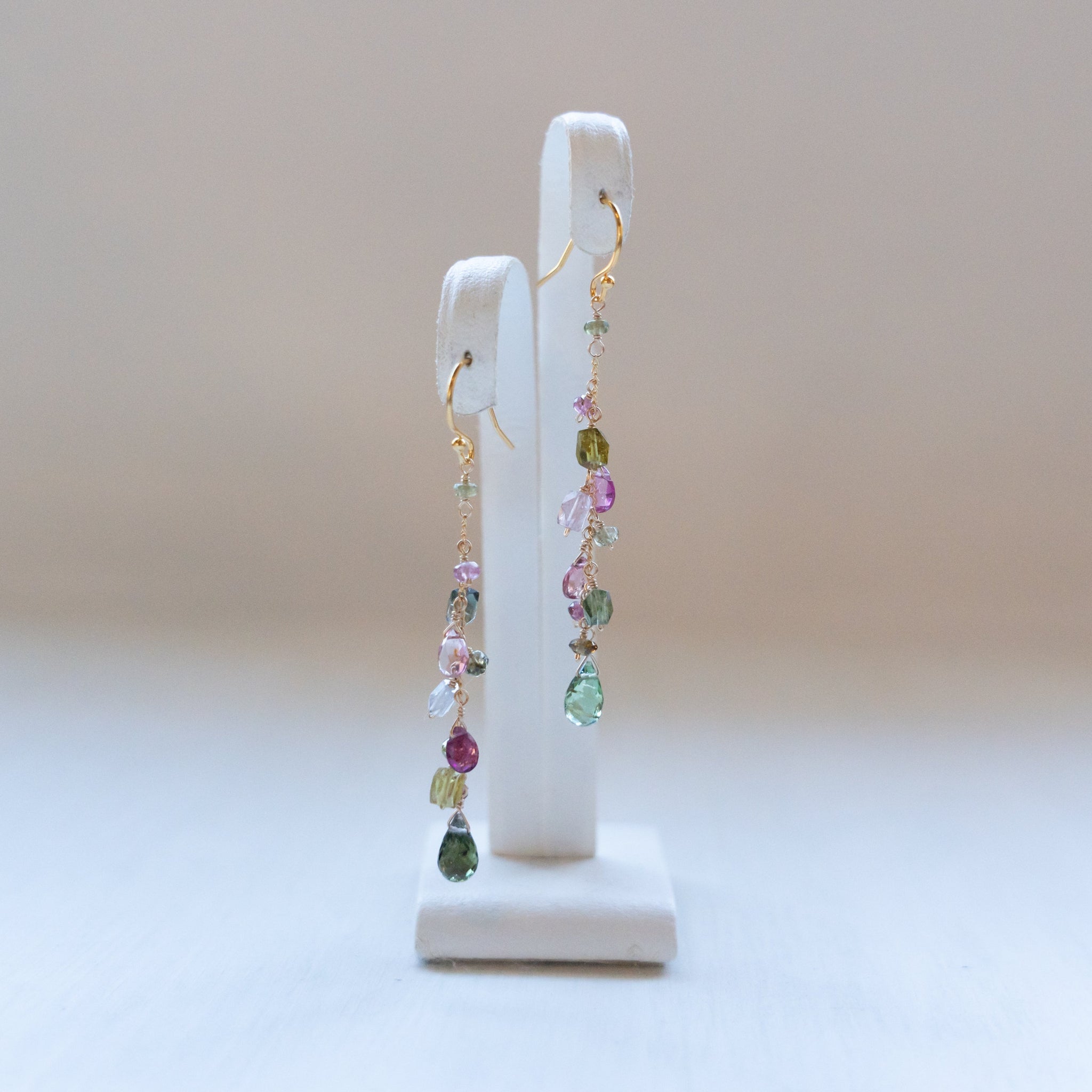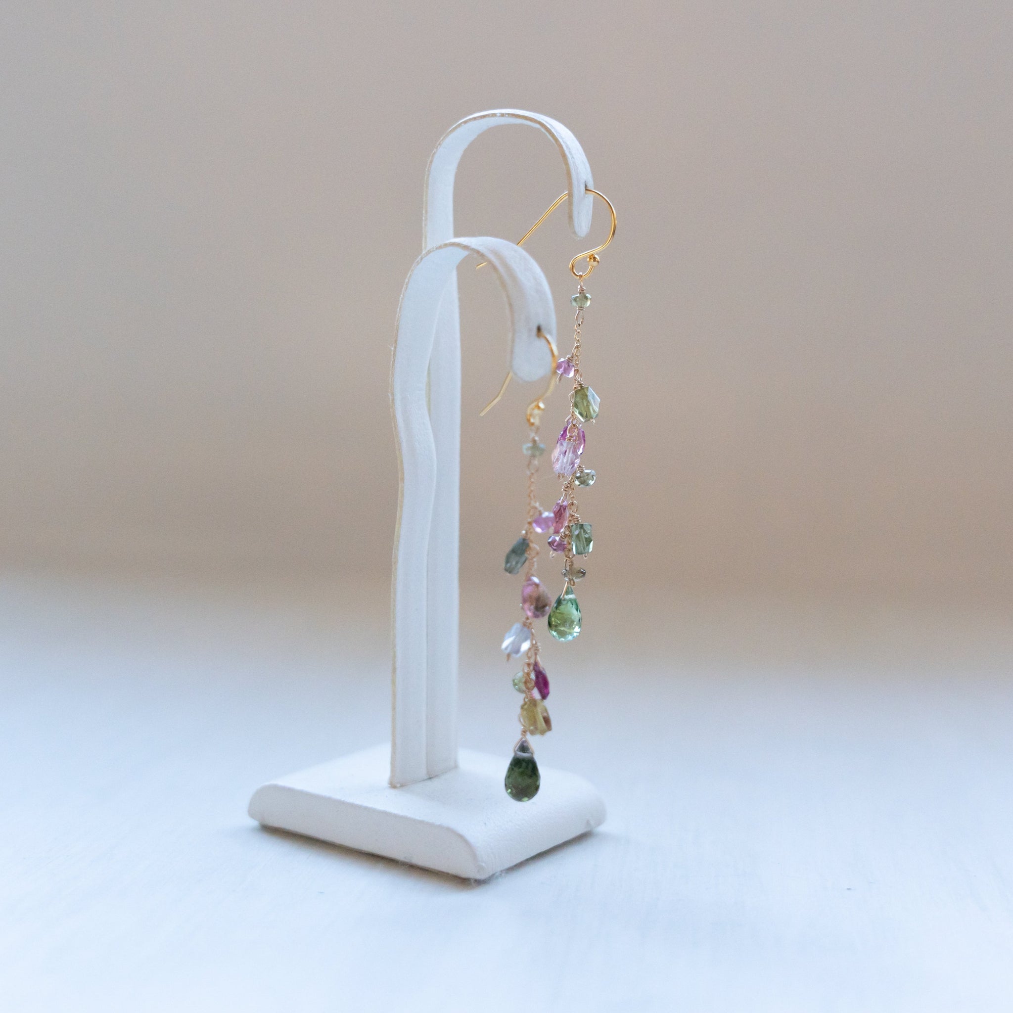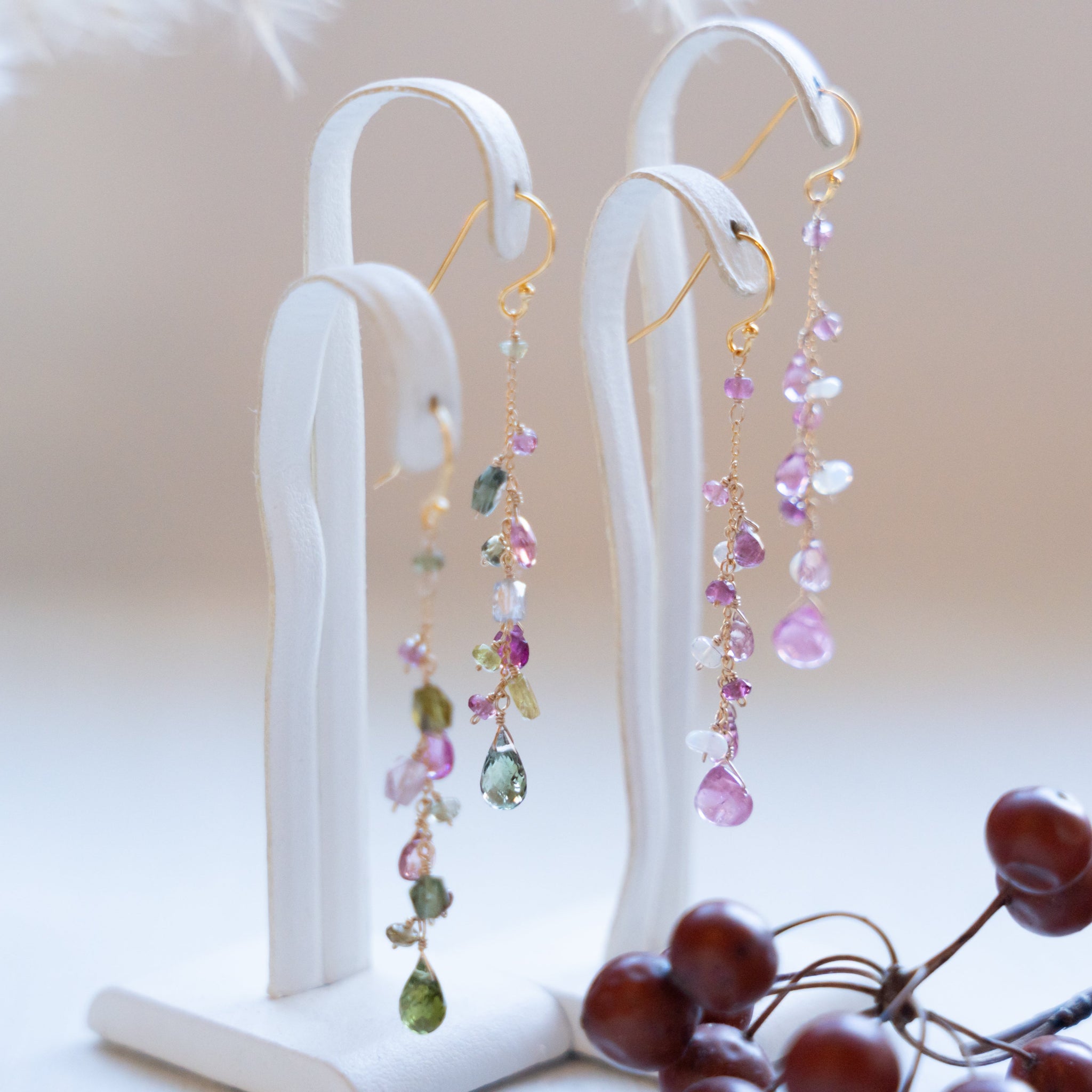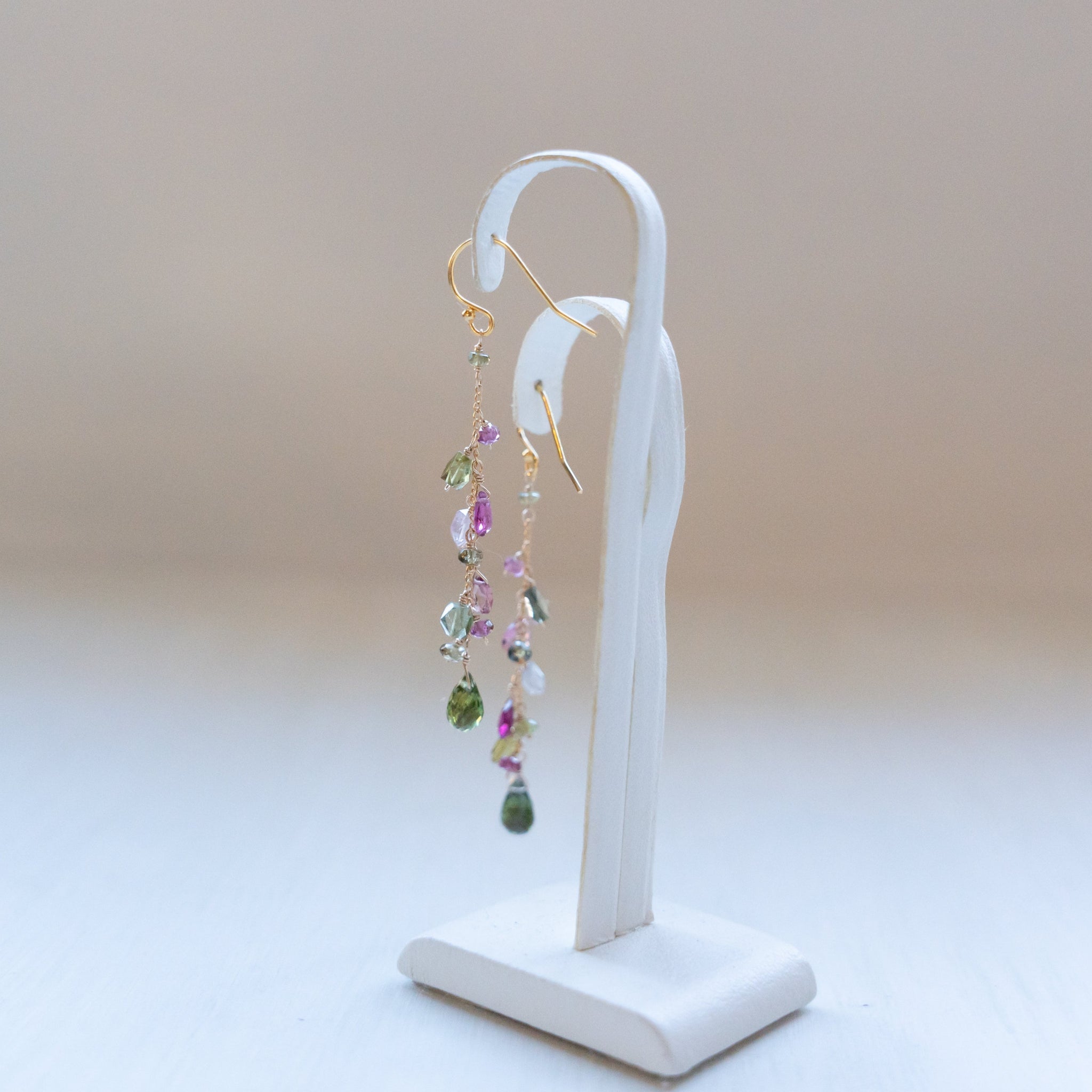 こちらのピアスには様々なカラーのトルマリンを選び、繋げました。グリーンや濃いピンクの組み合わせが秋らしいカラーに。シックで上品な仕上がりにしました。