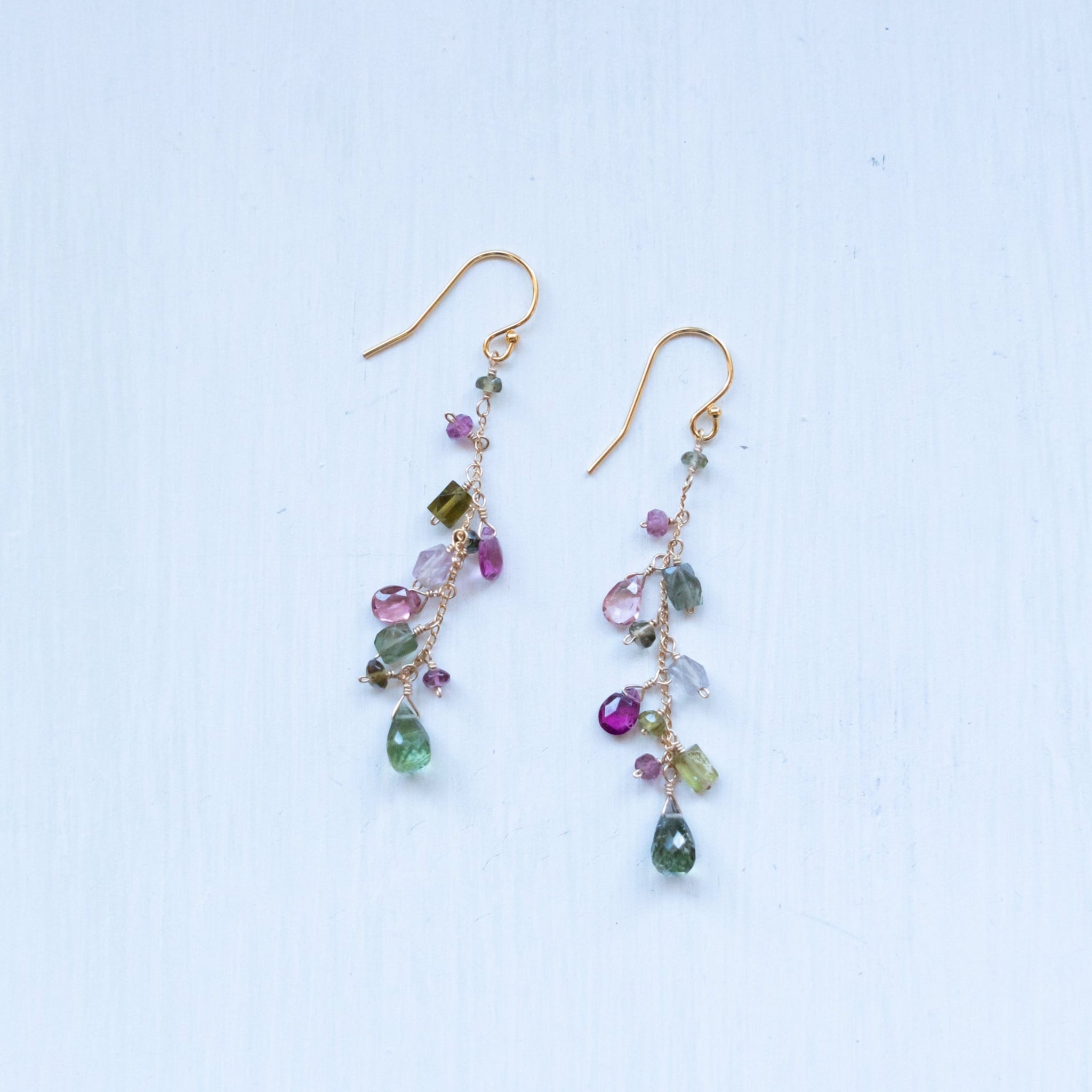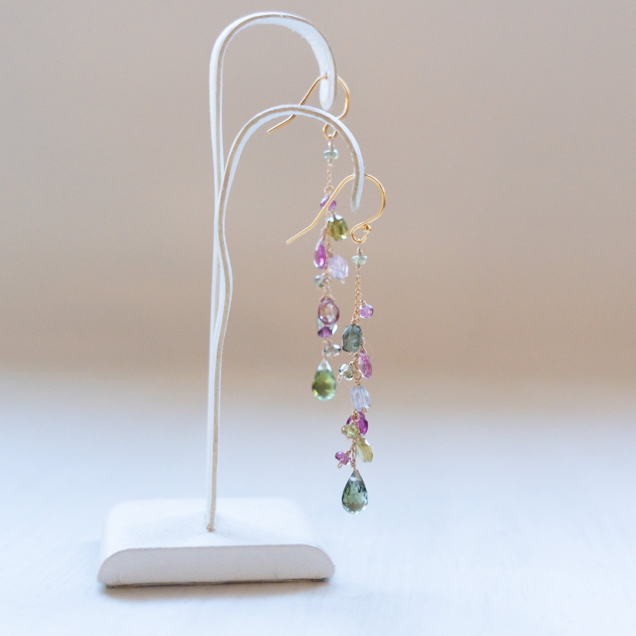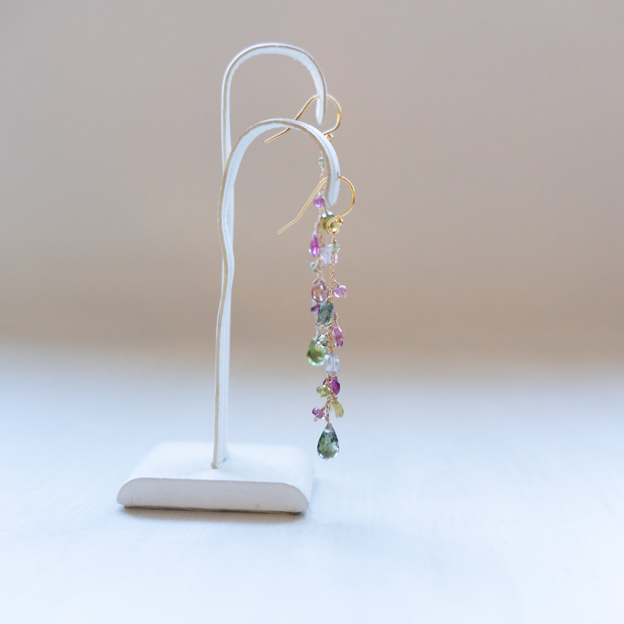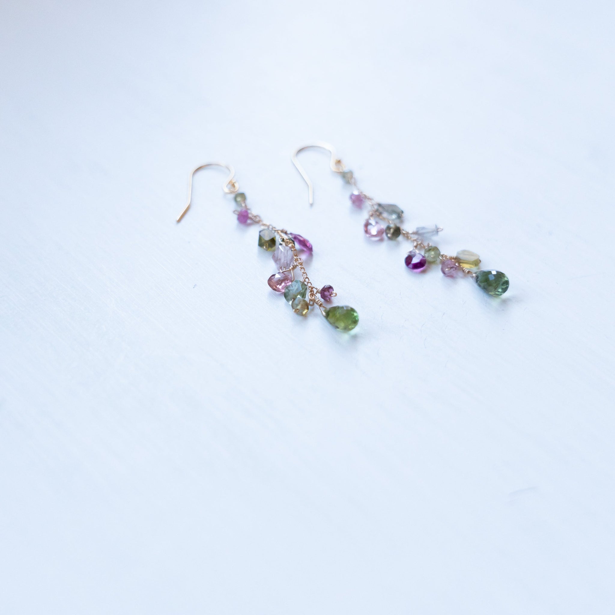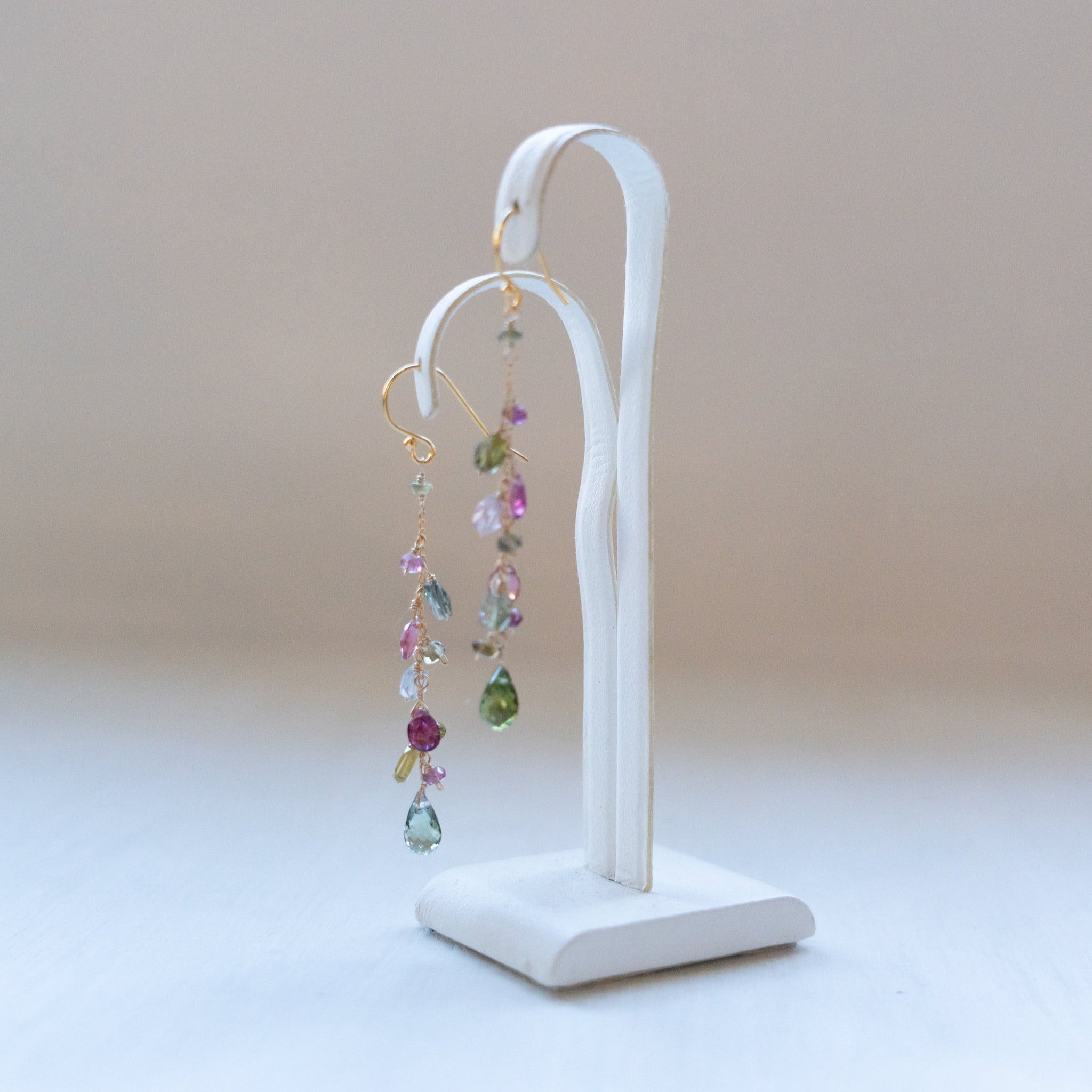 こちらのピアスには様々なカラーのトルマリンを選び、繋げました。グリーンや濃いピンクの組み合わせが秋らしいカラーに。シックで上品な仕上がりにしました。