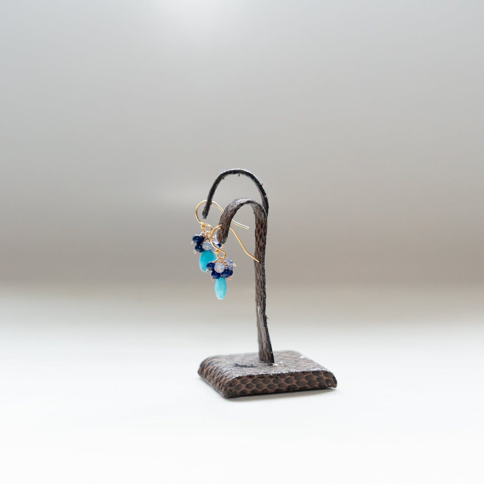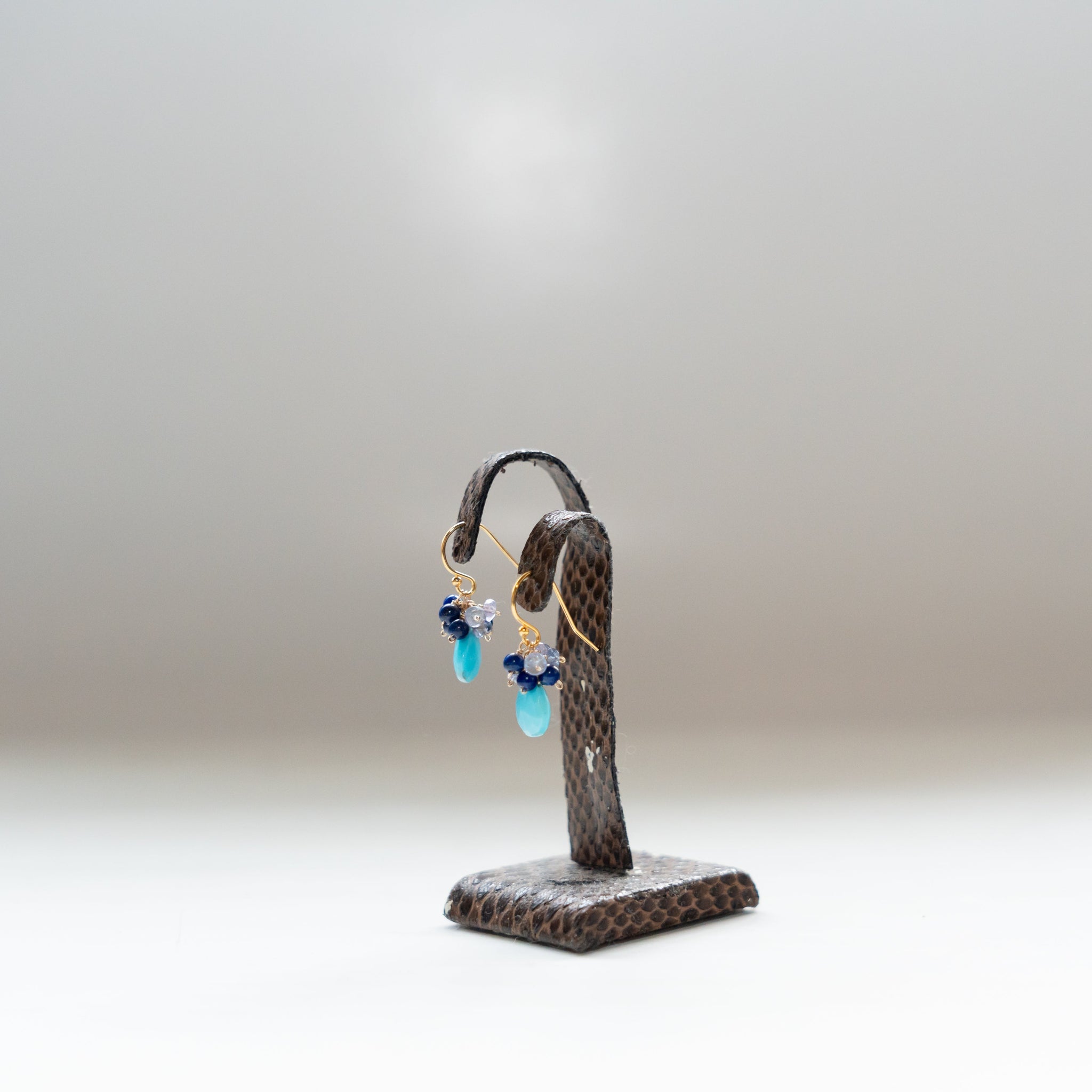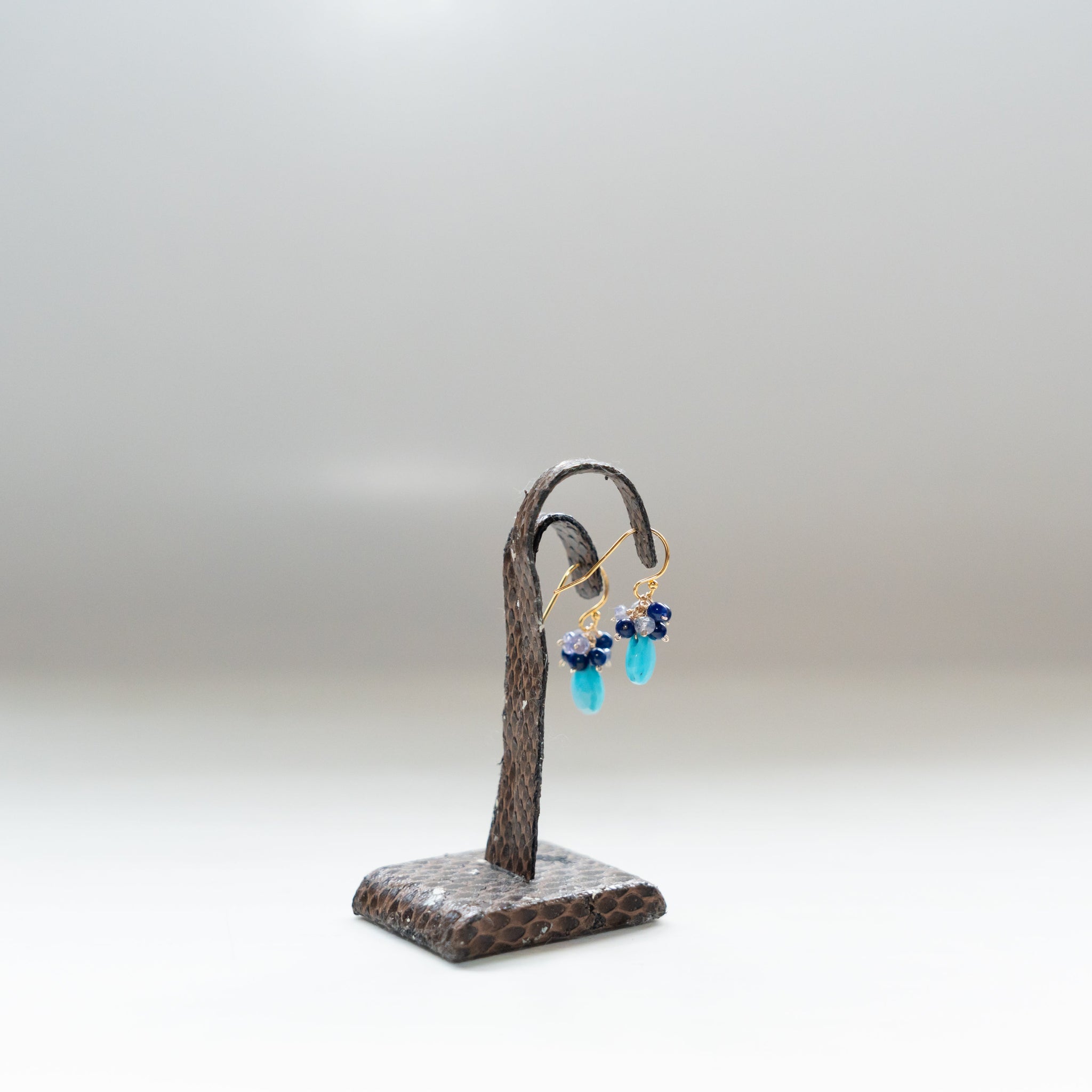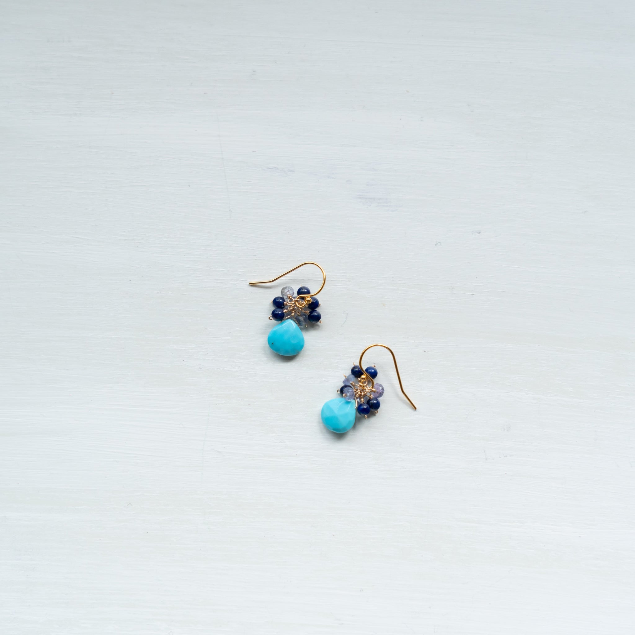 鮮やかなブルーのターコイズをメインに、深いブルーのラピスラズリと優しい色のタンザナイトを一粒ひとつぶ繋ぎ、華やかなブーケピアスに仕上げました。