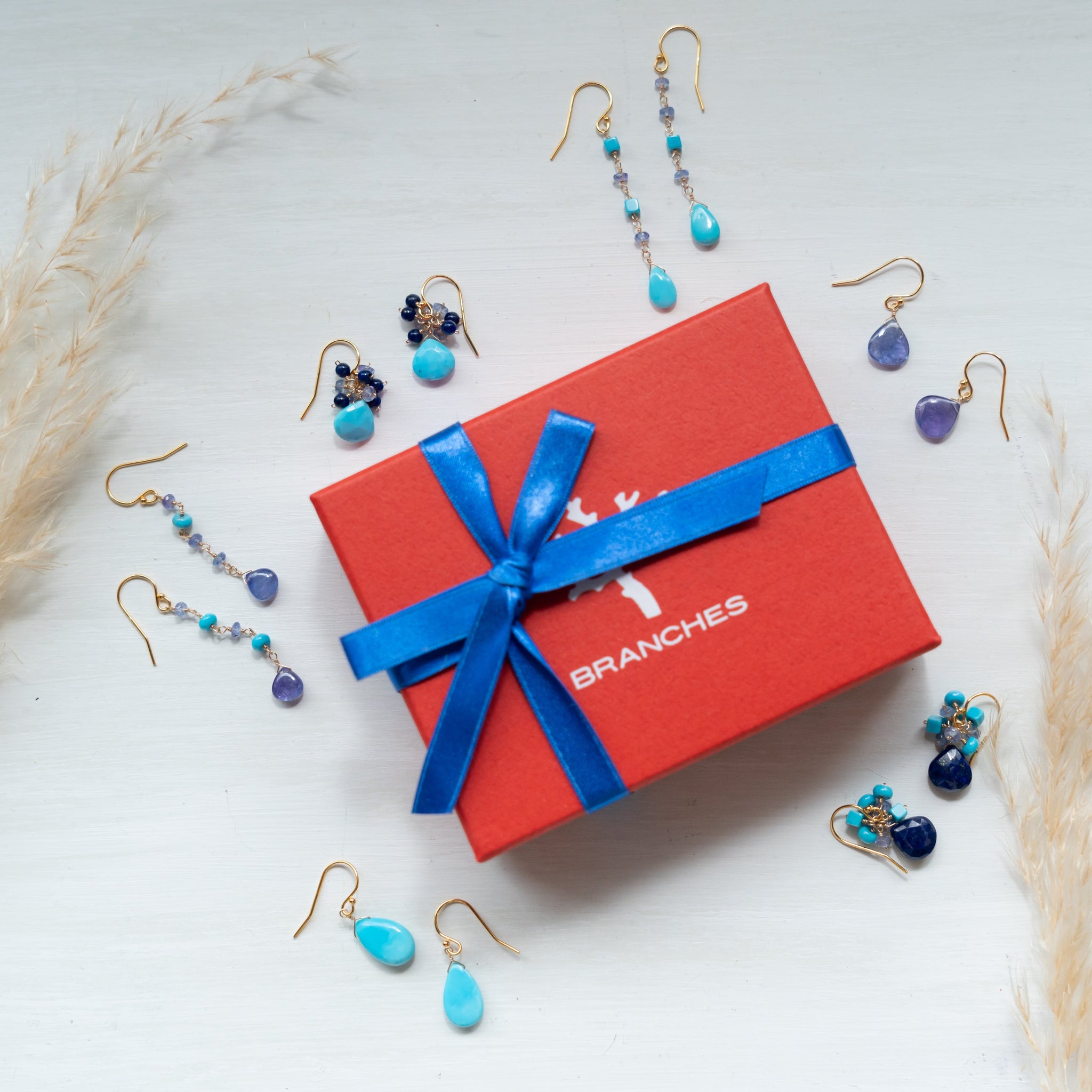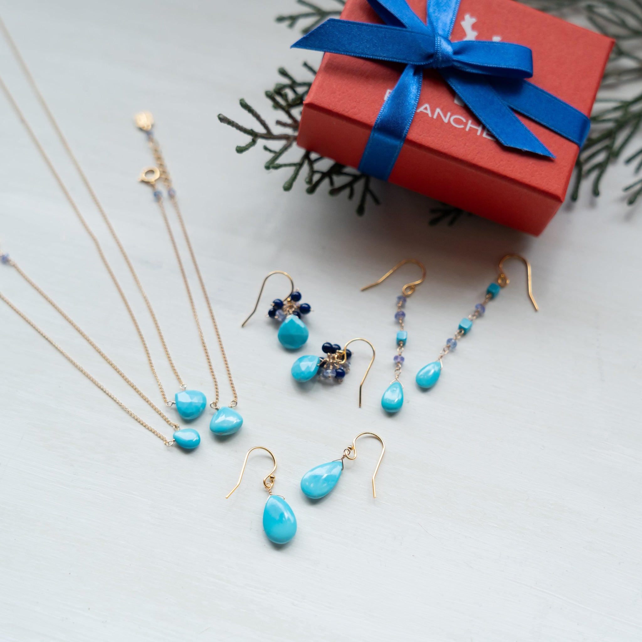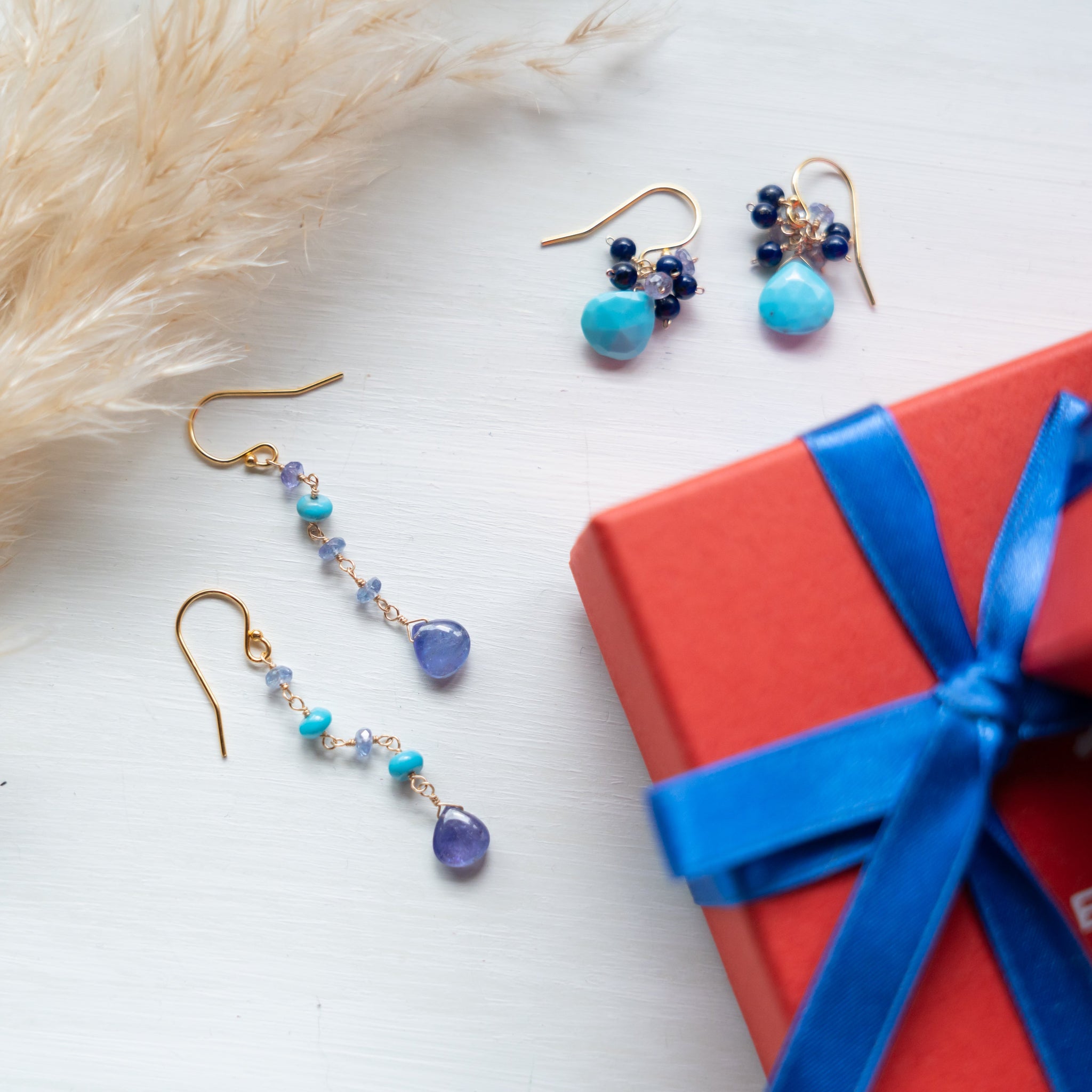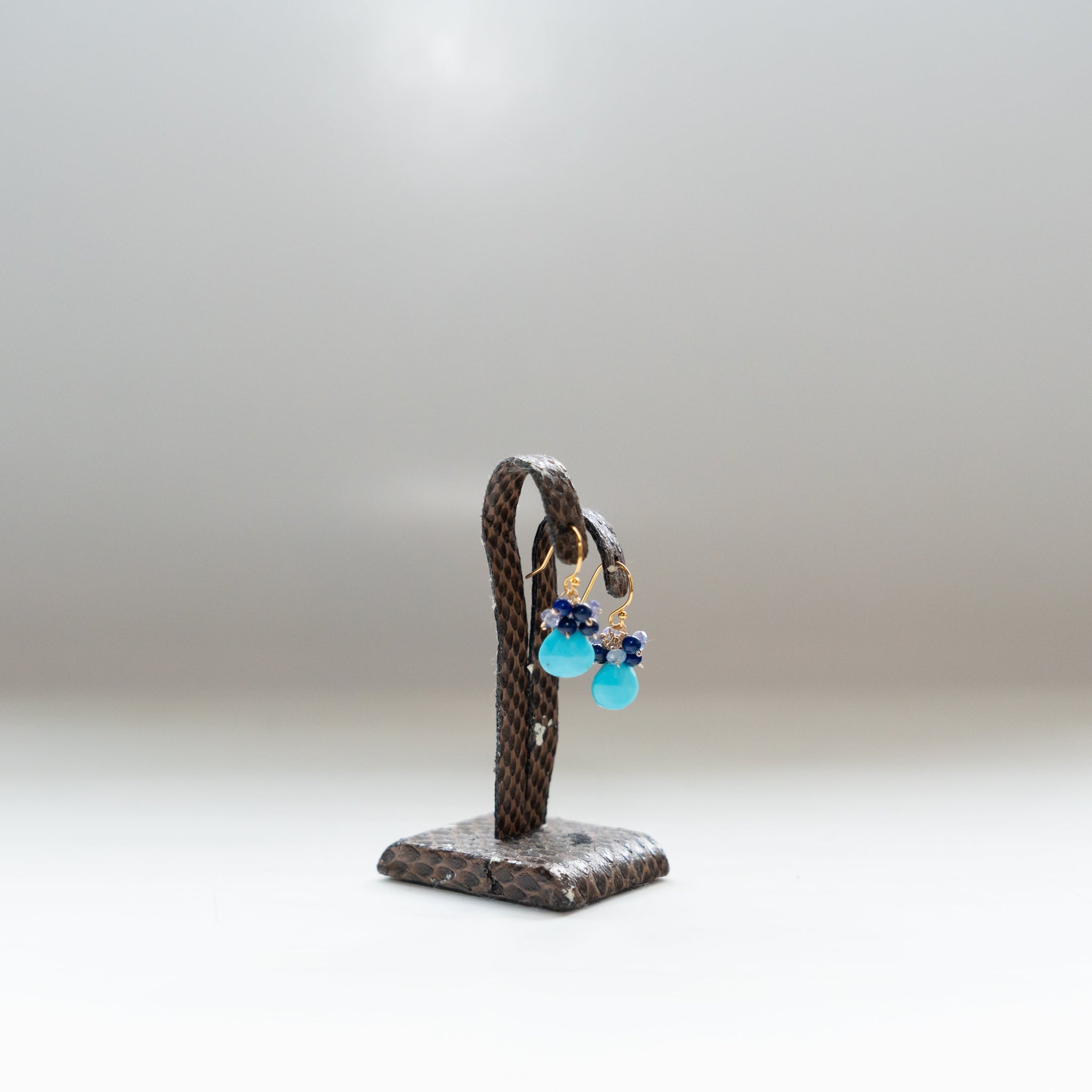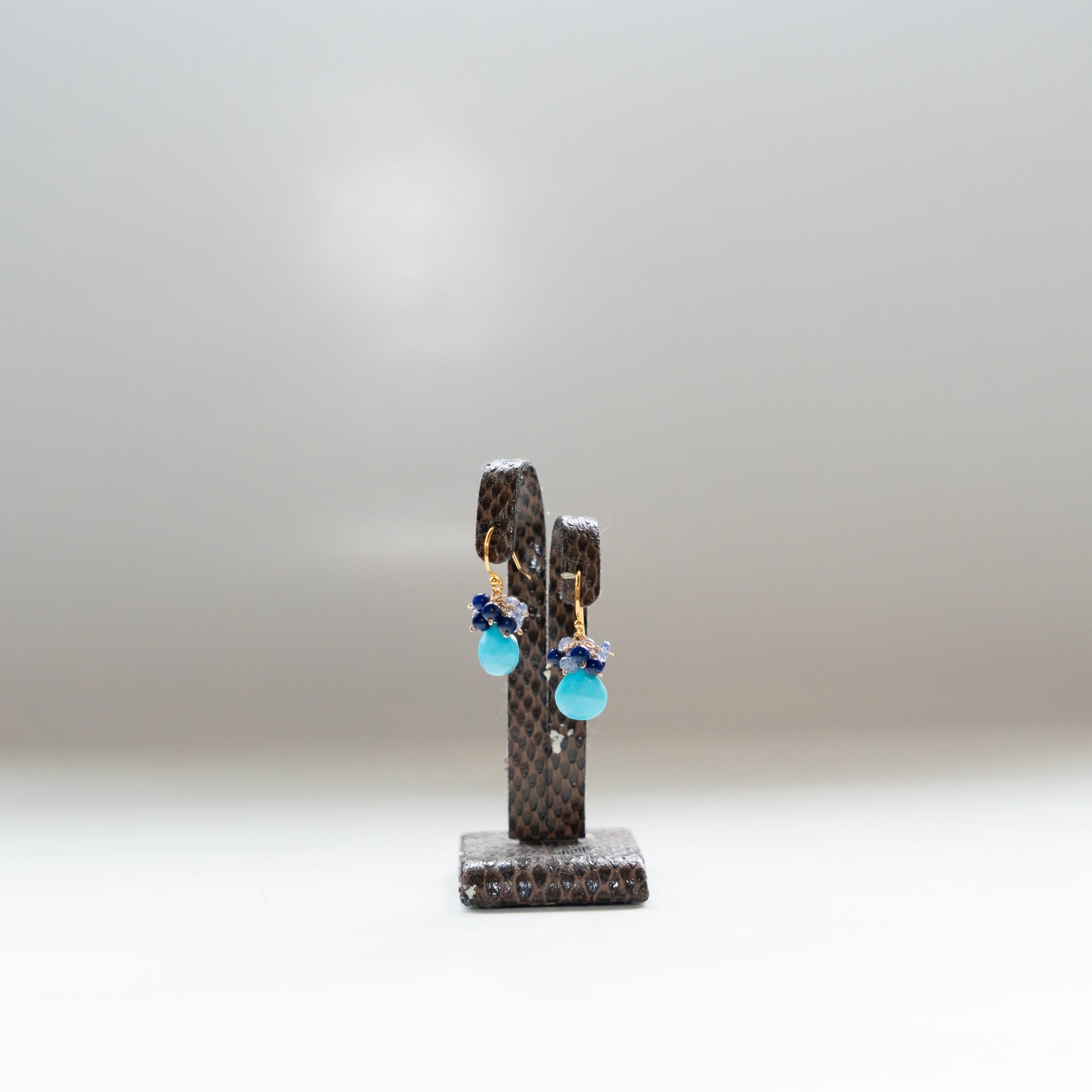鮮やかなブルーのターコイズをメインに、深いブルーのラピスラズリと優しい色のタンザナイトを一粒ひとつぶ繋ぎ、華やかなブーケピアスに仕上げました。