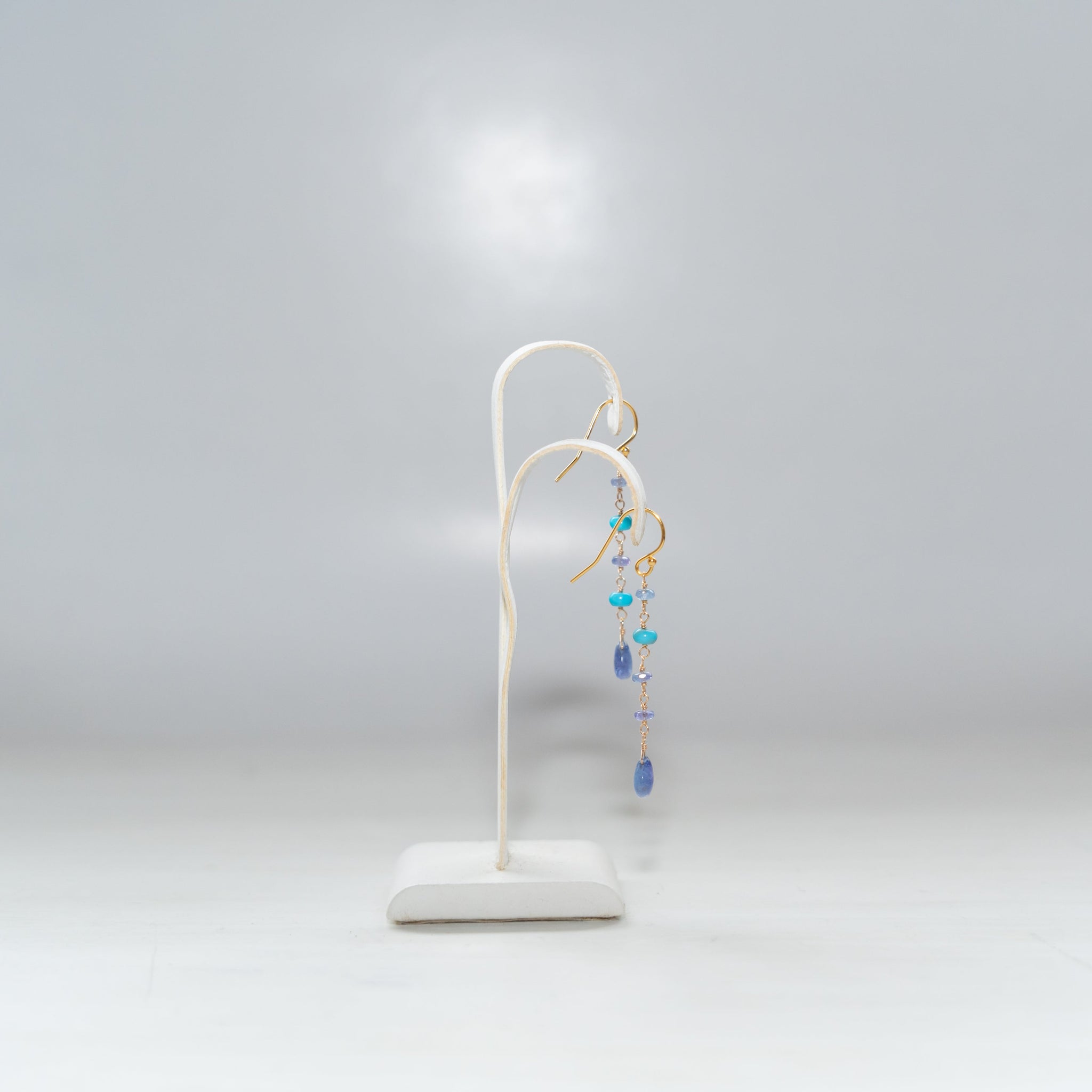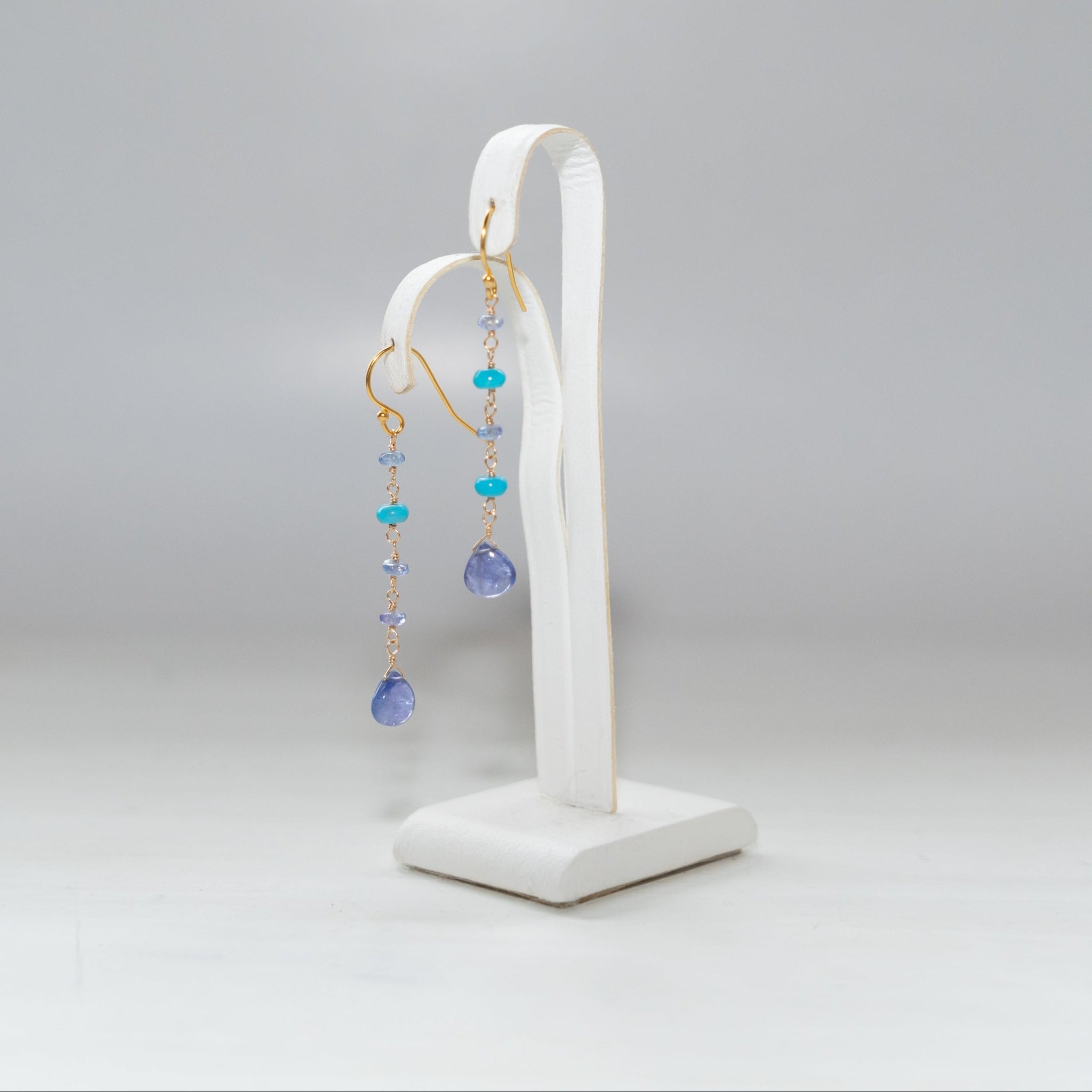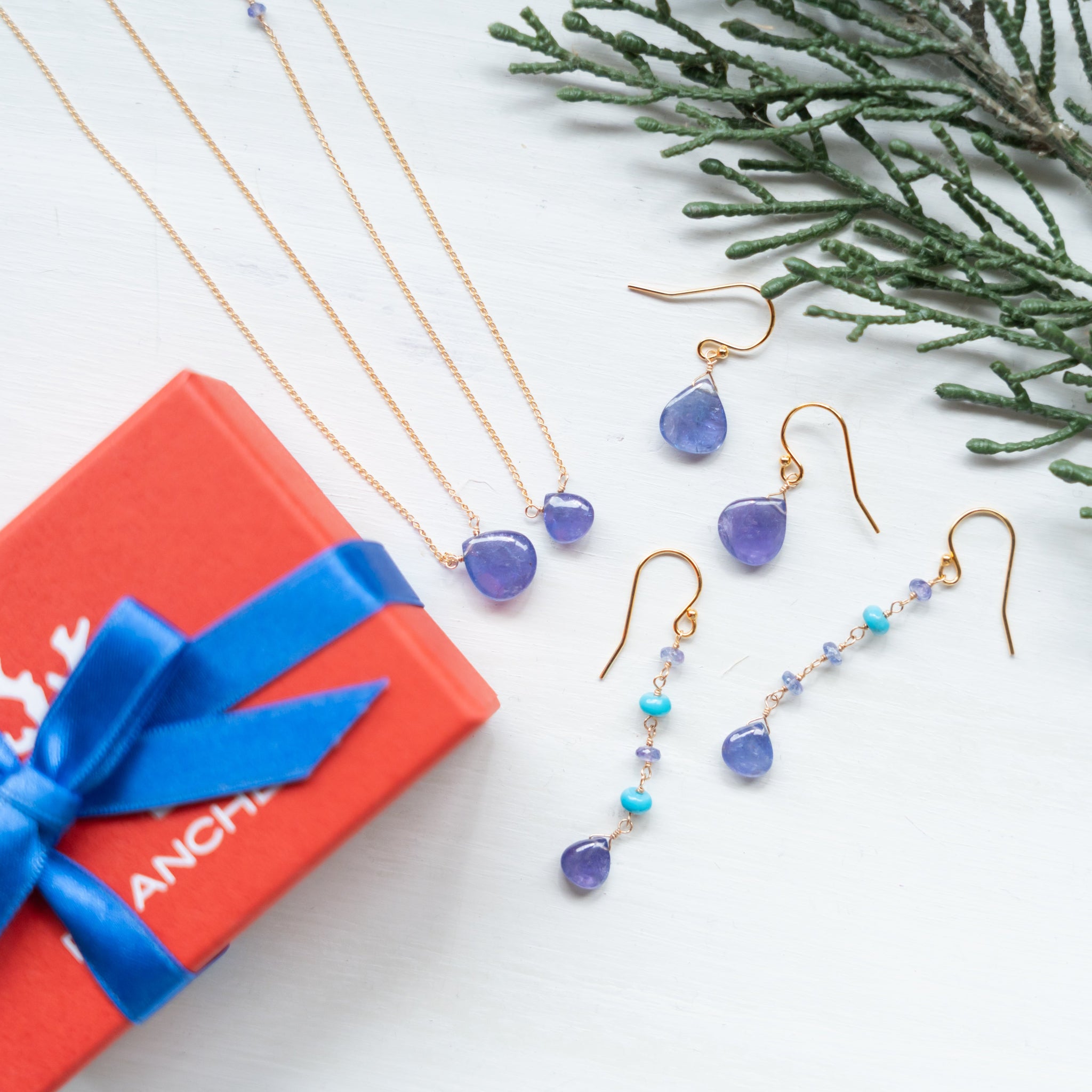 こちらのピアスは、つるんとしたペアシェイプのタンザナイトをメインに、同じく12月の誕生石のターコイズの小さな石を一つ一つ繋ぎました。神秘的なカラーを持つタンザナイトに鮮やかなブルーのターコイズの組み合わせが素敵です。