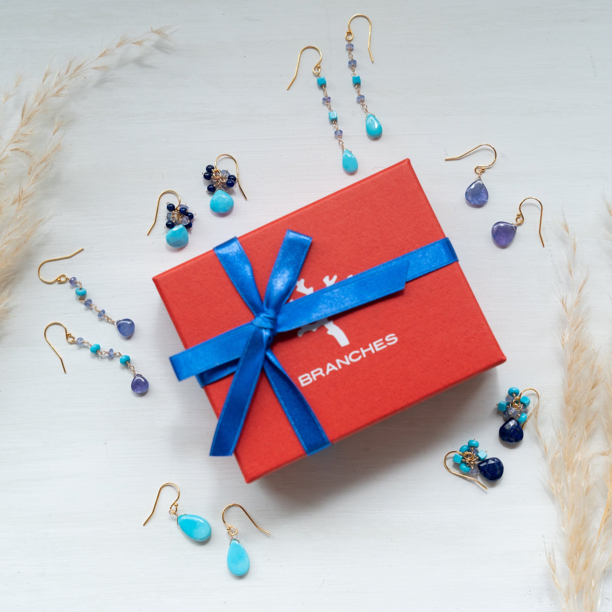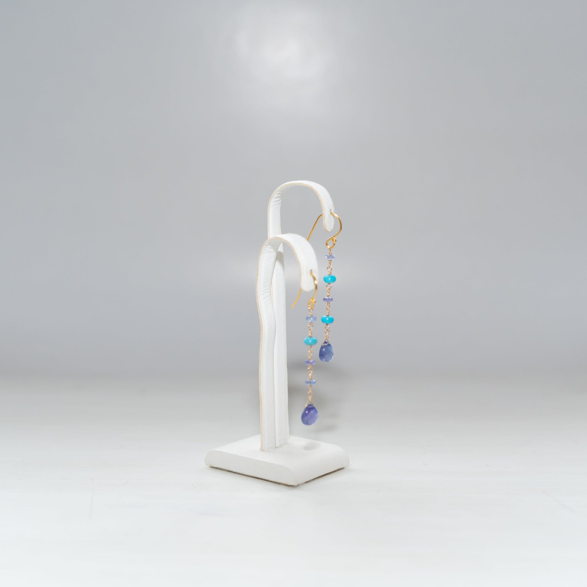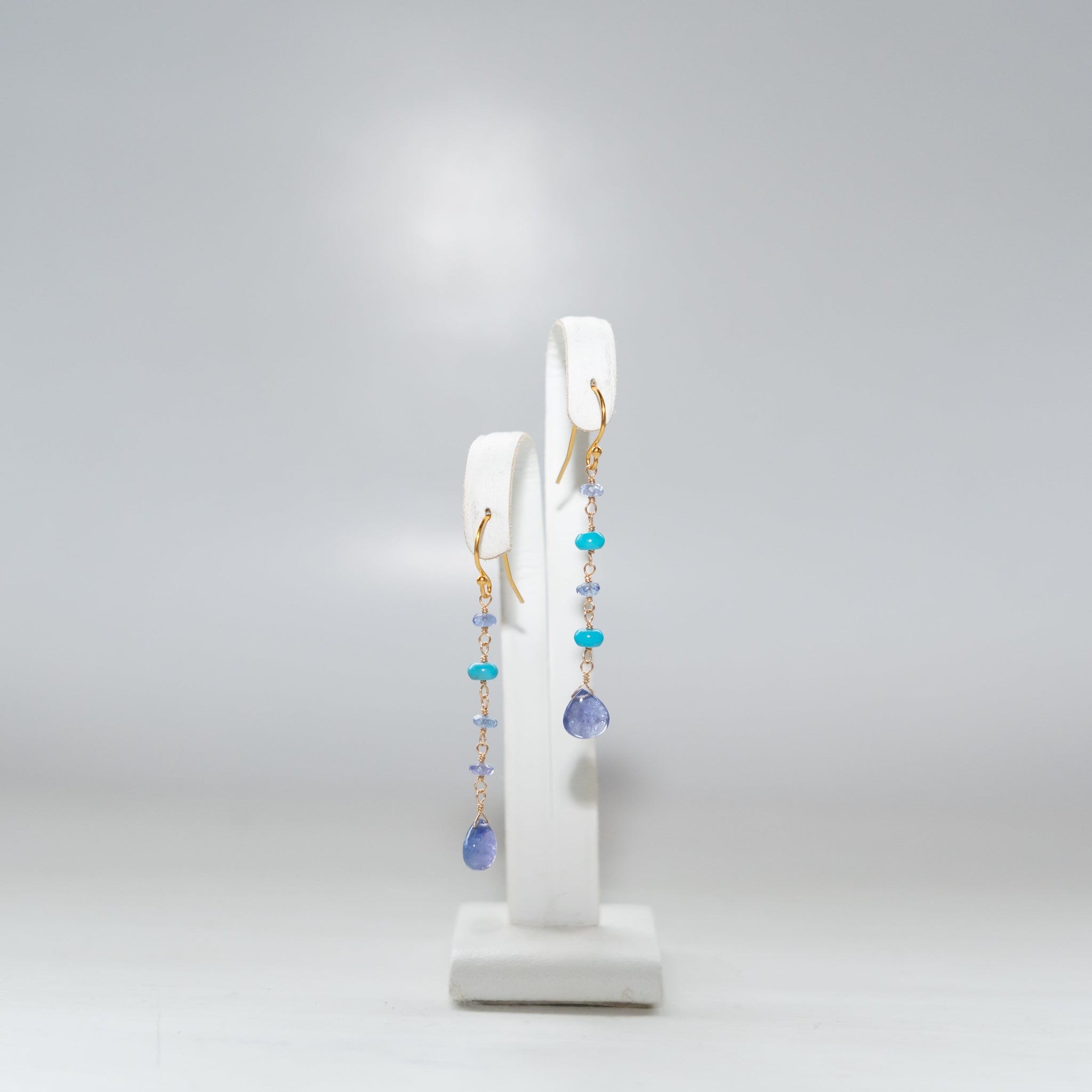 こちらのピアスは、つるんとしたペアシェイプのタンザナイトをメインに、同じく12月の誕生石のターコイズの小さな石を一つ一つ繋ぎました。神秘的なカラーを持つタンザナイトに鮮やかなブルーのターコイズの組み合わせが素敵です。